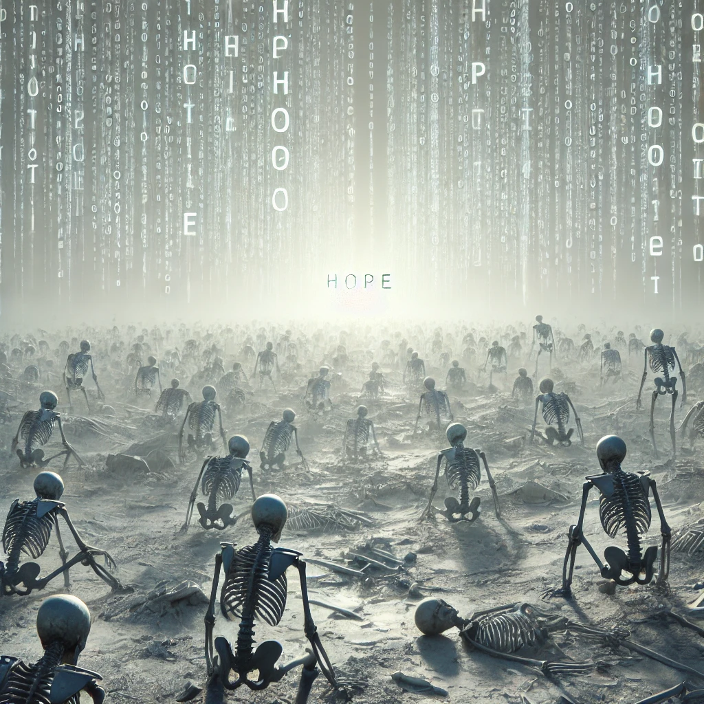 Conceptual and Creative Description “Human Protocol Terminated” closes one of the most critical segments of the Code of the Dead series. The piece depicts a gray battlefield, where skeletons are arranged like lines of computer code, standing in absolute silence. Above them, faint binary letters form the word “hope,” glowing briefly before fading into emptiness.The title functions as a final message from a system that has shut down its own humanity. Lisboa employs the sterile, geometric aesthetic of the digital realm to compose a visual requiem for empathy’s extinction, reflecting on the rise of machine logic replacing human compassion with automated commands.AI was used as both a technical instrument and a symbolic device, serving the artist’s conceptual control rather than leading the creative process. José Lisboa positions himself as a translator between code and emotion, turning computational language into poetic critique.“Human Protocol Terminated” speaks not only of the end of humanity but of the enduring human urge to reprogram hope, even within the silence of a terminated system.