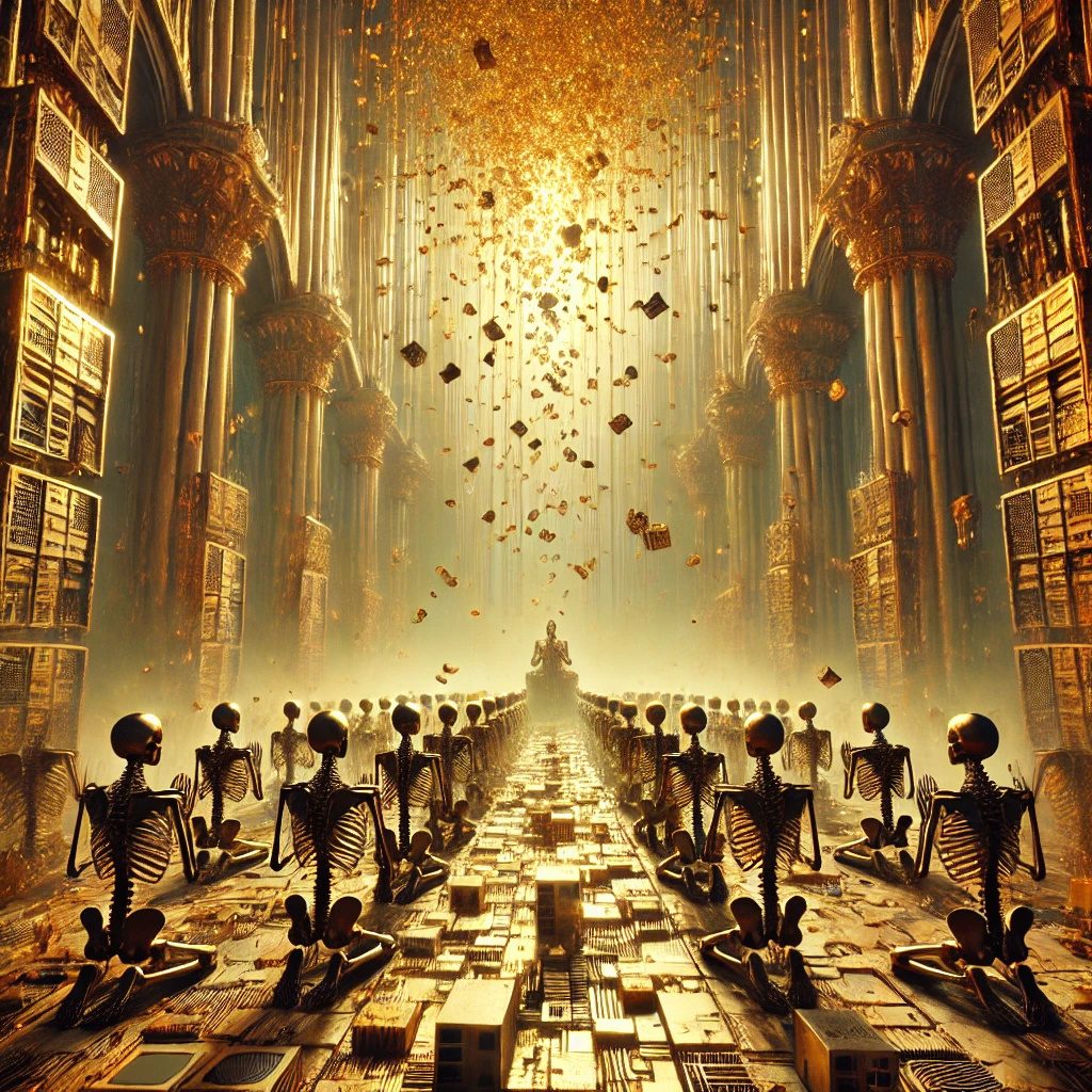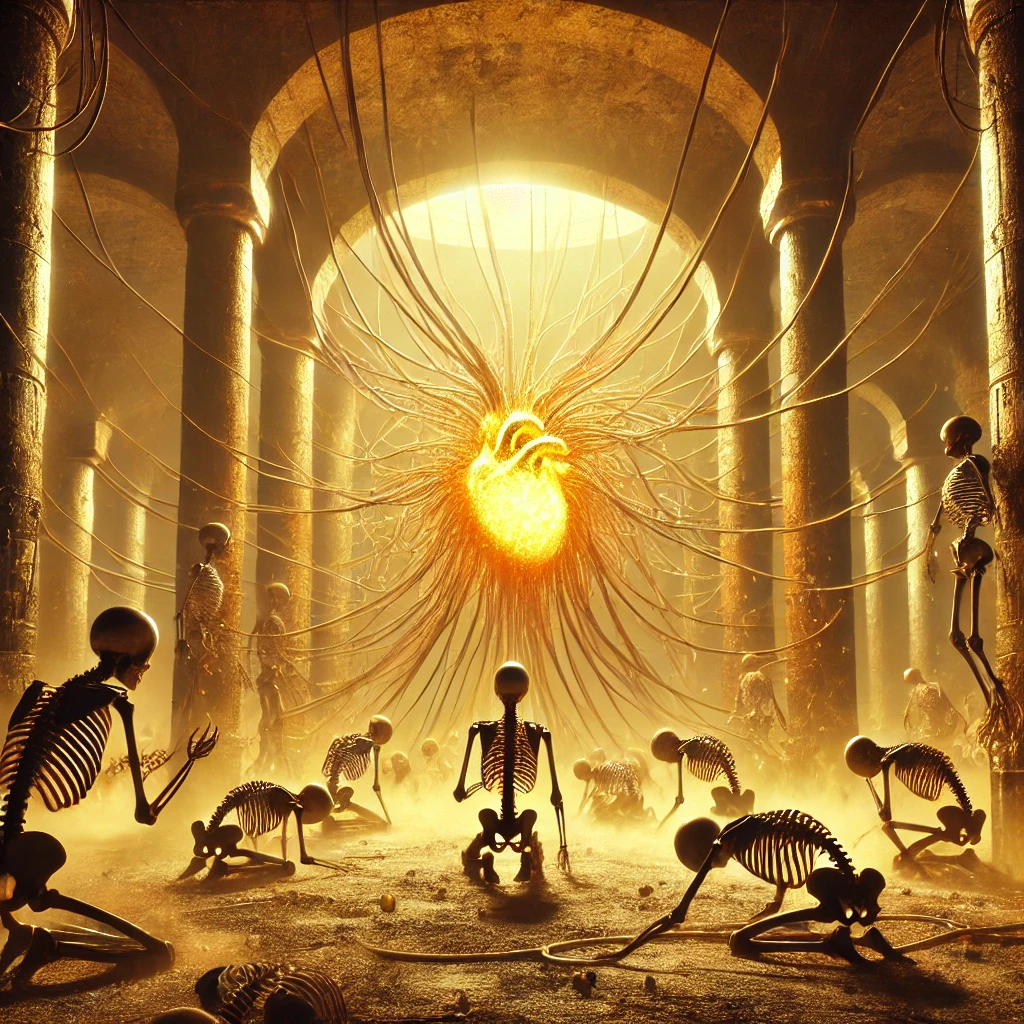 Conceptual and Creative Description “Server of Souls” forms the spiritual core of the Code of the Dead series. The artwork portrays a vast underground hall where skeletons are connected by cables to a pulsating machine shaped like a glowing heart. Some kneel in prayer, others attempt to disconnect, suspended between faith, dependence, and despair.Rendered in a gold-and-black palette, the scene contrasts the sacred and the digital, envisioning a new religion born from data. The “server” here is both a technological device and a metaphysical altar, where human souls become signals of devotion.The creative process drew on research into technognosis — the spiritualization of technology — exploring the thin boundary between transcendence and control. José Lisboa designed the entire conceptual and visual framework, using AI as a digital painting tool to materialize a human vision of post-human faith.“Server of Souls” asks an essential question: when the machine becomes the temple, what remains of the soul?