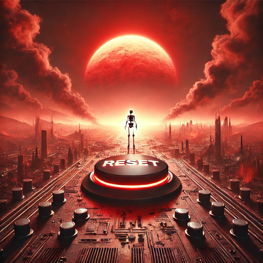 Título: Reset do MundoSérie: Código dos MortosArtista: José Lisboa (Brasil, 2025)Técnica: Arte digital surrealista gerada com IA (DALL·E + curadoria conceitual e direção humana)Formato: 1:1, tons vermelhos e cinzentos, iluminação difusa e fumaça simbólica, atmosfera de fim e recomeço1 Reset do Mundo (CodeOfTheDead_ResetOfTheWorld_JoseLisboa_2025.png)
