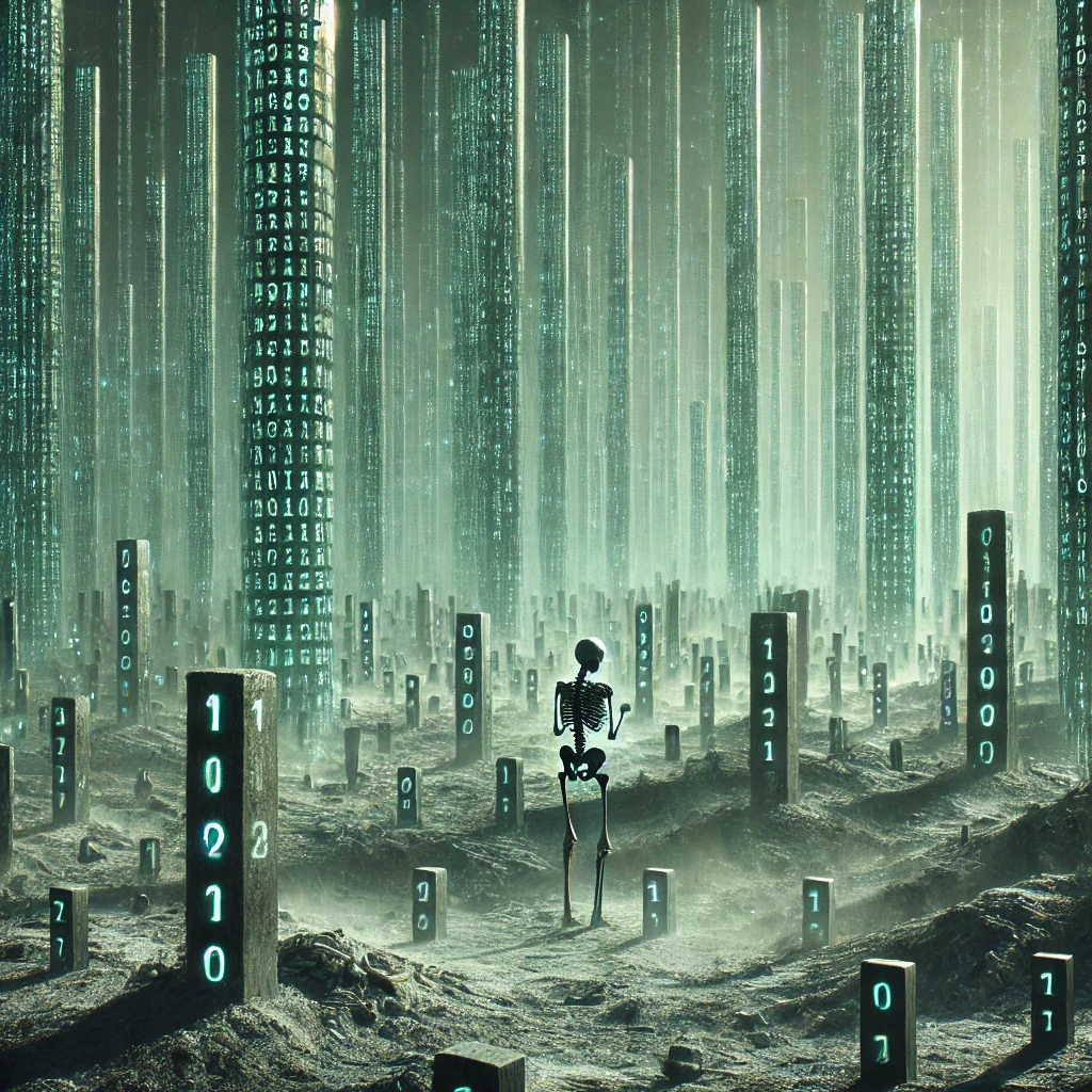 Conceptual and Creative Description “Checksum of Lost Lives” stands as one of the most introspective and somber works in the Code of the Dead series. The scene reveals a barren wasteland punctuated by vertical columns of binary light, each beam representing a digital gravestone. Among them, a solitary skeleton counts the endless digits, realizing that the total can never be completed.The term “checksum,” taken from programming language, refers to data integrity verification, here reimagined as a metaphor for the moral integrity of humankind. The artist transforms code into a mourning ritual, where every bit becomes a remembrance.José Lisboa employs AI not as an autonomous creator but as a tool of visual reflection, exploring the tension between memory and error. The cold green-gray palette symbolizes an in-between state, between life and void, between record and oblivion.“Checksum of Lost Lives” is a meditation on what remains after everything fades — a digital and poetic memorial to lives that could not be saved, yet will not be forgotten.