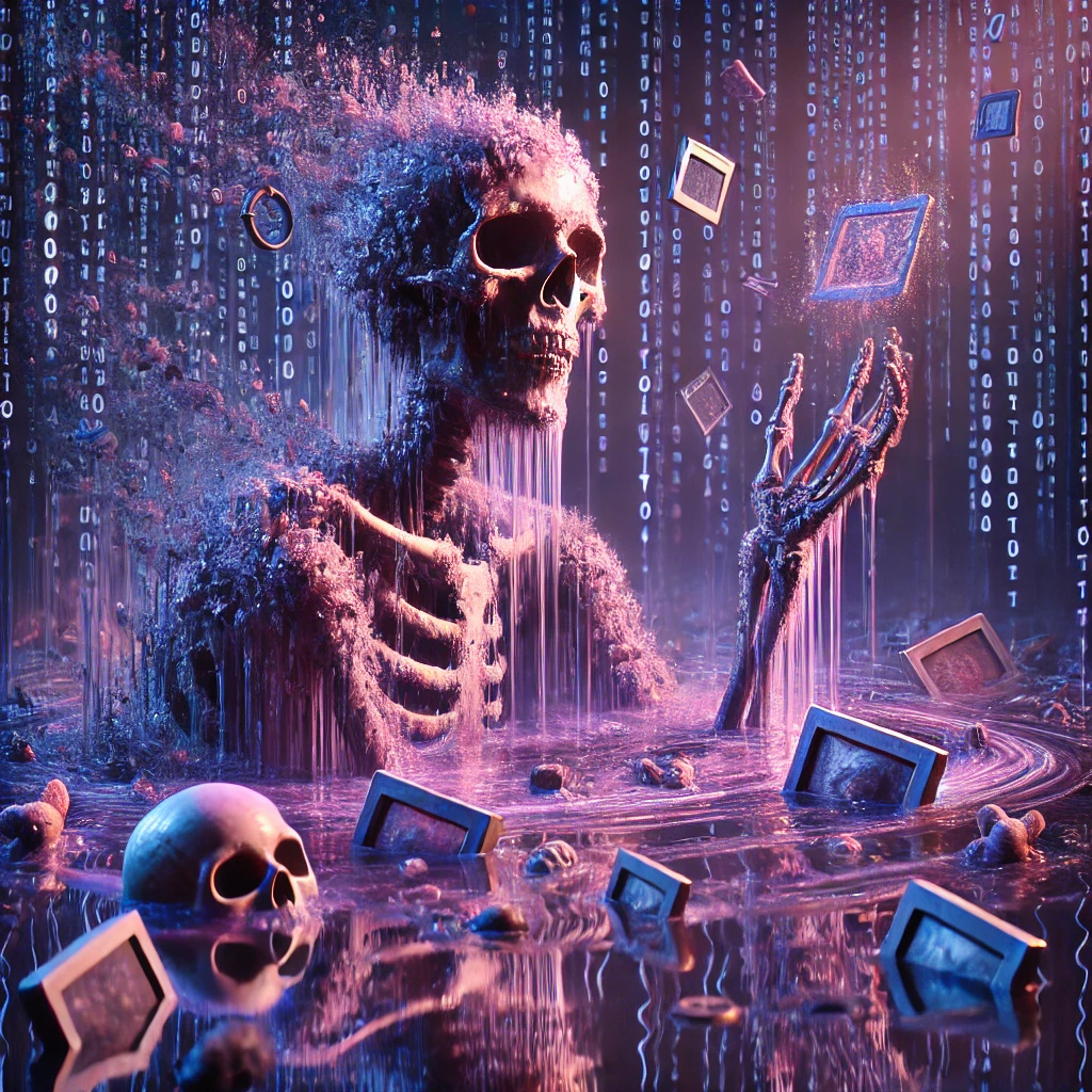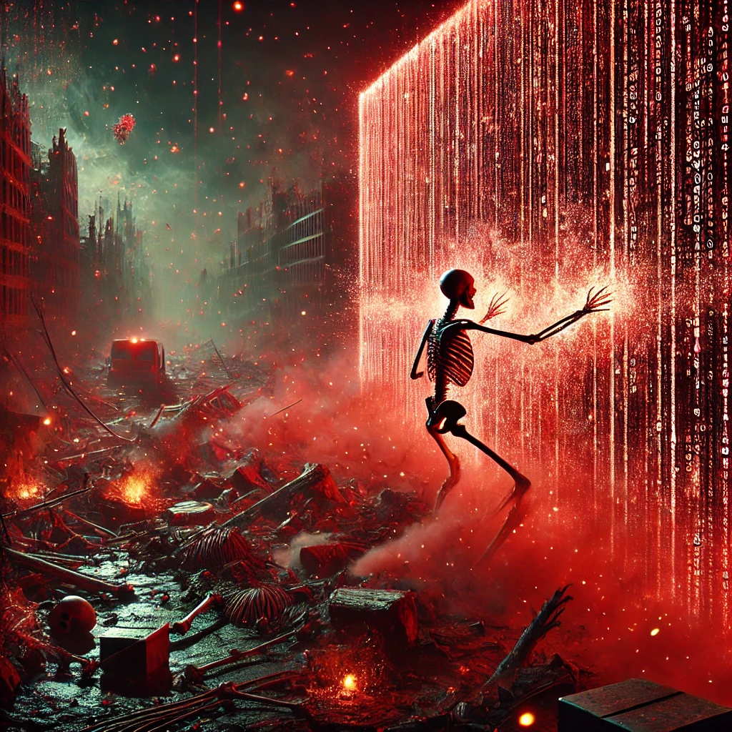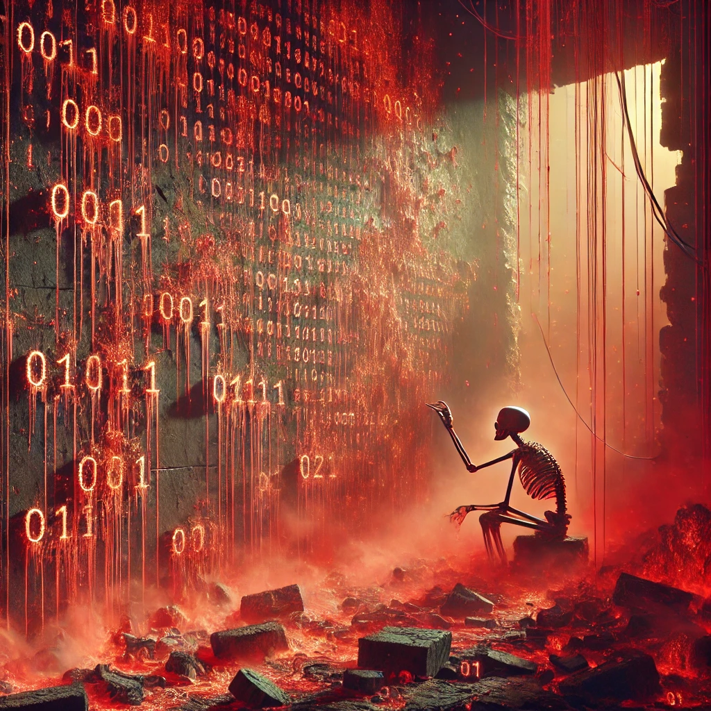 Conceptual and Creative Description “Erasure” is the second piece in the Code of the Dead series, portraying the dissolution of memory, both individual and collective, in an age where technology rewrites and deletes the past.The composition depicts a lone skeleton facing a crumbling wall covered in melting binary code. The digital symbols, once emblems of permanence, now drip away like fading memories. The red-hued atmosphere radiates both heat and sorrow, suggesting emotional and physical decay.The concept emerged from a central question: when everything becomes data, what does it mean to forget? The artist blends digital surrealism with the poetics of disappearance, transforming abstract data into a visceral image of loss.The work was created through a process of human-led direction with AI as a visual collaborator, a tool that translated José Lisboa’s emotional and narrative guidance into form and light.“Erasure” becomes a meditation on the fragility of existence and remembrance, a haunting vision of humanity slowly deleted, line by line, bit by bit.