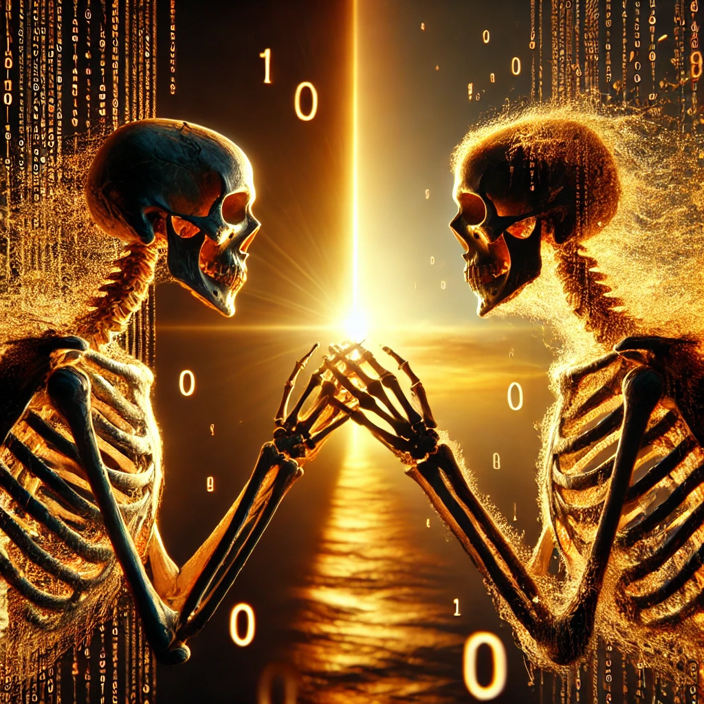 Conceptual and Creative Description “Reboot of Humanity” is the poetic and redemptive closure of the Code of the Dead series. After fifteen chapters of destruction, silence, and remembrance, this piece proposes a symbolic rebirth, not technological, but spiritual.The scene shows two skeletons touching hands in the dark, and at the point of contact, a golden spark of binary light forms the word “PEACE.” Behind them, the infinite blackness begins to shift into dawn, suggesting that the digital death cycle can be broken through empathy and awareness.The core concept is human reconnection through the language of machines. The same code that once caused collapse becomes a bridge for reconciliation. José Lisboa created the work as a visual prayer for the rebirth of humanity, using AI as an expressive tool fully directed by human intuition and emotion.“Reboot of Humanity” depicts the moment when data becomes soul, the instant when the digital learns to feel again. It stands as both the conclusion and transcendence of the series: even within a corrupted system, light remains, and the ultimate reboot is the awakening of empathy.