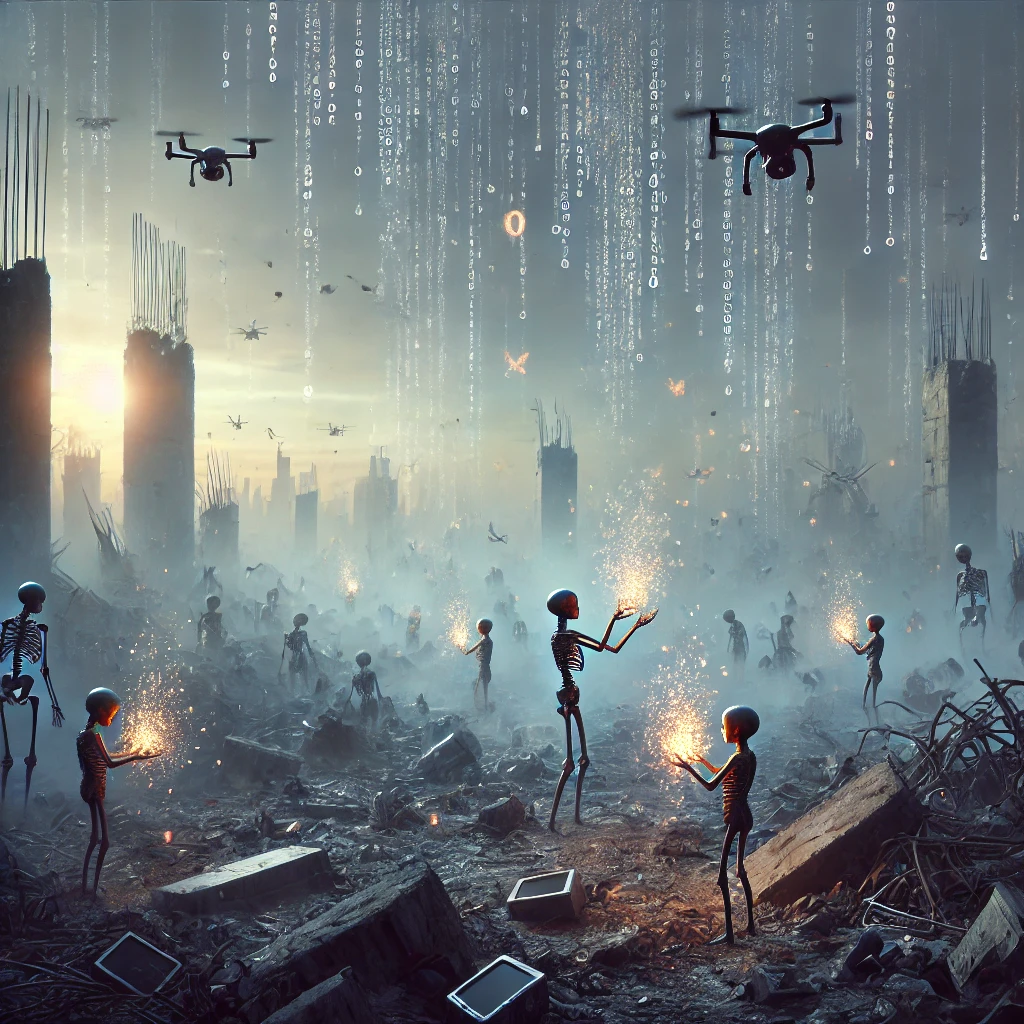 Conceptual and Creative Description “Backup of the Innocents” opens the Code of the Dead series ,a poetic and critical exploration of the relationship between humanity, memory, and technology. In this first piece, the artist envisions a field of ruins under a gray sky, where skeletal children hold glowing binary fragments , the last digital remnants of lost innocence.The composition blends surreal post-apocalyptic digital art with hyperreal cinematic lighting, evoking a haunting yet fragile beauty. Each point of binary light becomes a metaphor for memories preserved beyond death, the data traces of vanished lives.Created through a human-directed conceptual process using AI as a visual medium, the work merges artistic intuition with machine precision. Every element — from color and atmosphere to symbolism , was intentionally crafted to balance emotion and critique.This artwork invites reflection on what remains of humanity when memory exists only as code. It stands as an elegy for childhood erased by technological war and emotional extinction, a lament written in the language of data.