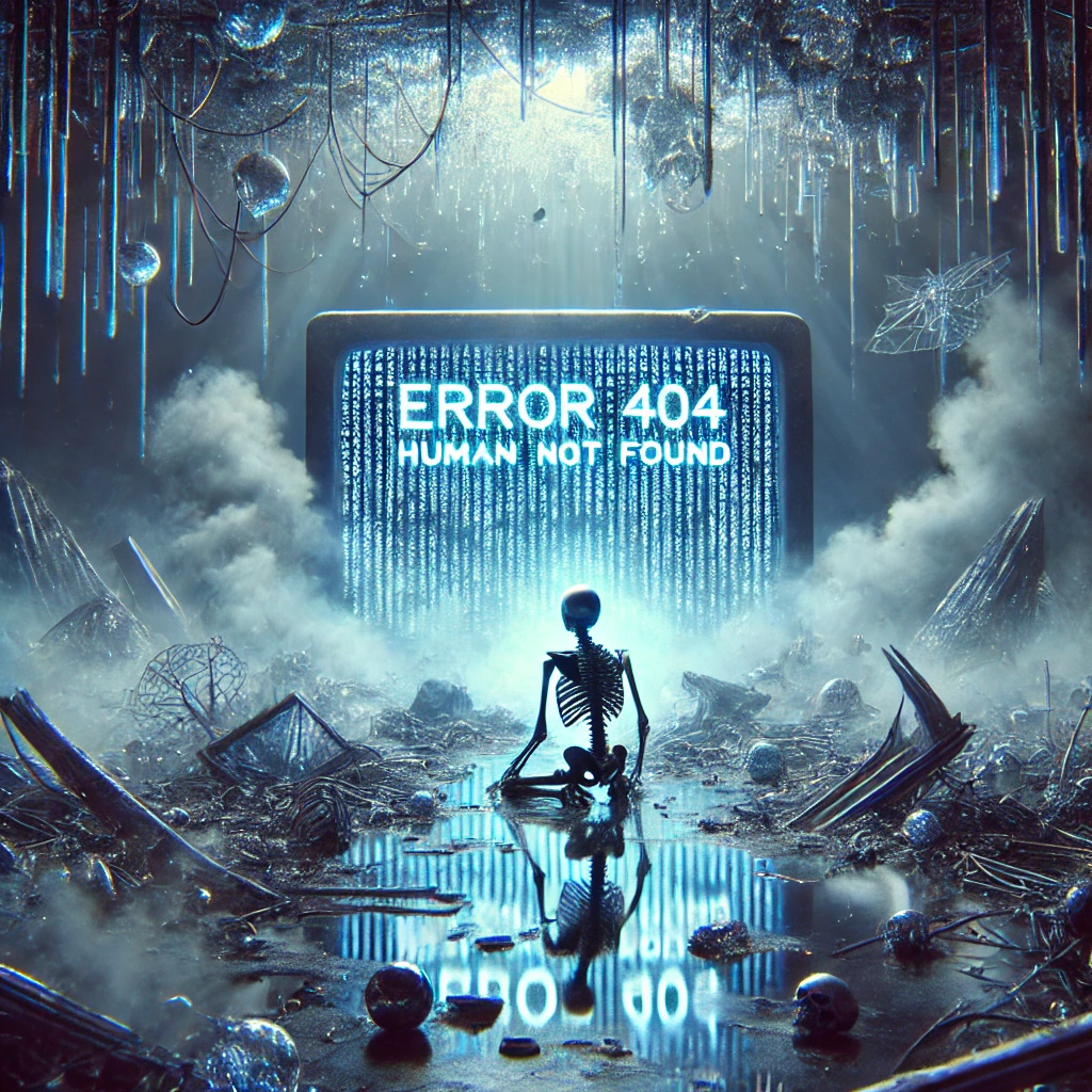 Conceptual and Creative Description “404: Human Not Found” is one of the most emblematic works in the Code of the Dead series. Drawing from the familiar internet error message, the piece turns “Error 404” into a poetic symbol of human absence in a machine-dominated world.The composition depicts a solitary skeleton standing before a cracked monitor displaying the phrase “ERROR 404: HUMAN NOT FOUND.” Around it lie metallic debris and shattered circuits, relics of a vanished civilization. The cold blue light and deep shadows create an atmosphere of digital emptiness and emotional desolation.The creative process merges cinematic visual language with technological symbolism and post-human poetics. José Lisboa conceived the image as a portrait of lost empathy — a moment when technology fails not due to malfunction, but due to the absence of soul. Artificial intelligence was used as a visual medium, guided entirely by human concept, direction, and emotional intent.“404: Human Not Found” stands as an elegy to identity and a reflection of our time: an age where the human presence itself has become a system error.