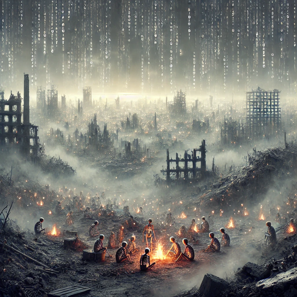 Conceptual and Creative Description “Cluster of Ruins” marks a moment of transition within the Code of the Dead series, where silence and solitude replace the chaos of earlier works. In a panoramic landscape, a destroyed city stretches into a misty horizon, while small groups of skeletons gather around clusters of binary light, glowing like digital campfires.The image portrays a form of post-human communion, a final act of sharing and remembrance amid devastation. Each glowing cluster represents fragments of data, memories, or consciousnesses that refuse to fade. The gray-blue palette and volumetric haze convey a suspended world between remembrance and oblivion.The creative process relied on cinematic light design and symbolic composition, balancing decay with flickering traces of life. José Lisboa directed the visual and emotional architecture of the scene, using AI as a poetic translator rather than a creator.“Cluster of Ruins” speaks of the persistence of collective memory, even when nothing human remains but the faint shimmer of data burning like embers among the ruins.