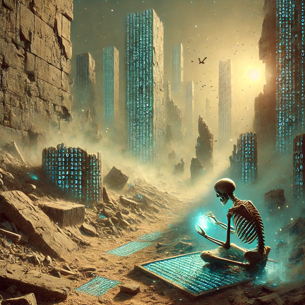 Conceptual and Creative Description “Codes of Gaza” stands among the most emotional and symbolically charged works in the Code of the Dead series. Set amid ruins marked by binary inscriptions resembling ancient calligraphy, the image weaves a dialogue between memory, faith, and technological devastation.In the foreground, a skeleton writes glowing bits of code onto the ground, as if recording the final words of an erased people. Behind it, another raises a broken circuit fragment toward the sky, a gesture of prayer, despair, and remembrance. The soft blue glow of the symbols contrasts with the sepia tones of the ruins, revealing traces of sacredness within collapse.The creative process was driven by an ethical and poetic intent: to transform digital code into a language of mourning. José Lisboa directed the work as a visual prayer for lost human data, using AI as an expressive medium guided entirely by human concept and emotion.“Codes of Gaza” is not a literal depiction of conflict but a universal metaphor for the writing of pain, for how every civilization leaves luminous traces even when all else turns to dust.