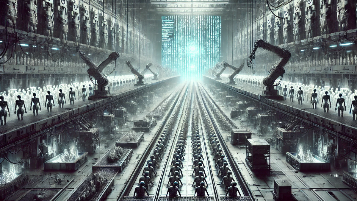 Conceptual and Creative Description “Algorithm of Death” is the mechanical heart of the Code of the Dead series.It depicts the assembly line of dehumanization: a sterile, endless factory where skeletons are processed by mechanical arms beneath the cold glow of binary screens. Each coordinate displayed is a digital epitaph; each line of code, a remnant of the soul.The aesthetic merges hyper-digital realism with an industrial atmosphere, volumetric dust, metallic light, and sterile silence.The work questions the boundary between human and algorithm , where flesh ends and data begins, where emotion dies and calculation is born.By turning the body into code, “Algorithm of Death” exposes the ethical decay of progress and the spiritual emptiness of automation.It is a portrait of perfection without soul , the cold paradise of machines, and the last human scream dissolving into binary.