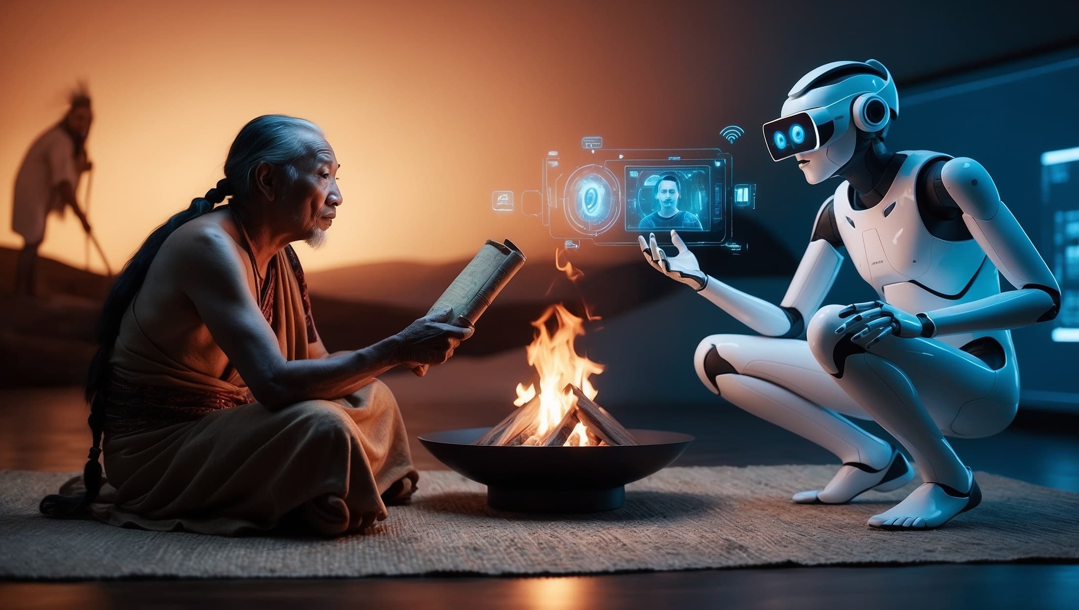 An elder from an ancient tribe sits with a futuristic AI, both engaged in storytelling, with the elder holding an ancient scroll and the AI projecting holographic images