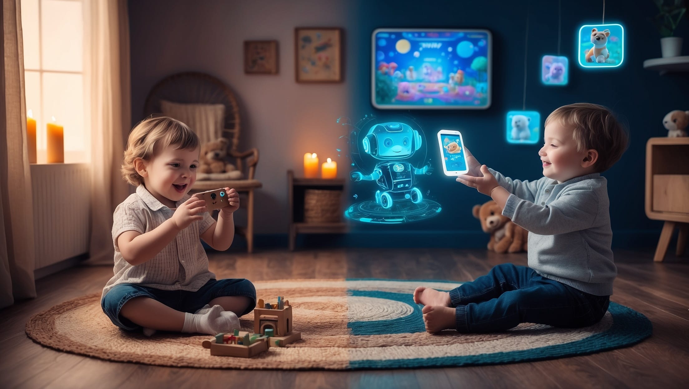 A child from the past playing with a handmade toy gradually blends with a child from the future interacting with a holographic, AI-generated game