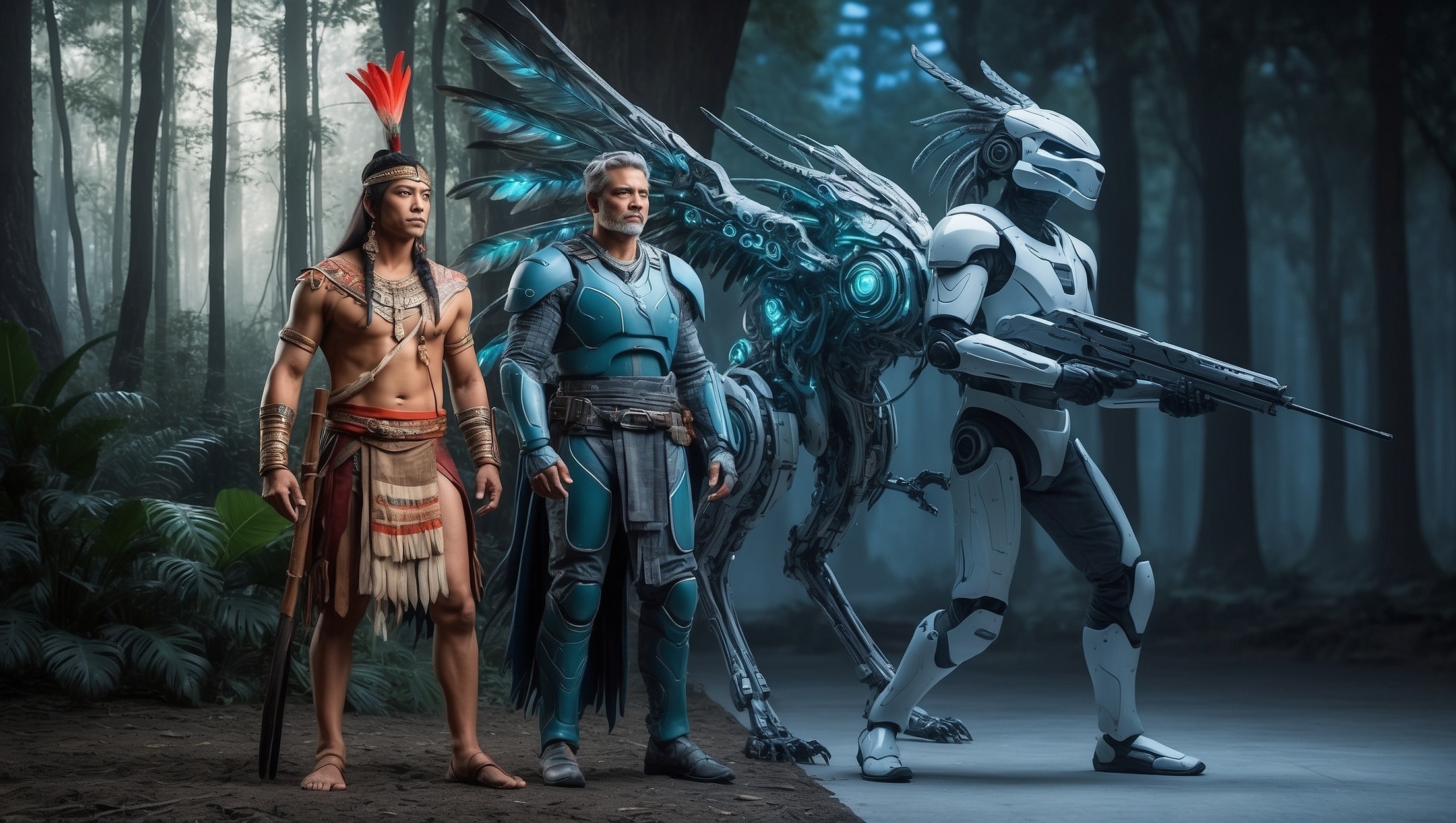 An ancient warrior adorned in tribal attire stands side by side with a futuristic soldier in high-tech armor, both protecting a majestic, mythical creature that blends elements of ancient and futuristic design