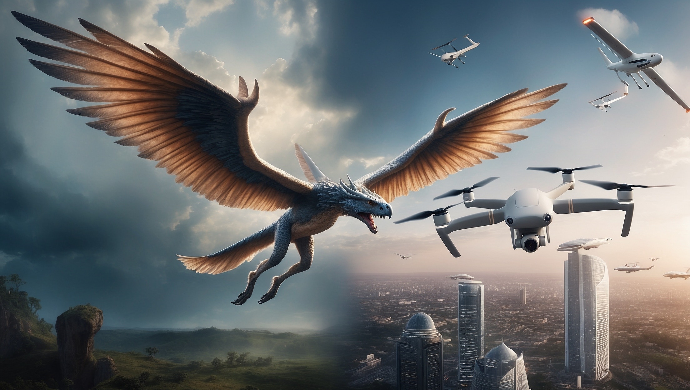 A mythical winged creature from ancient mythology and a futuristic drone