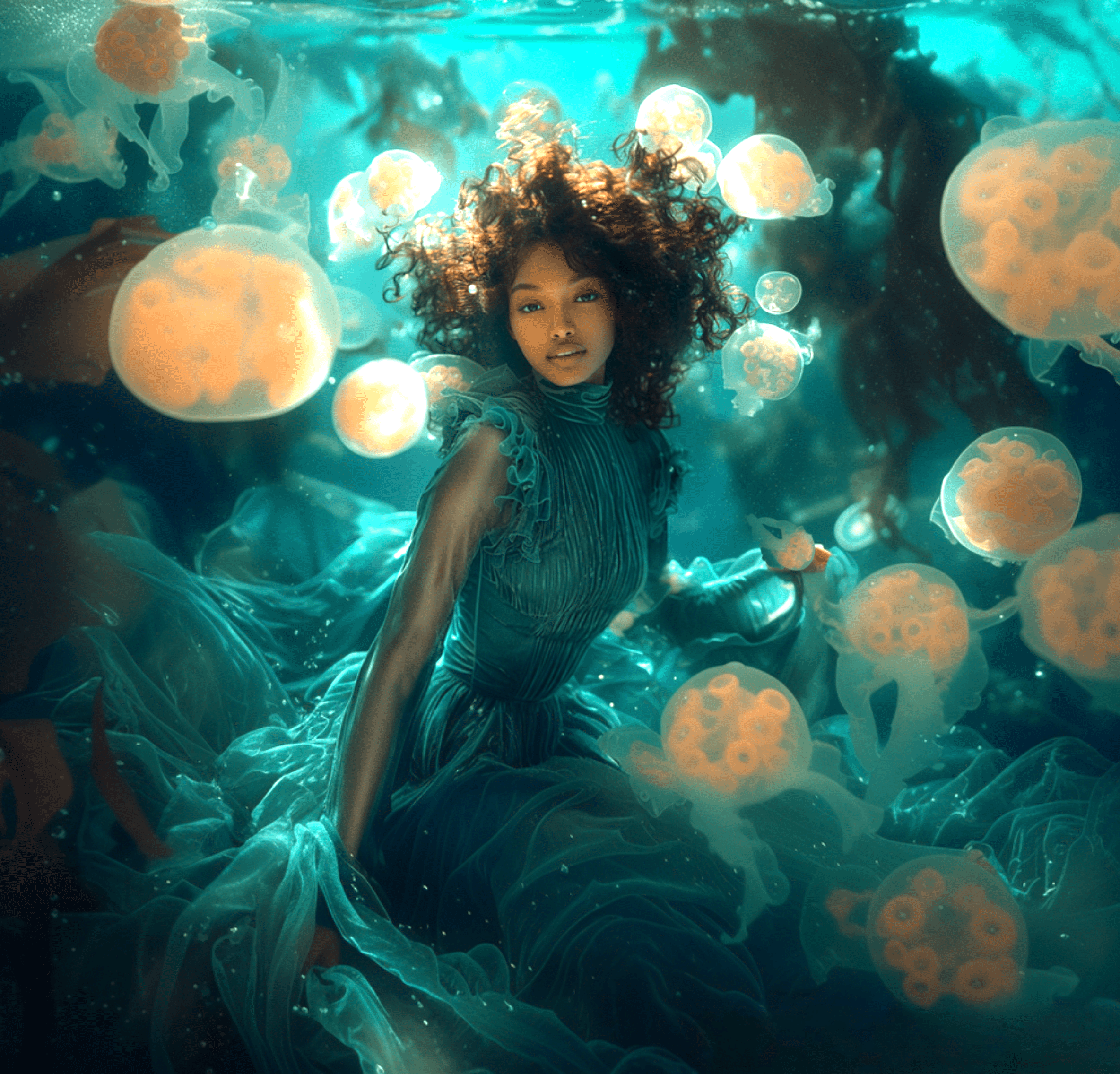 The artwork draws inspiration from the intimate and mystical relationship between the moon, with its intriguing influence on human biorhythms, and the sea, a cradle of diverse life forms. The fluid silhouettes represent the delicate beauty of marine life and the richness and fragility of ocean ecosystems, portraying the importance of protecting our marine environment.