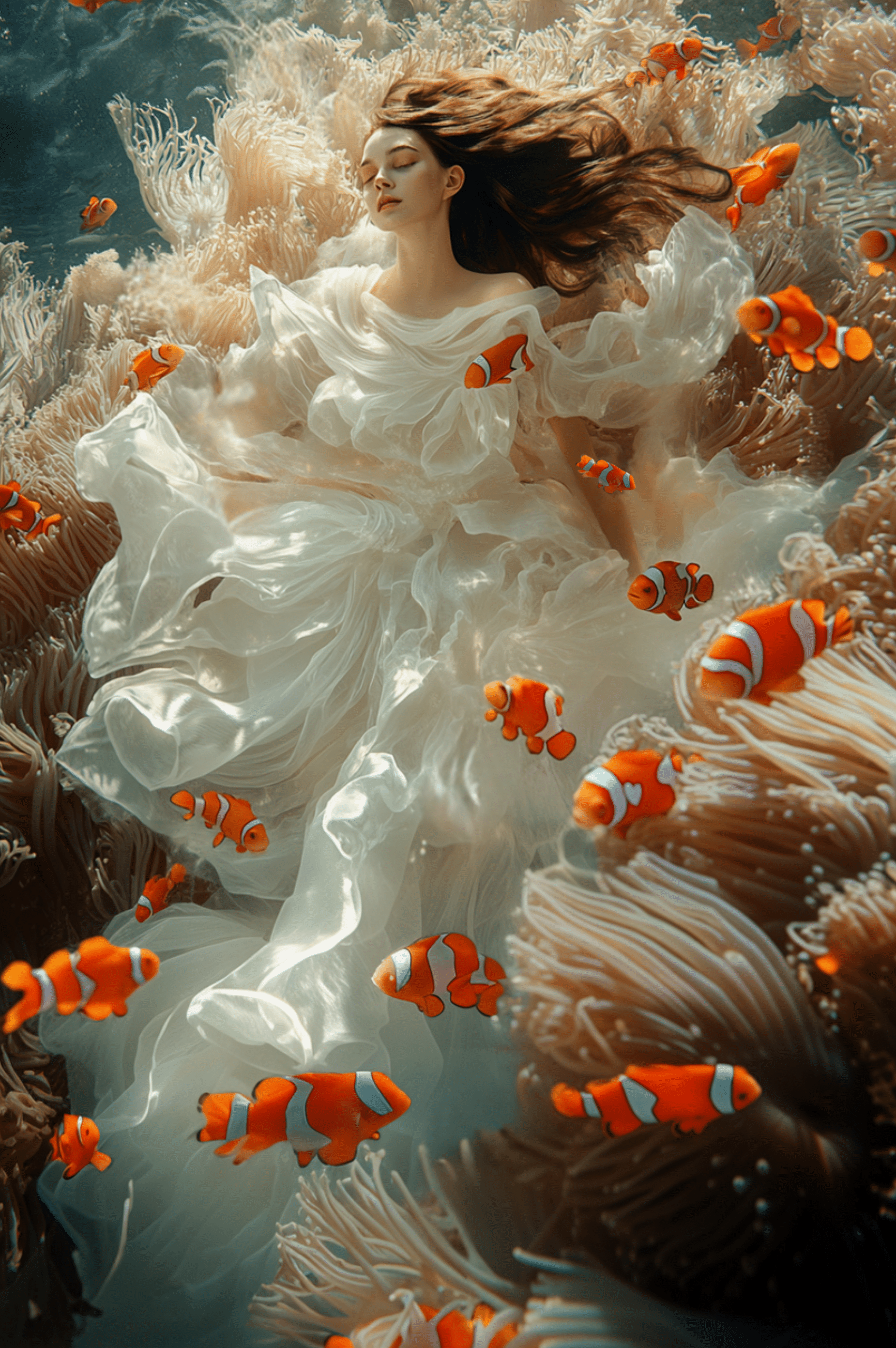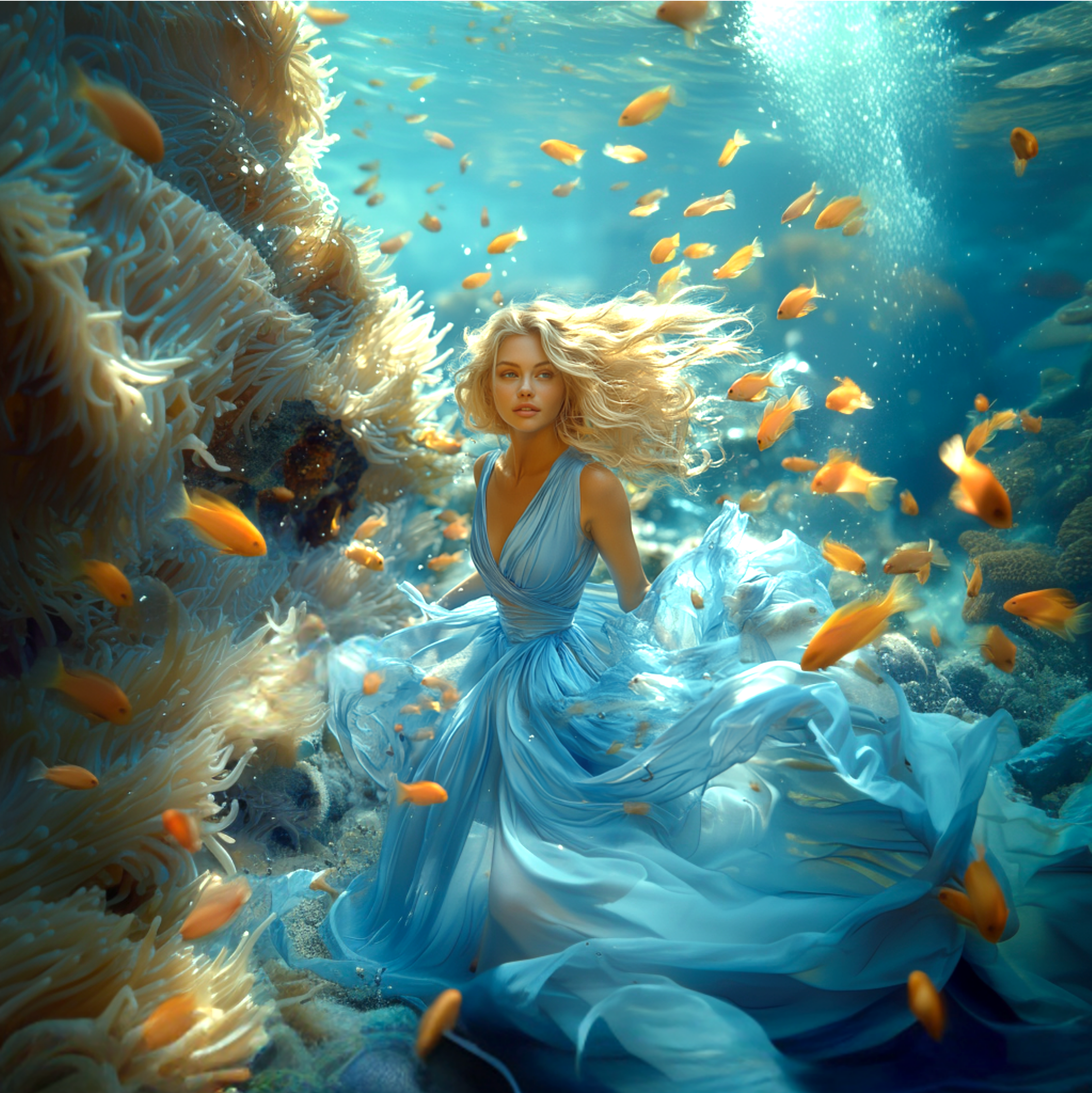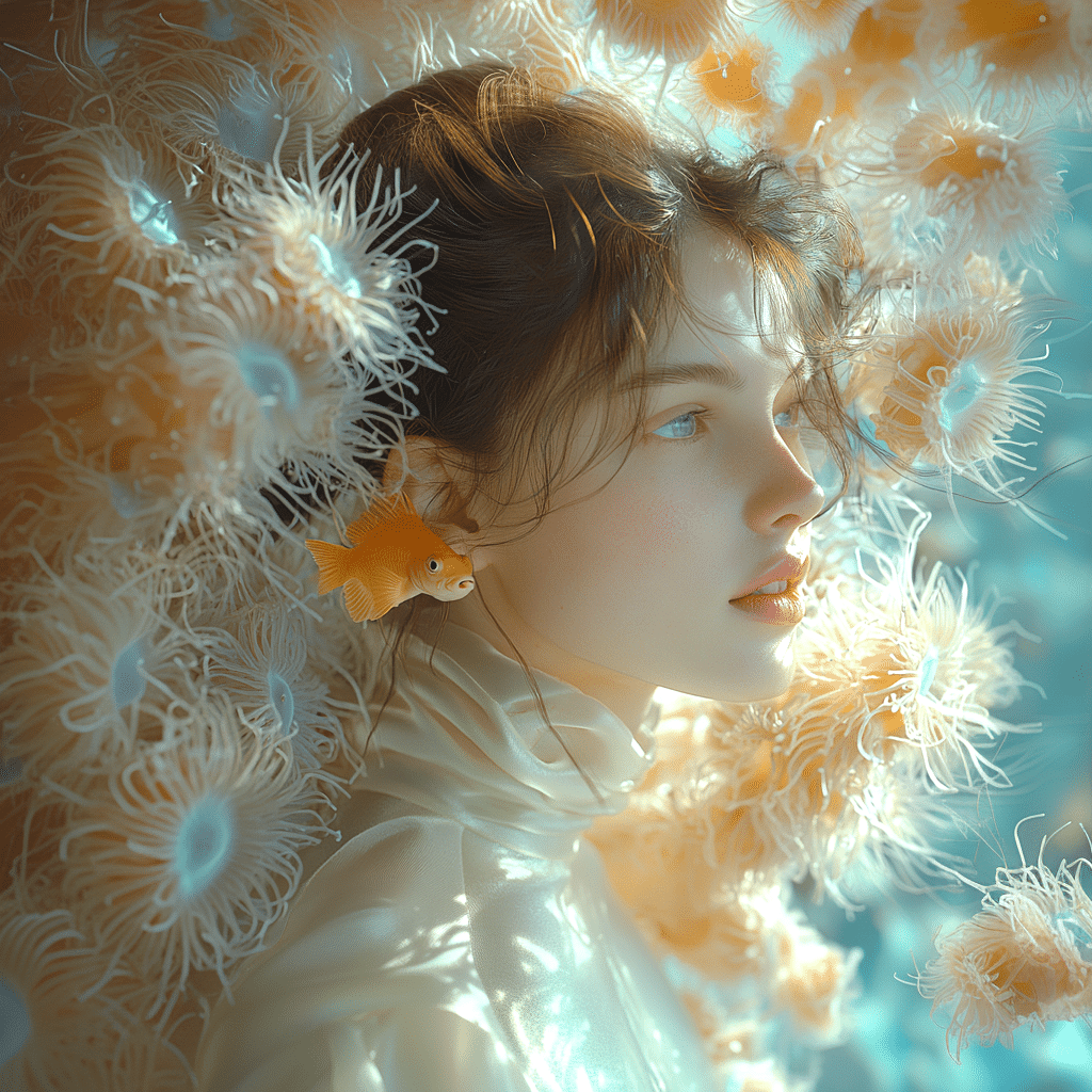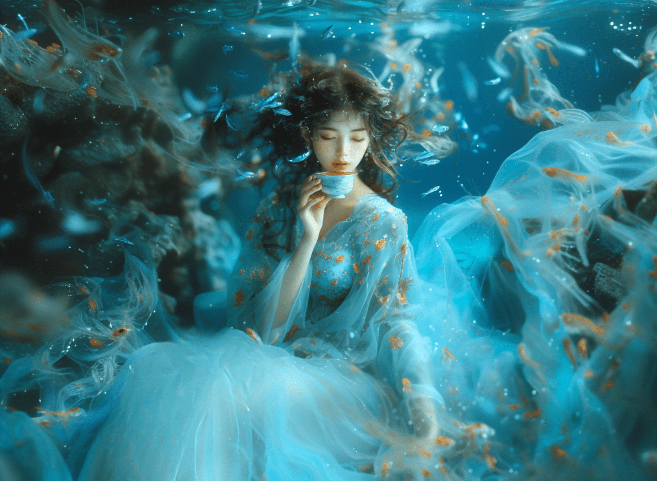 The moon, captivated by the sea, gave birth to mystical incarnations from its light. These incarnations transform into various forms, spending precious moments with waves and fish.