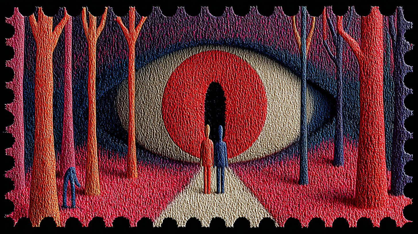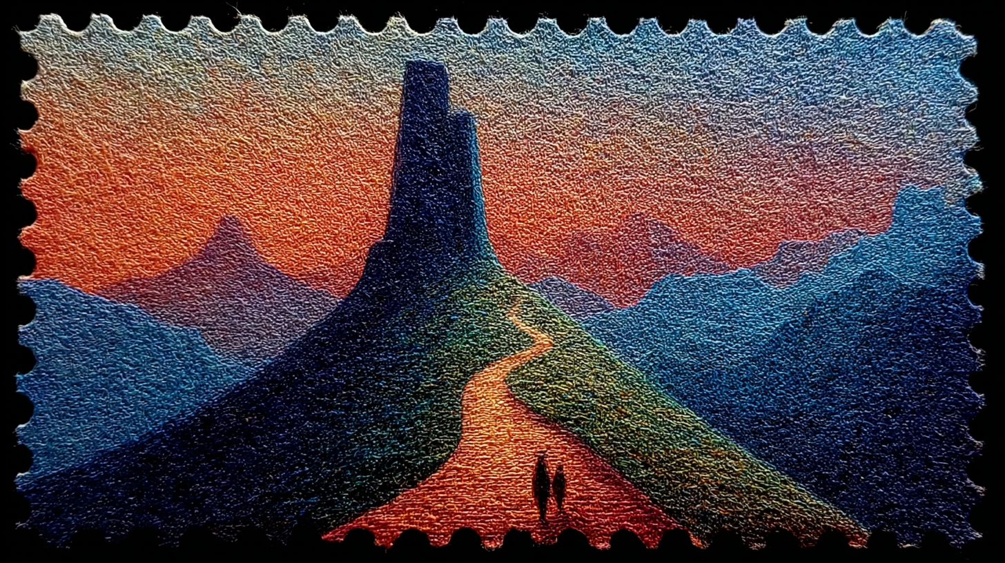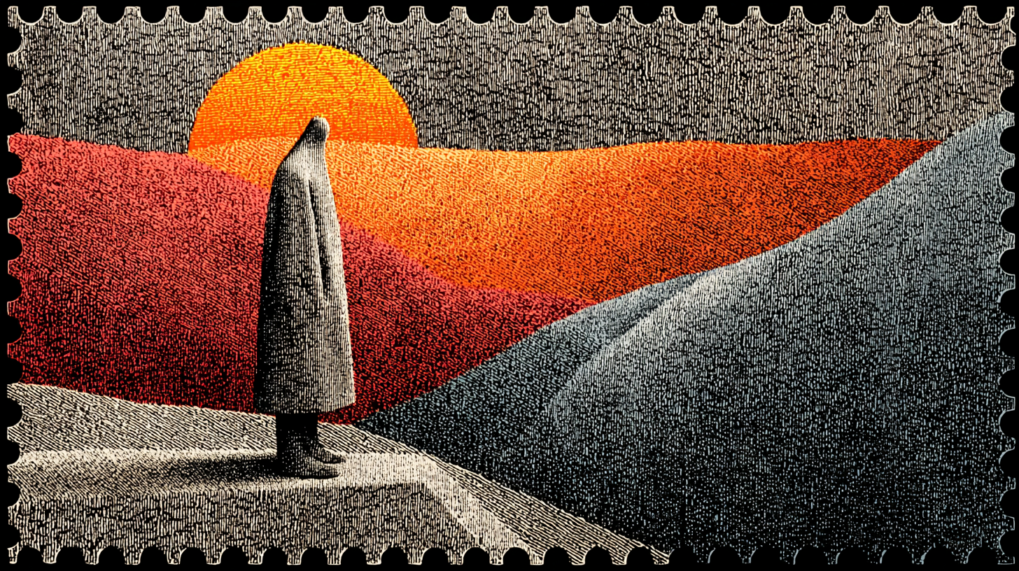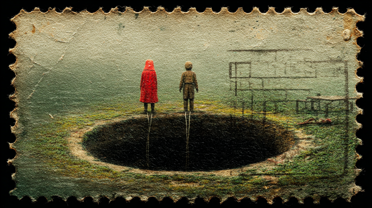 "Stamps of the void" is a haunting philatelic series that captures surreal narratives frozen in time, each stamp portraying eerie moments at the edge of the unknown. In this piece, two faceless figures stand before an impossibly deep black pit—one cloaked in red, the other in sepia—while ghostlike structures and a distant body whisper stories of loss, curiosity, and forgotten worlds. Like messages never sent, these dreamlike vignettes explore themes of disappearance, memory, and the unspoken weight of silence.