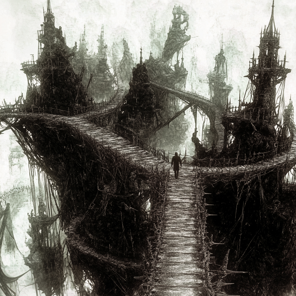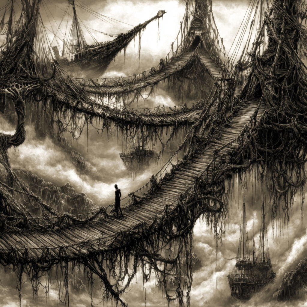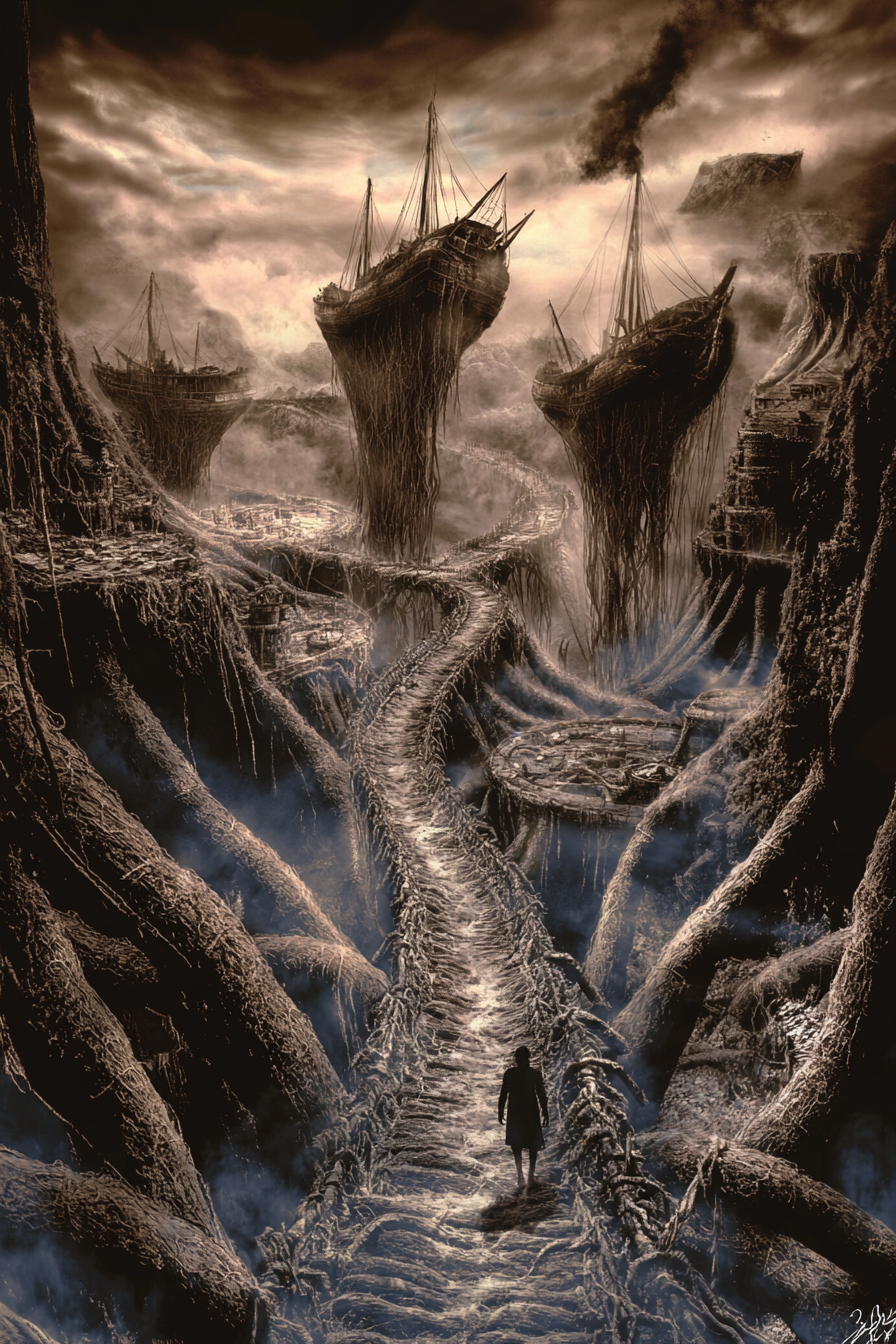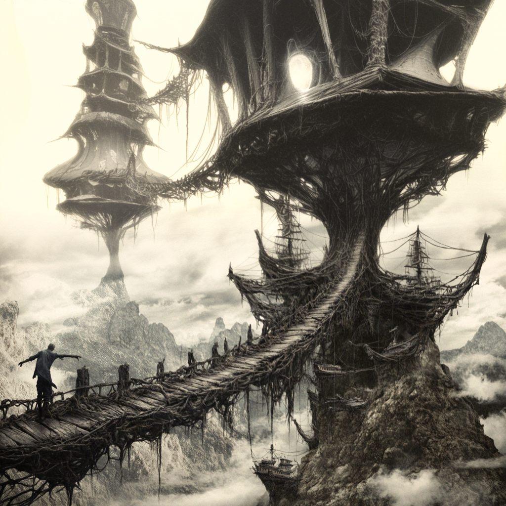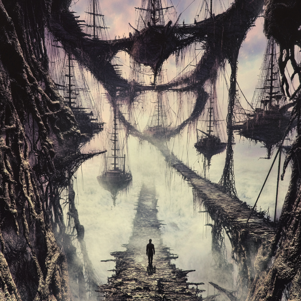 A small figure walks the root-made bridges that hang over clouds and broken voids. The world is lucid here: everything seen with the chill clarity of a dream that knows it is dreaming. Old ships hover below like discarded fates, awaiting a tide that will never return. I first drew these crossings as a child; only later was I told they might be death itself, the quiet traffic between lives. Perhaps. What I know is the solitude: parallel travellers never met, messages never sent. The bridges persist, and so does the walking -calm, relentless, and, like death, inevitable.