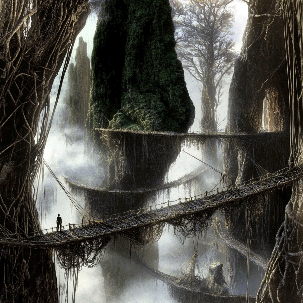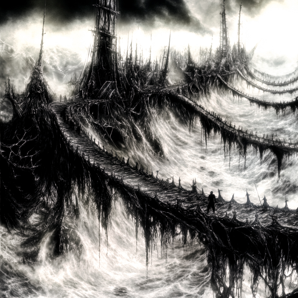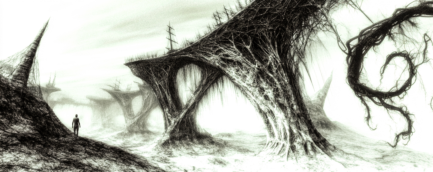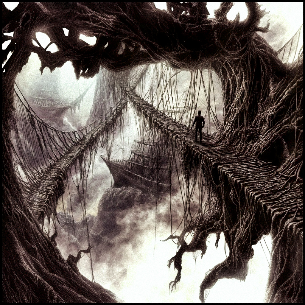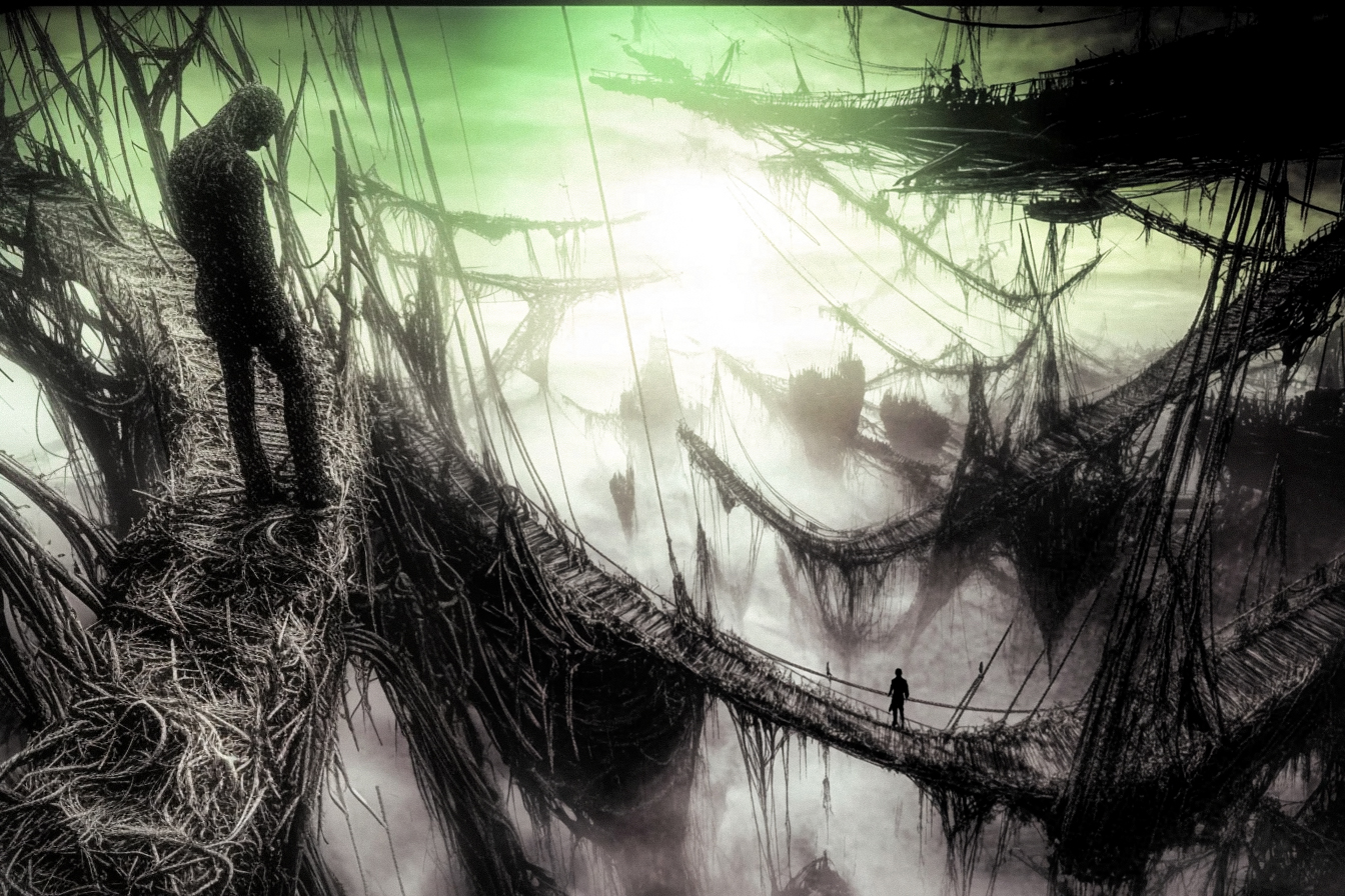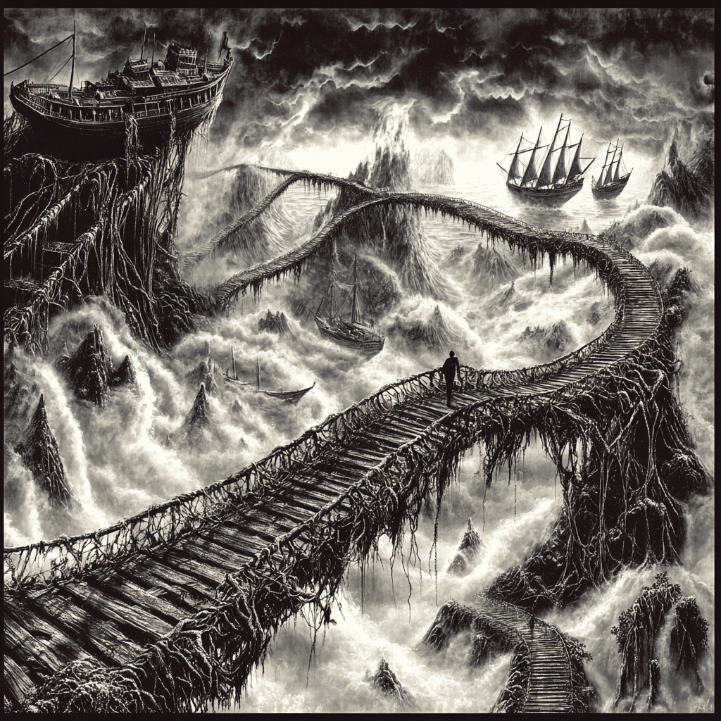 A small figure walks the root-made bridges that hang over clouds and broken voids. The world is lucid here: everything seen with the chill clarity of a dream that knows it is dreaming. Old ships hover below like discarded fates, awaiting a tide that will never return. I first drew these crossings as a child; only later was I told they might be death itself, the quiet traffic between lives. Perhaps. What I know is the solitude: parallel travellers never met, messages never sent. The bridges persist, and so does the walking -calm, relentless, and, like death, inevitable.