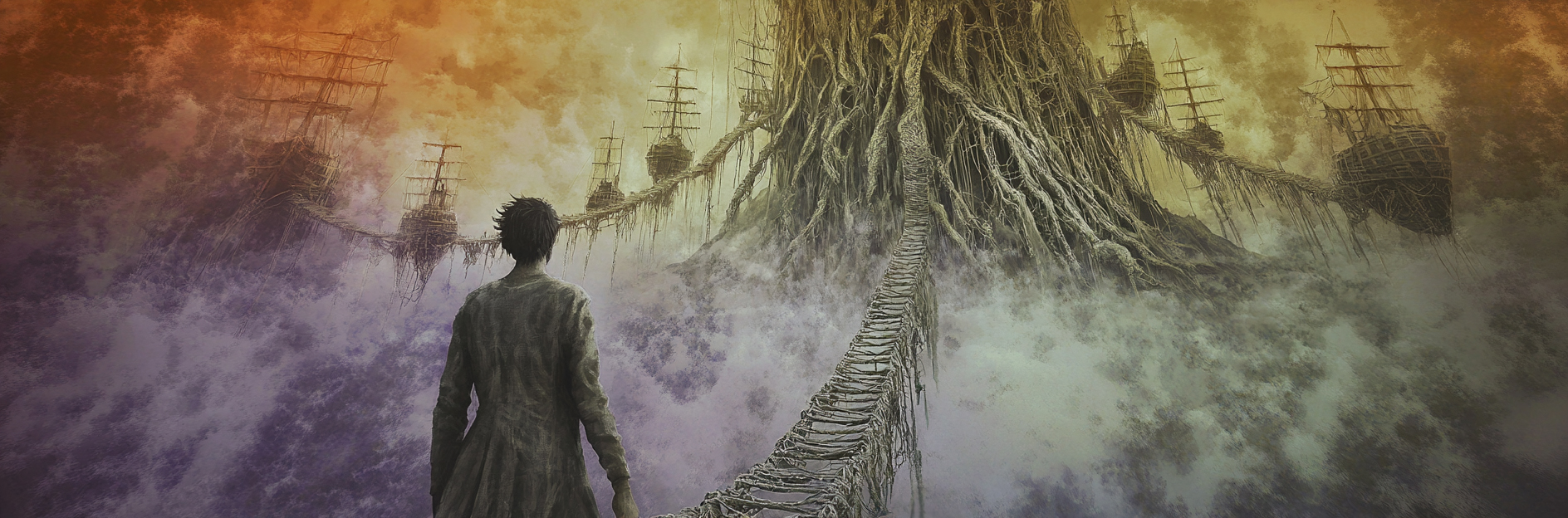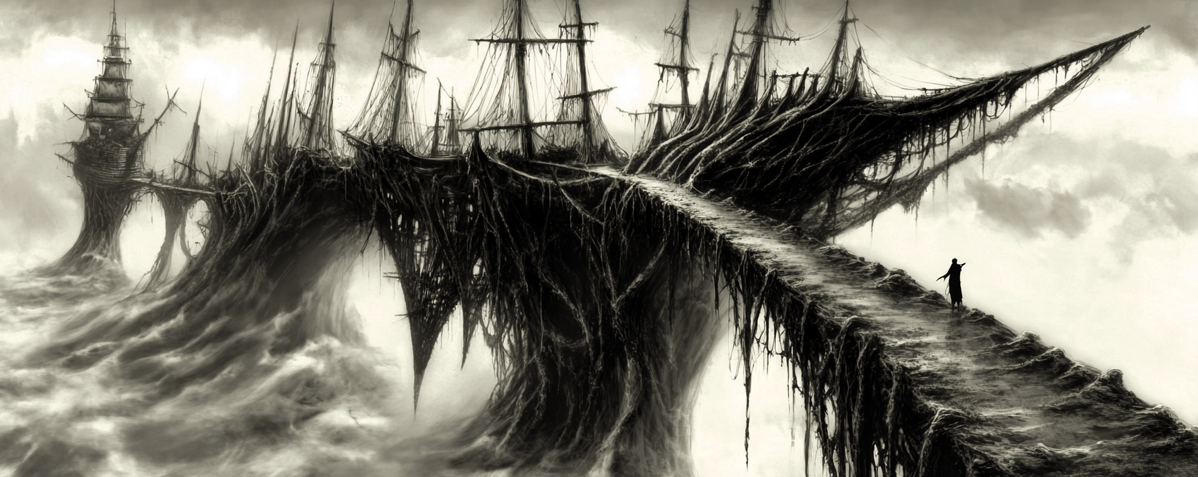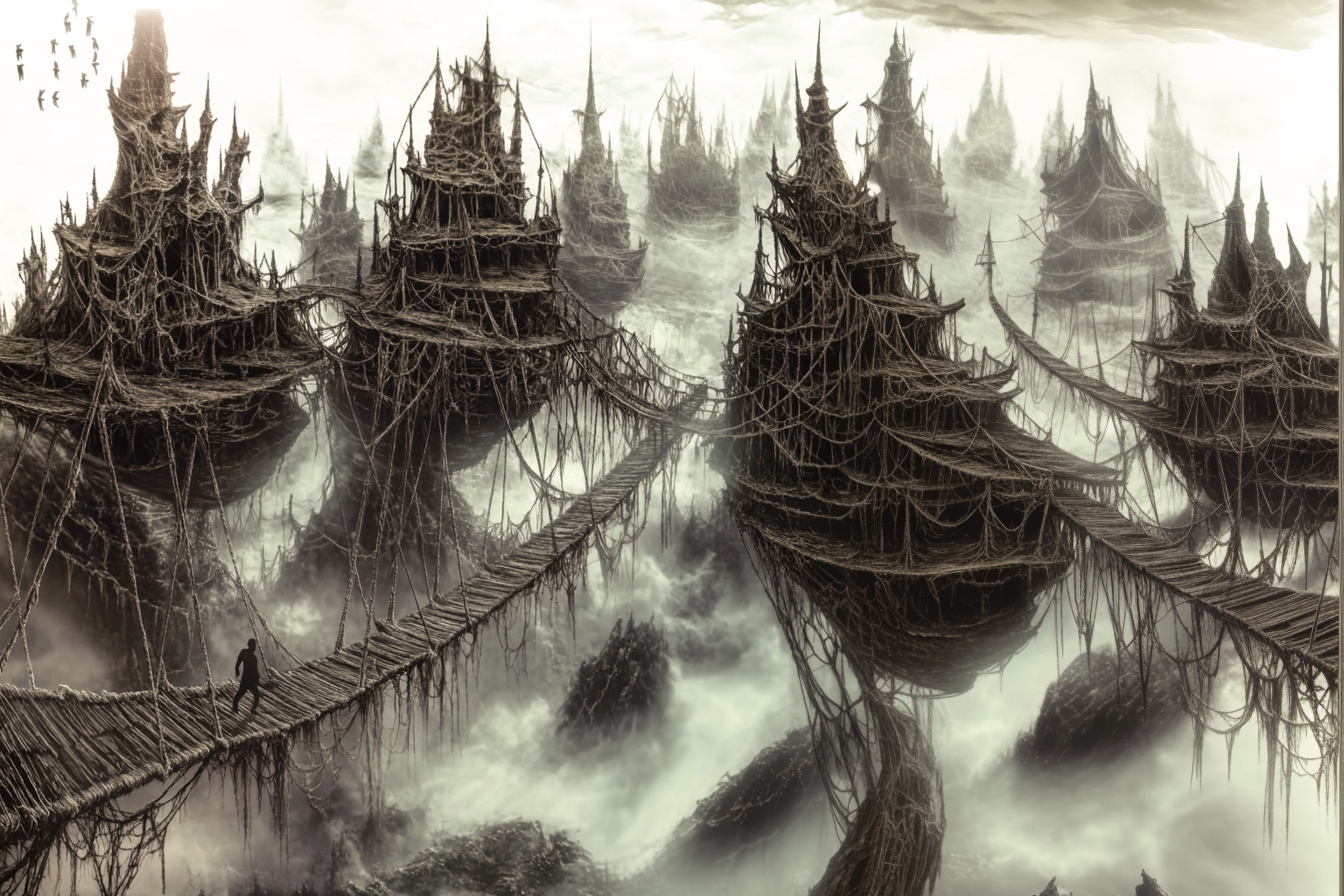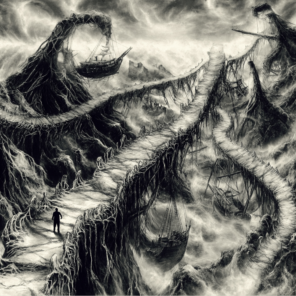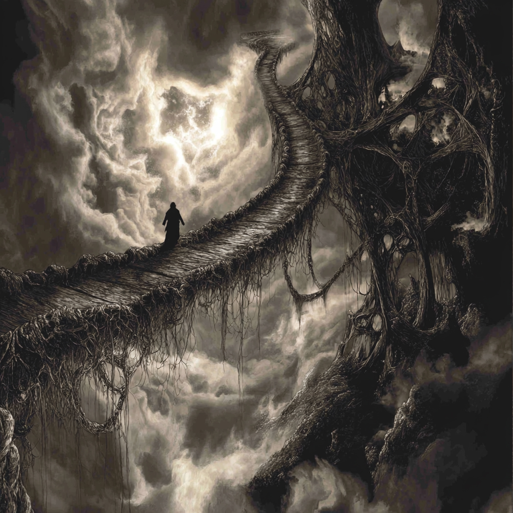 A small figure walks the root-made bridges that hang over clouds and broken voids. The world is lucid here: everything seen with the chill clarity of a dream that knows it is dreaming. Old ships hover below like discarded fates, awaiting a tide that will never return. I first drew these crossings as a child; only later was I told they might be death itself, the quiet traffic between lives. Perhaps. What I know is the solitude: parallel travellers never met, messages never sent. The bridges persist, and so does the walking -calm, relentless, and, like death, inevitable.