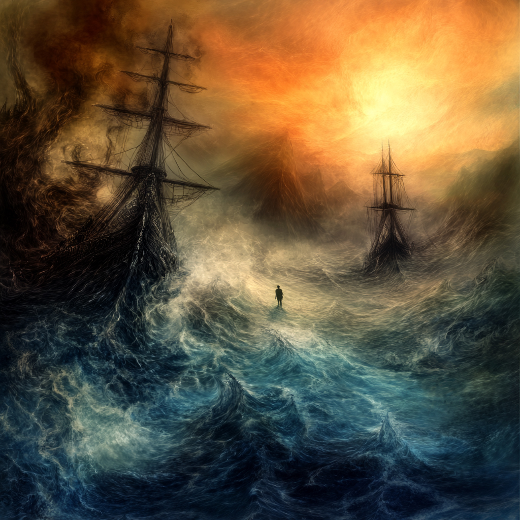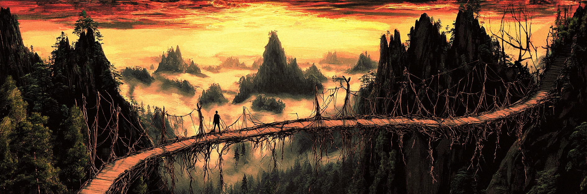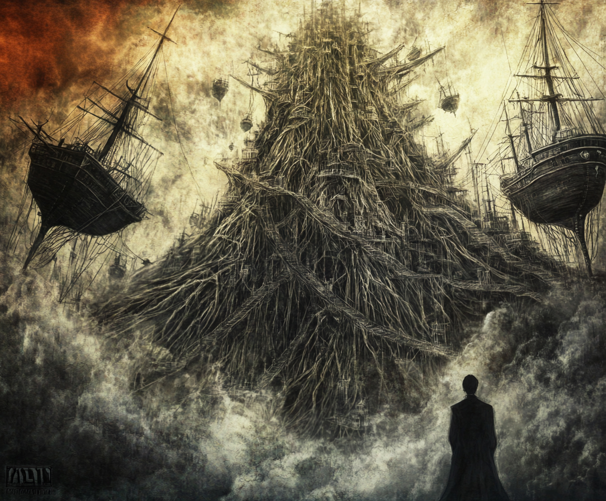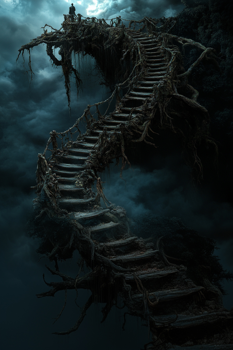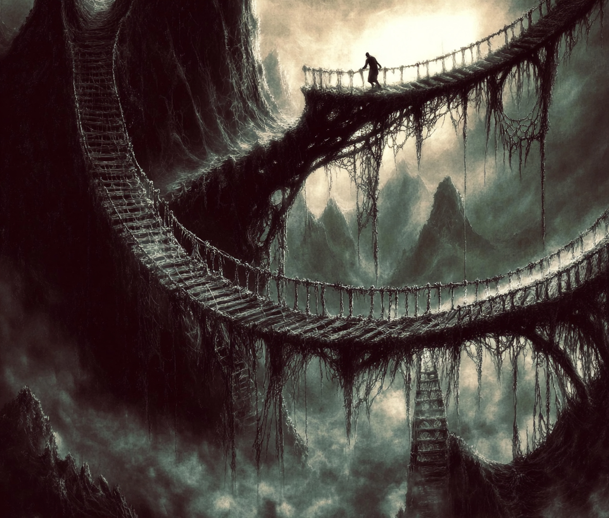 A small figure walks the root-made bridges that hang over clouds and broken voids. The world is lucid here: everything seen with the chill clarity of a dream that knows it is dreaming. Old ships hover below like discarded fates, awaiting a tide that will never return. I first drew these crossings as a child; only later was I told they might be death itself, the quiet traffic between lives. Perhaps. What I know is the solitude: parallel travellers never met, messages never sent. The bridges persist, and so does the walking -calm, relentless, and, like death, inevitable.