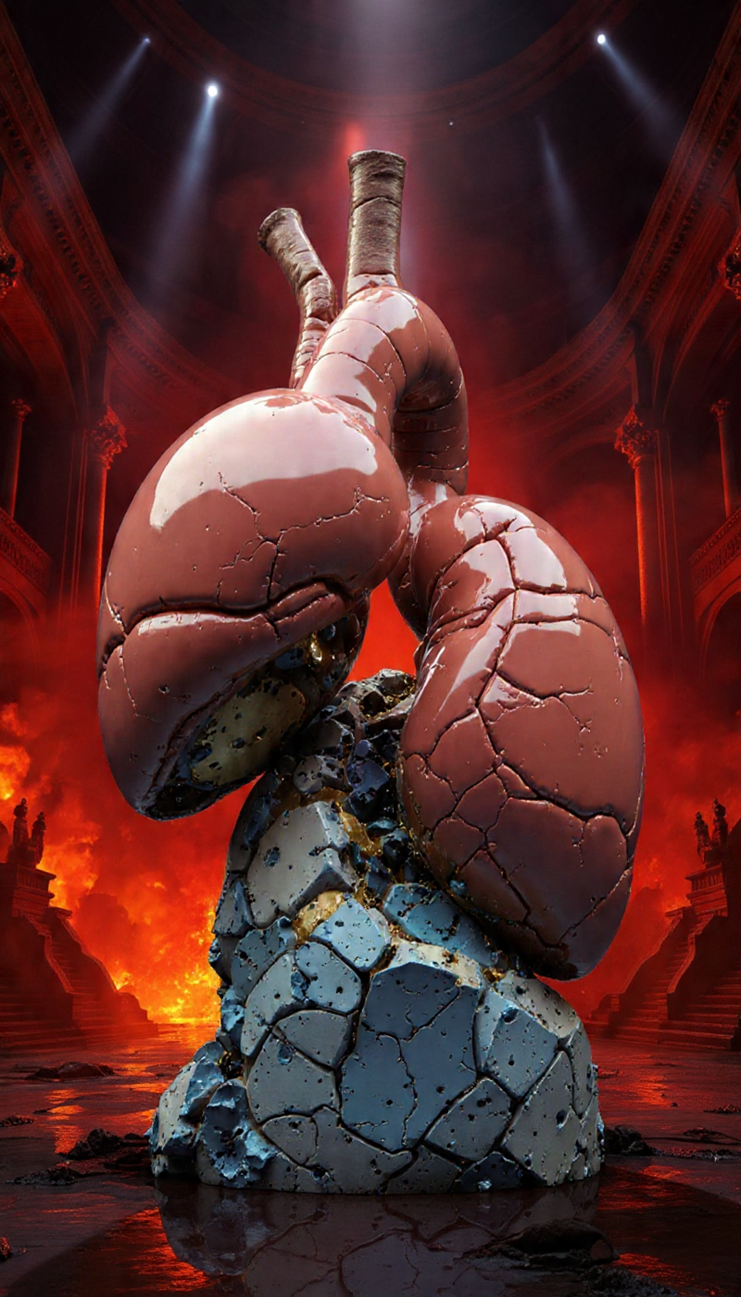 Pulmo / Ruptura Pulmo / Ruptura is a symbolic exploration of internal fracture. The lungs, suspended in a void, are split between vitality and collapse — one side glowing with warmth and breath, the other blackened, cracked, and disintegrating into ash. This duality...