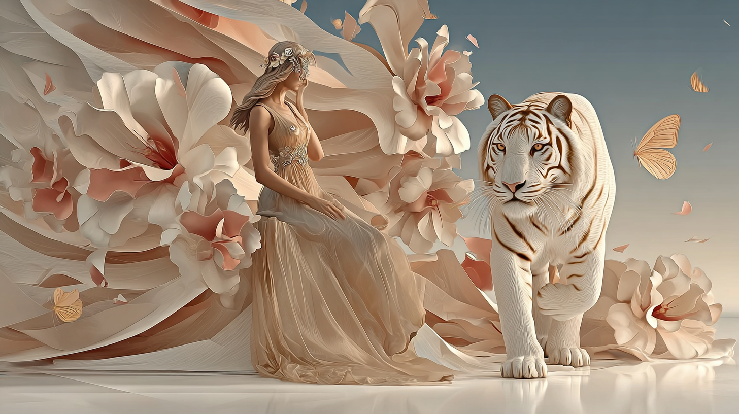 Utilizing AI-generated techniques to fuse realism and abstraction, this work explores the dialogue between humanity and nature, fragility and strength, stillness and light. From the soft texture of air like petals to the shimmer of the tiger's fur, every detail reveals the coexistence of elegance and resilience.