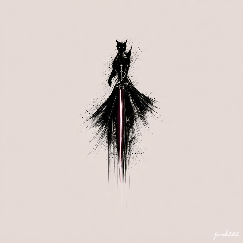 The artwork portrays a cat warrior — an anthropomorphic, enigmatic figure standing with a sword pointed toward the ground. The black silhouette bursts outward in sharp lines, as if energy, anger, or raw spirit were exploding beneath the surface of calm. At the center, along the sword, a faint crimson glow cuts through — a subtle trace of life, passion, or blood.