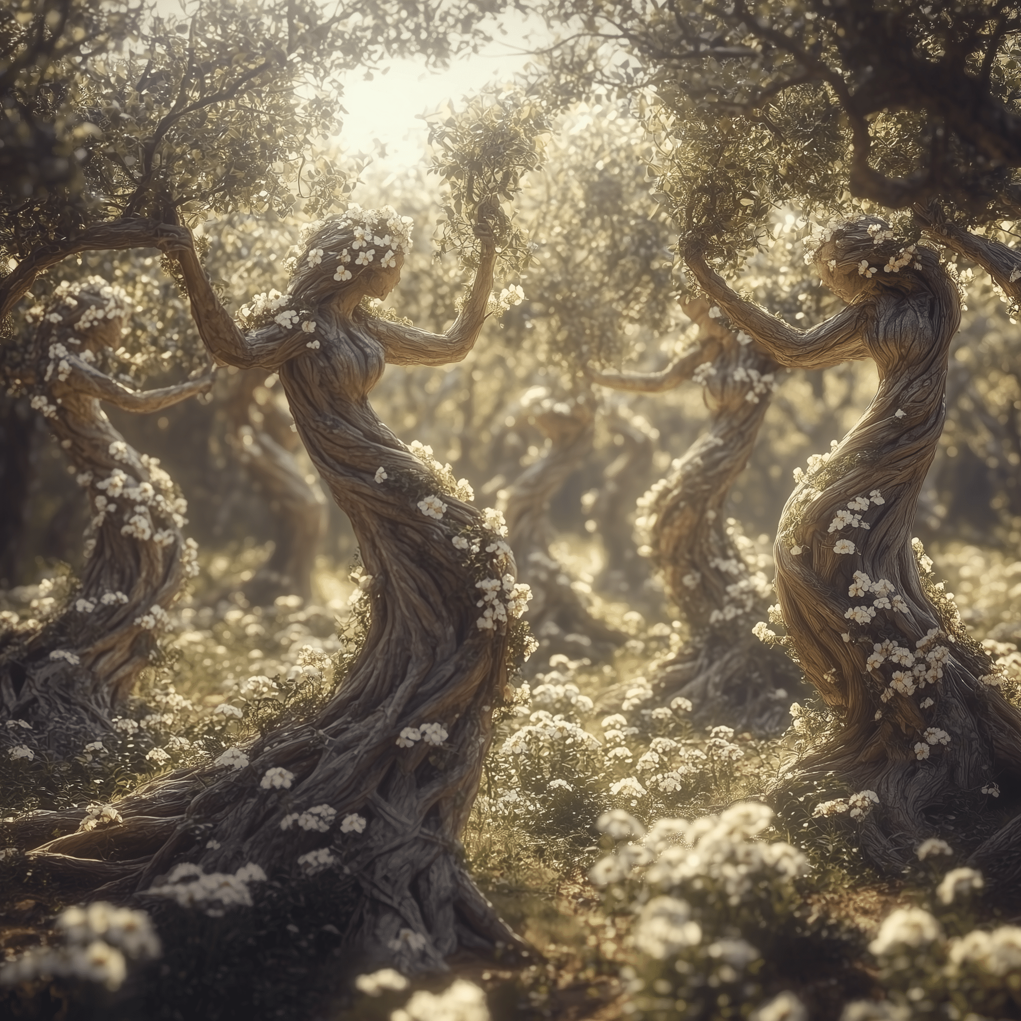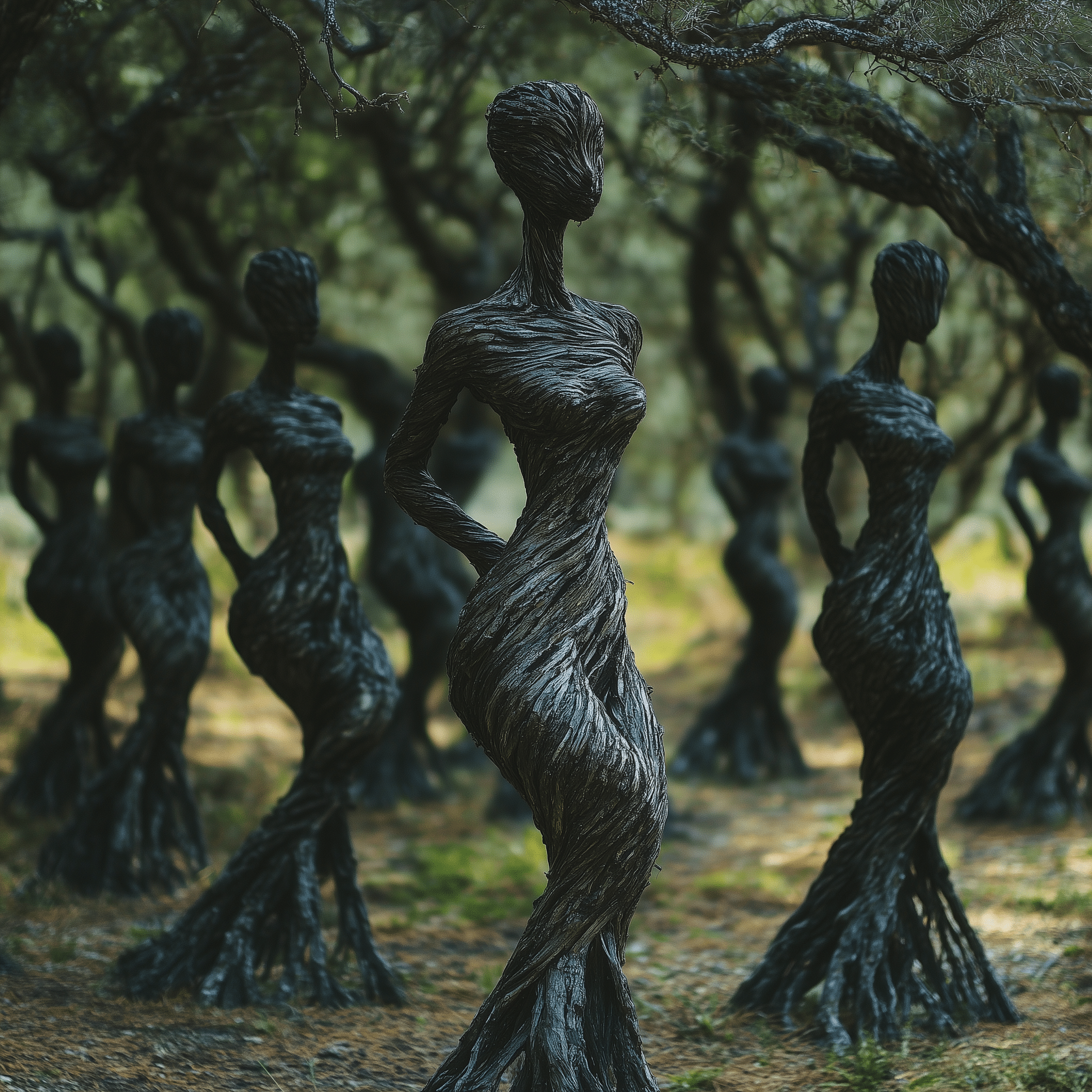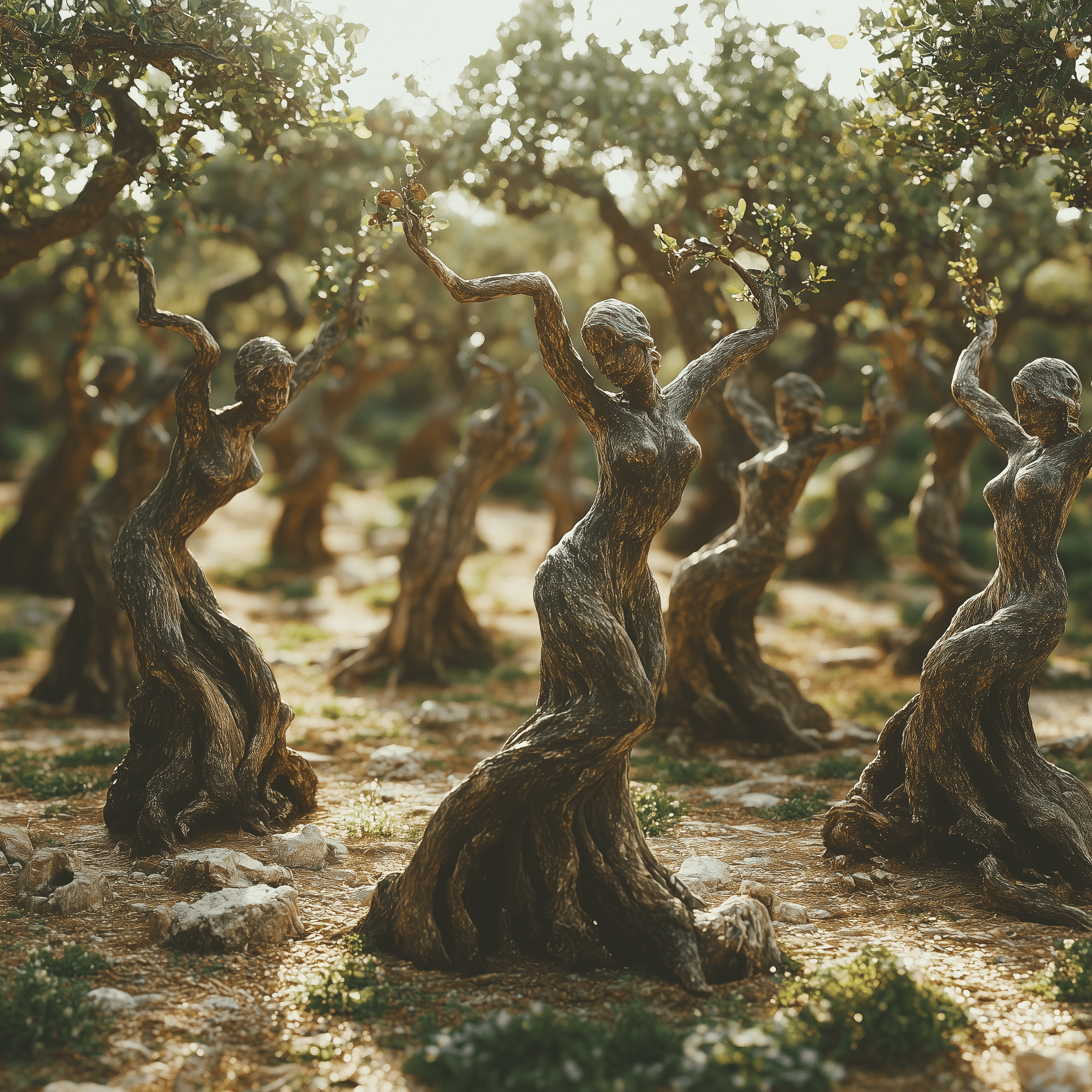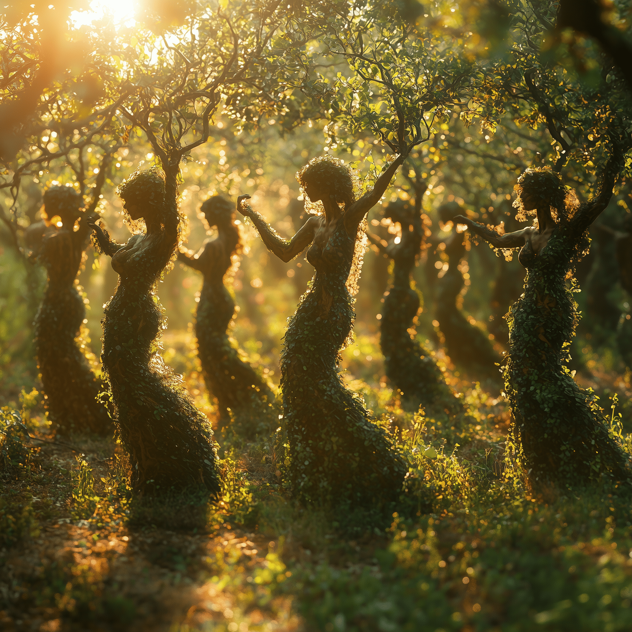 Ancient forms, half-human, half-tree, reach for a sunlit sky.