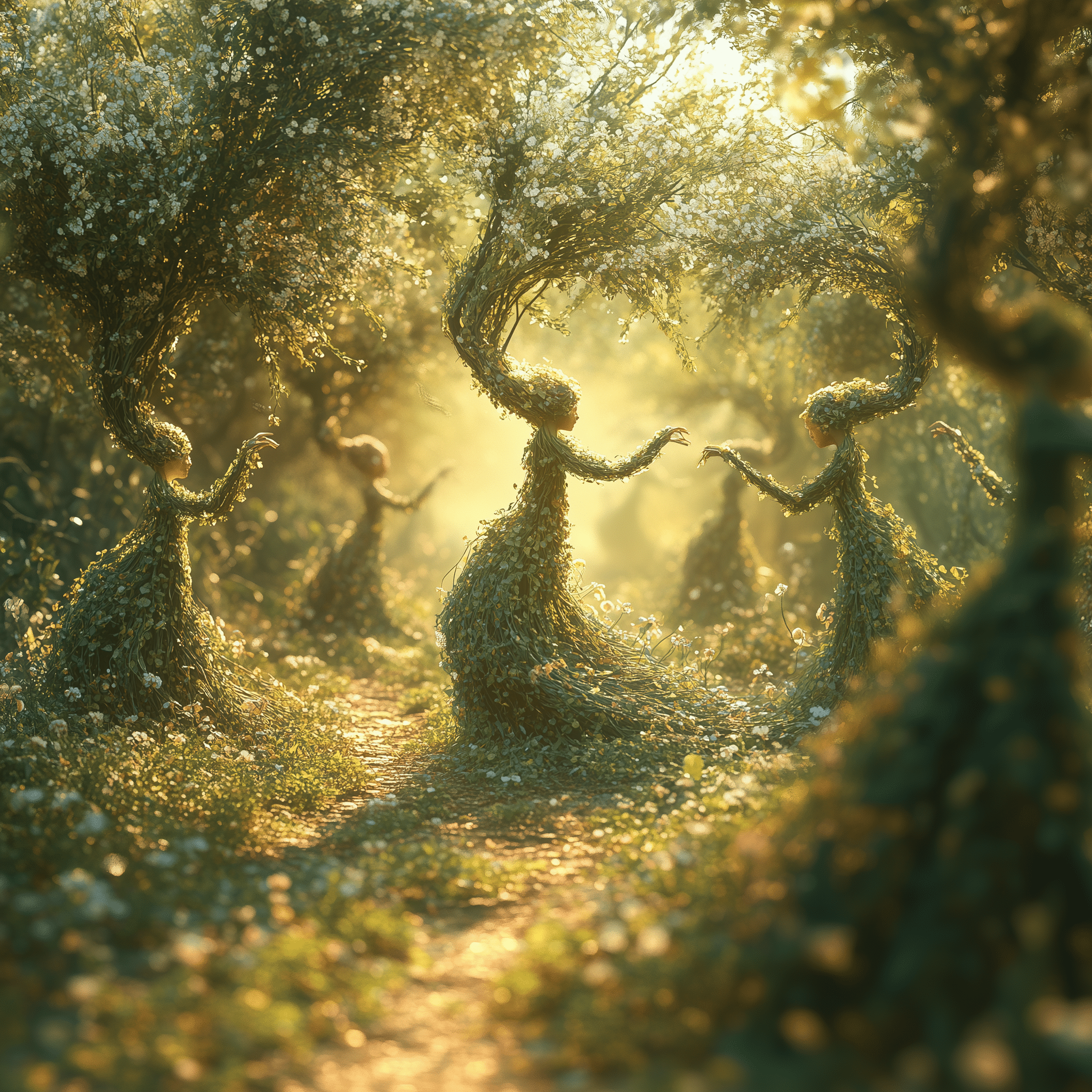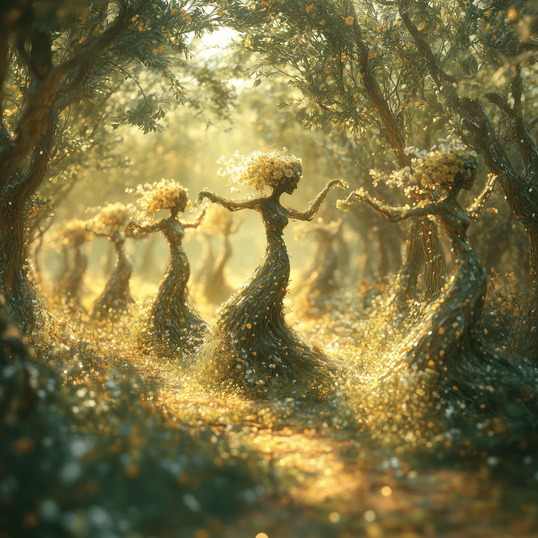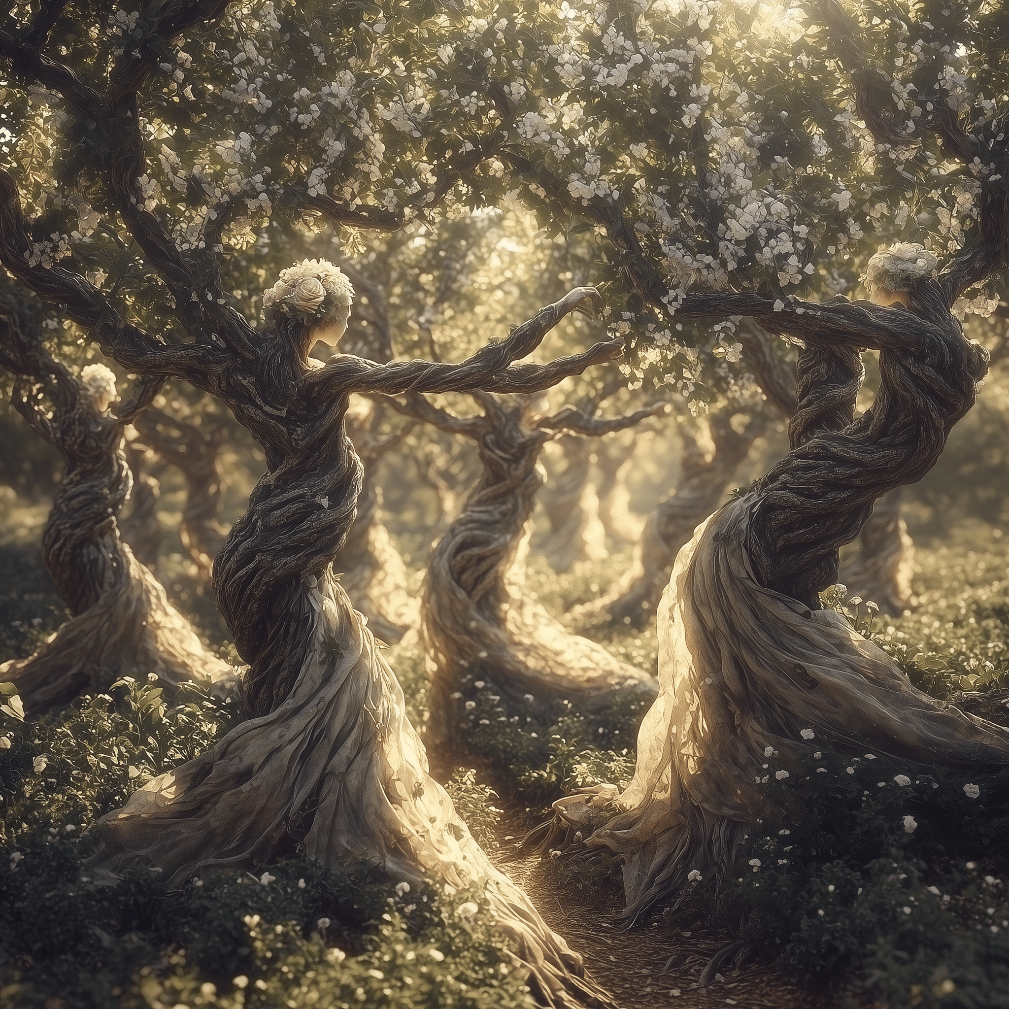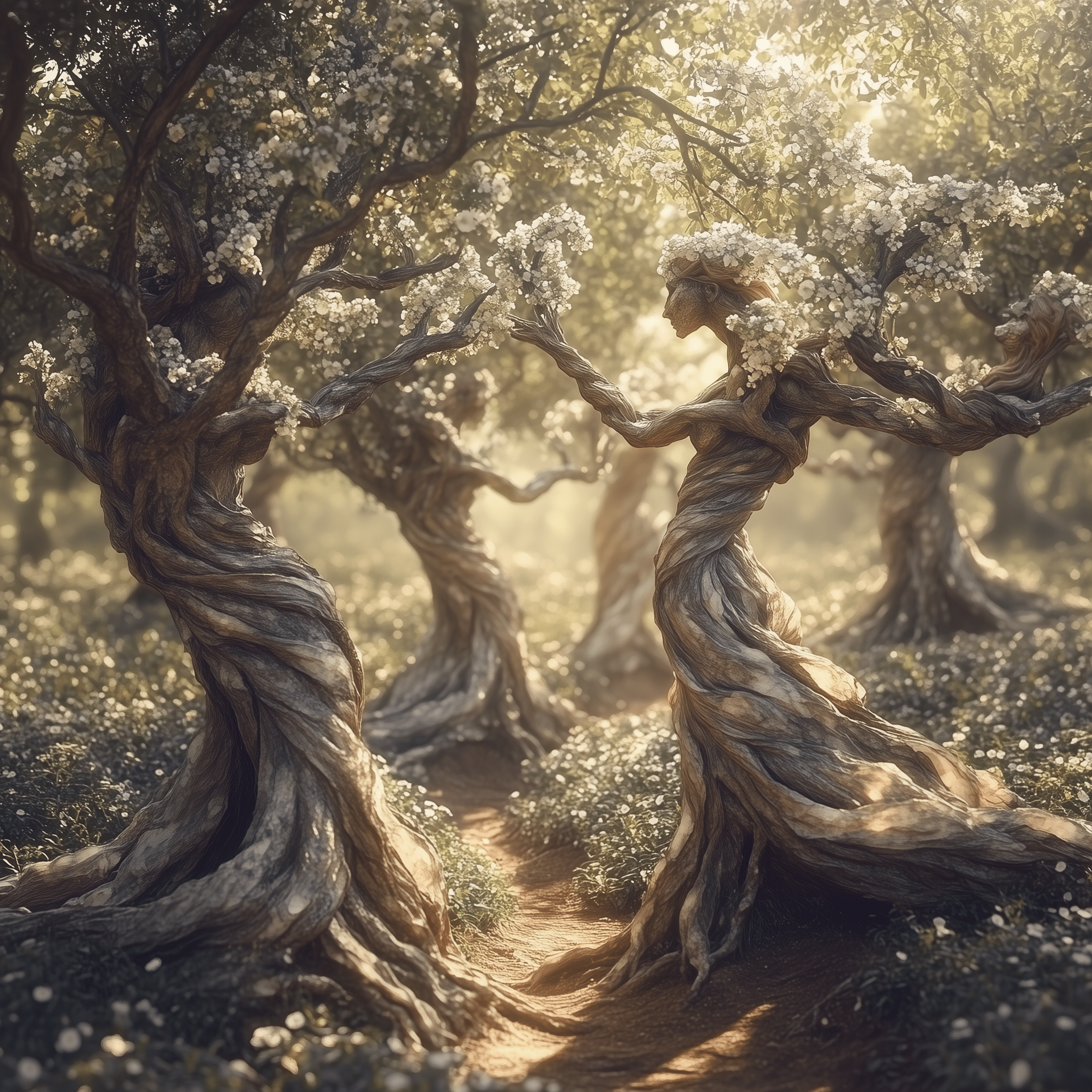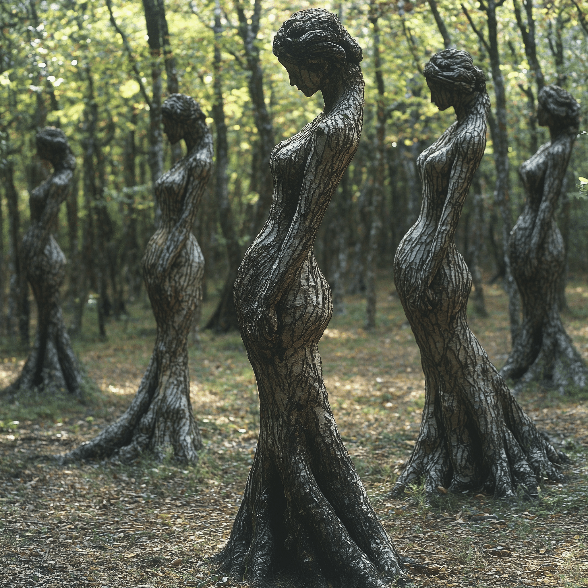 Ancient forms, half-human, half-tree, reach for a sunlit sky.