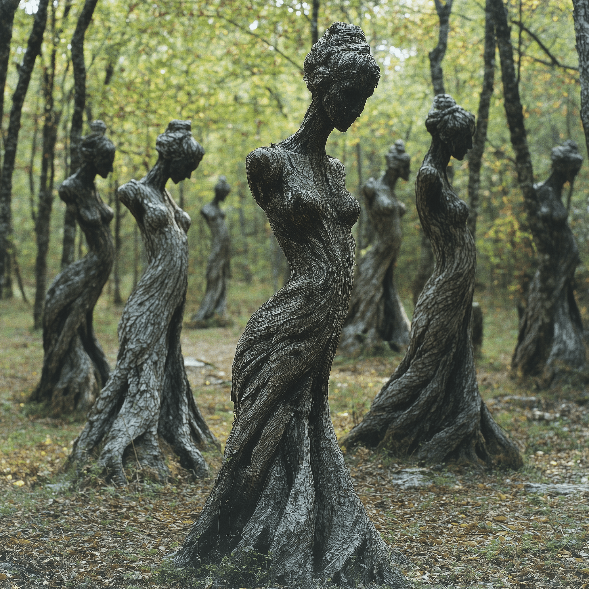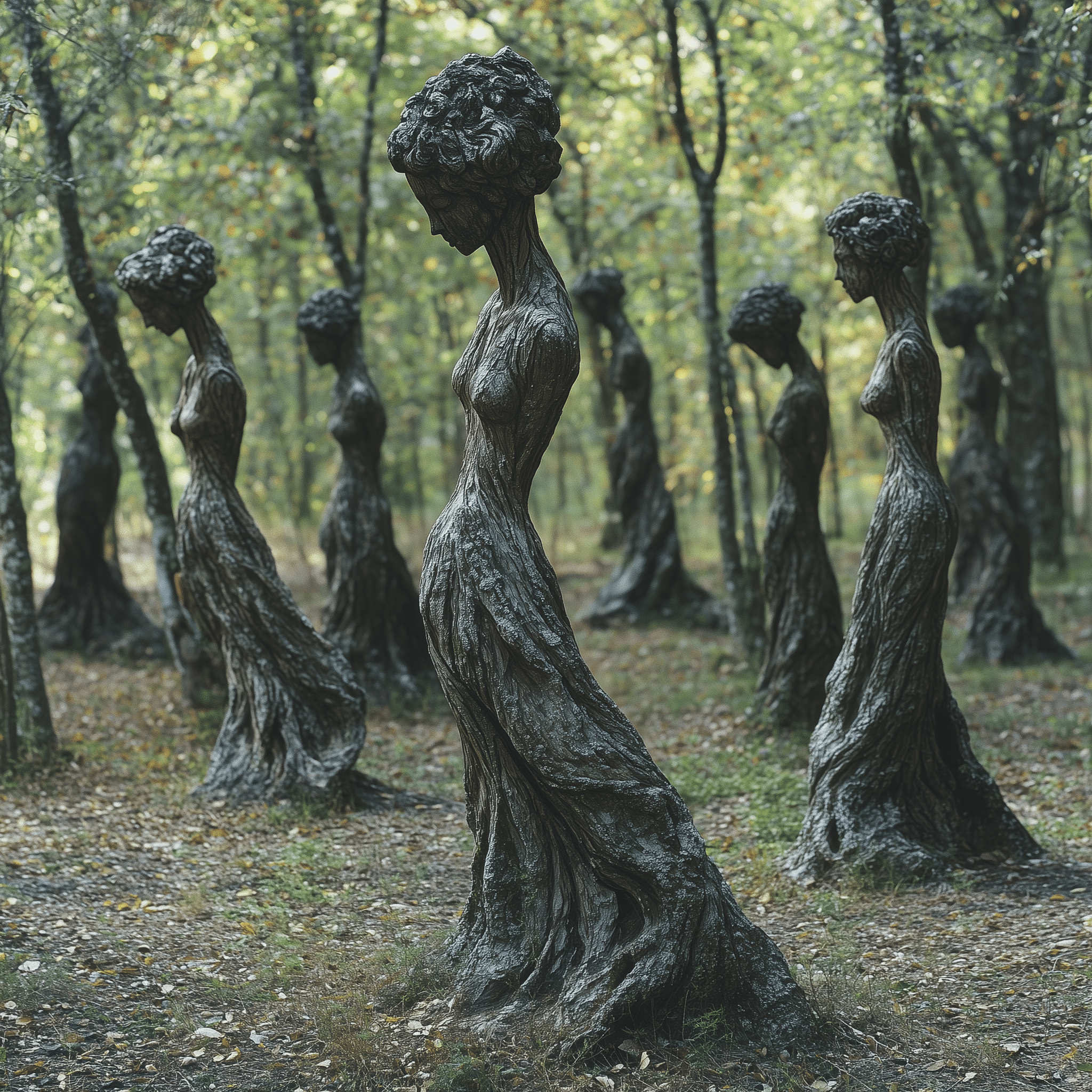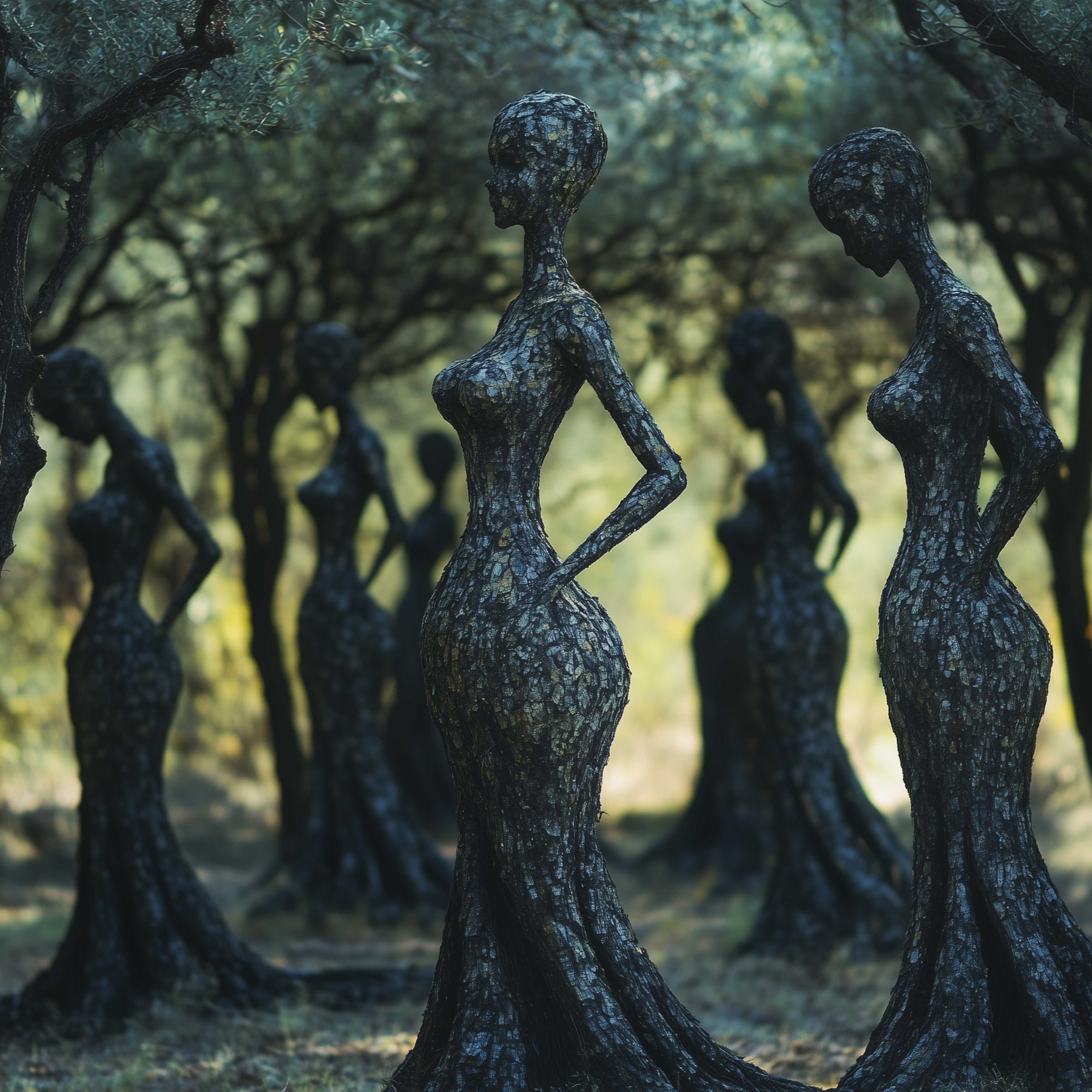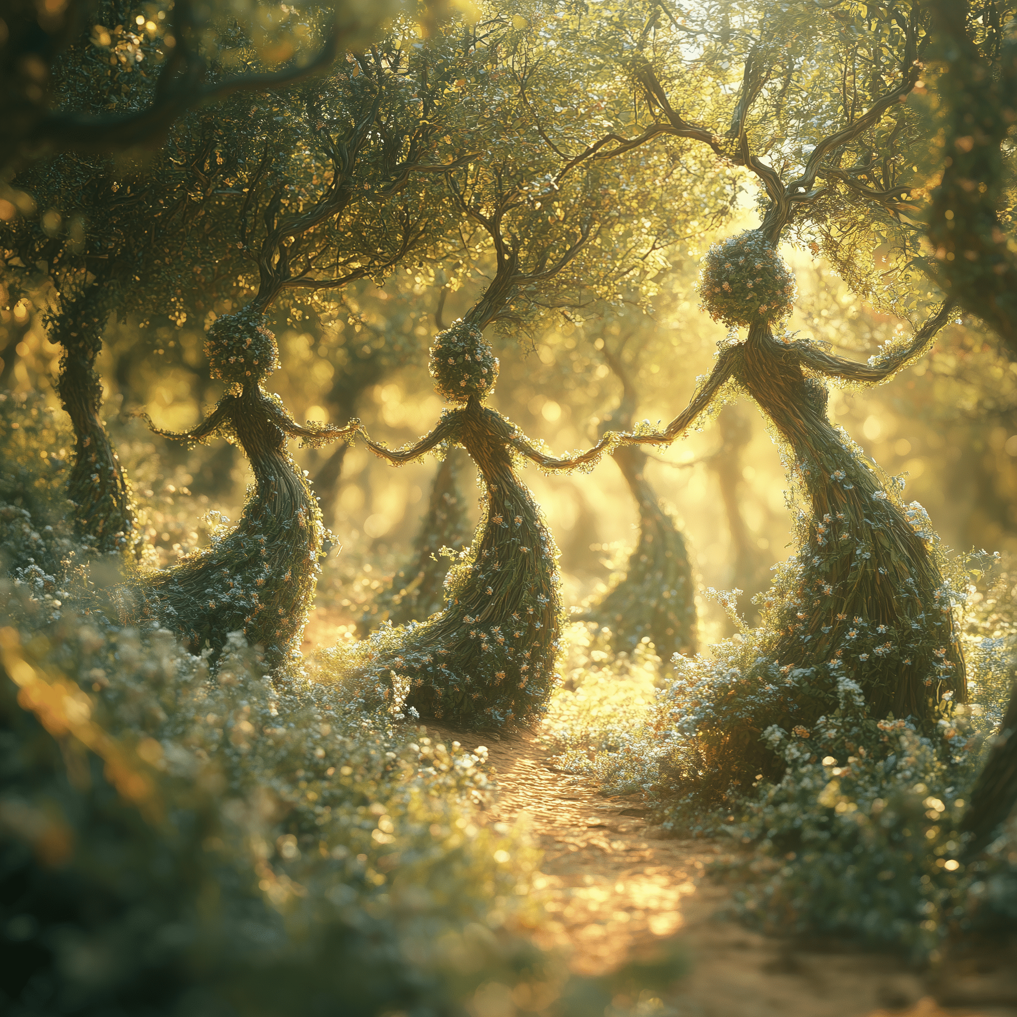 Ancient forms, half-human, half-tree, reach for a sunlit sky.