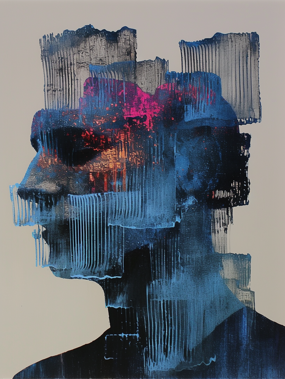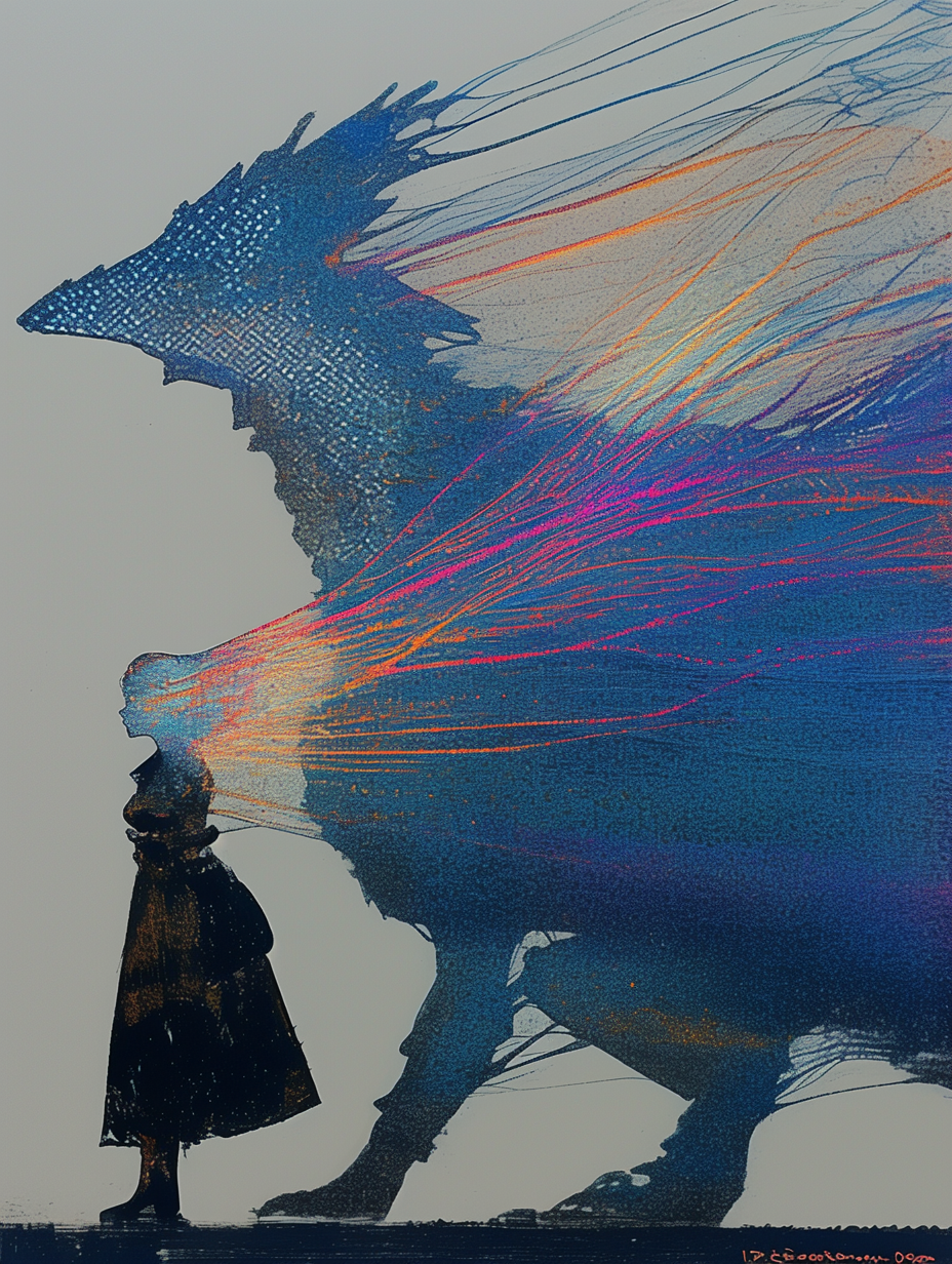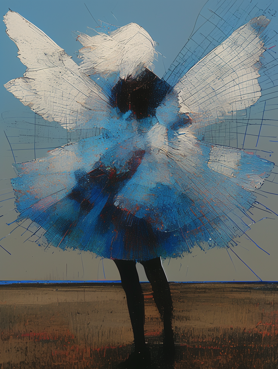 A surreal journey through fragmented consciousness and cosmic whispers, Echoes of the Ethermind captures the delicate tension between self and shadow, thought and tether, dream and dimension. Each figure is caught amid transformation — a fluttering of ideas, memories, or beasts that inhabit the space between reality and imagination. With a blueish palette and painterly textures, these pieces ask one question: What if your thoughts could leave your body and take shape?