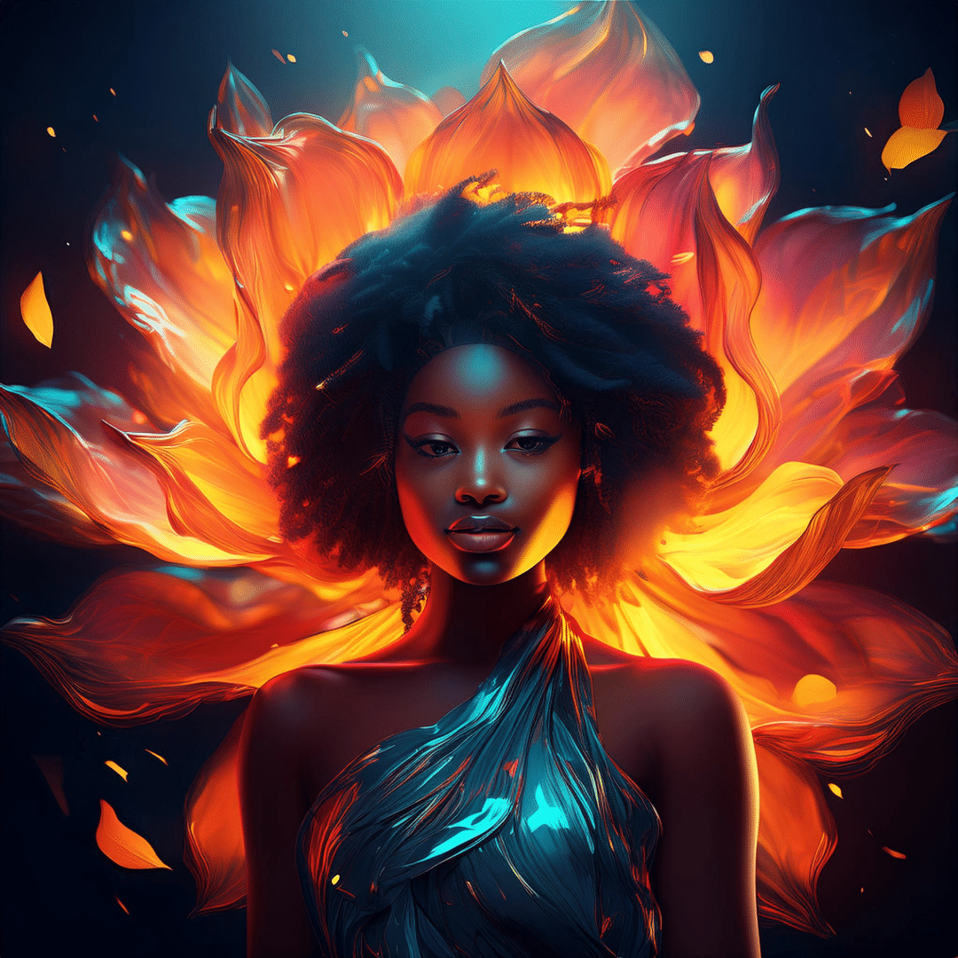 Standing at the center of a vivid tapestry, a girl gazes out with quiet determination, her presence a beacon of strength. Behind her, a magnificent fire flower blooms, its petals unfurling like flames caught in an eternal dance. The vibrant reds and oranges radiate warmth, enveloping her in a cocoon of energy and life.