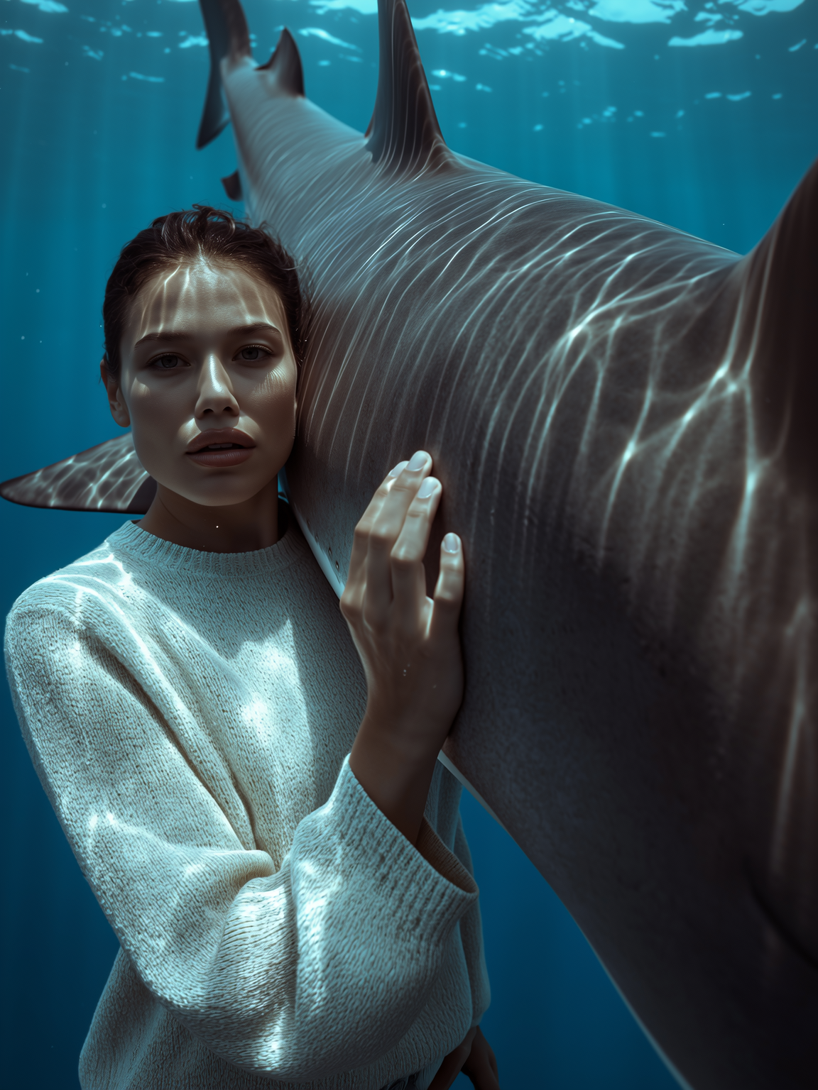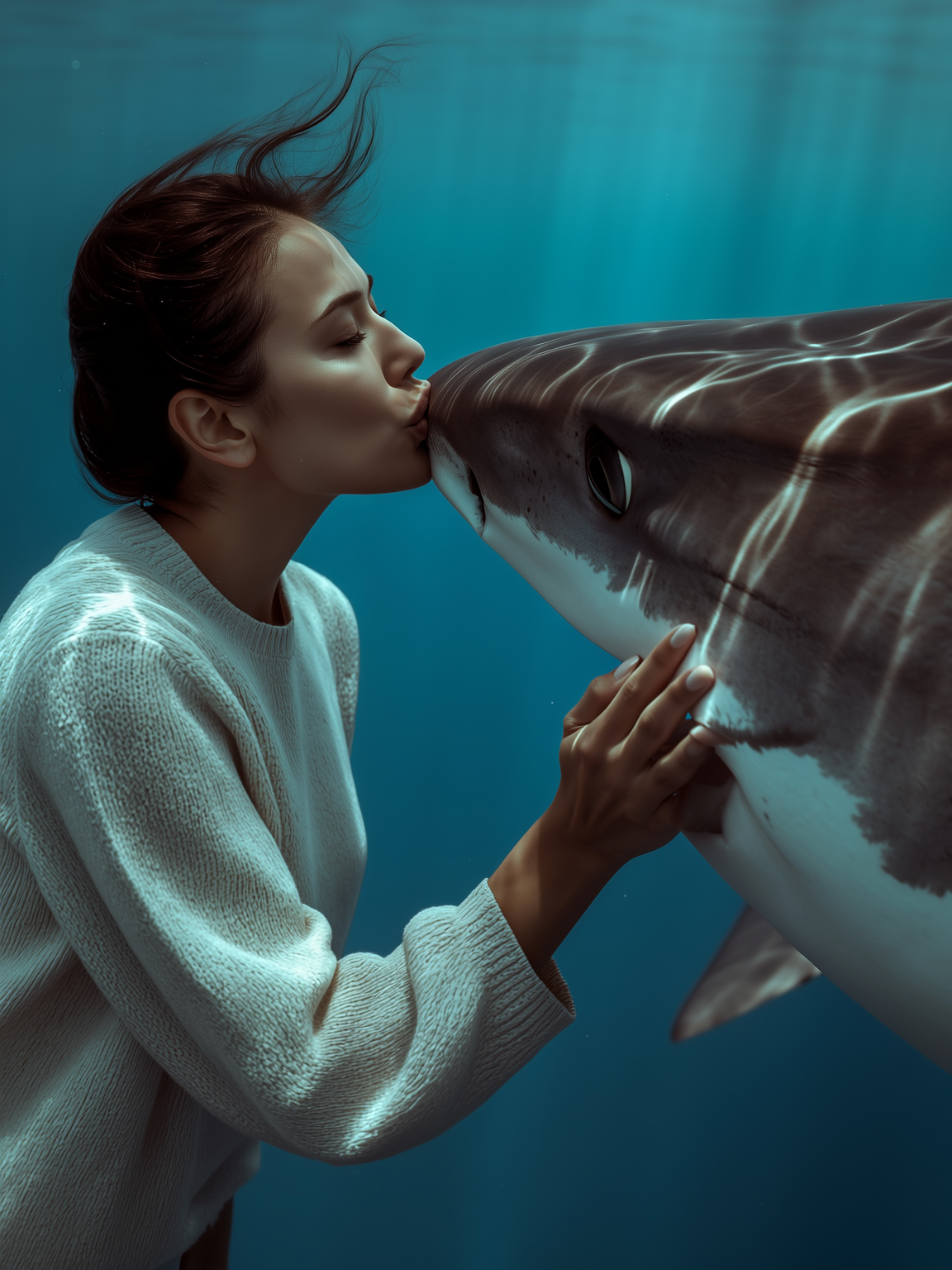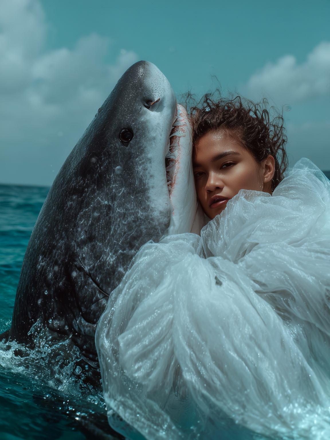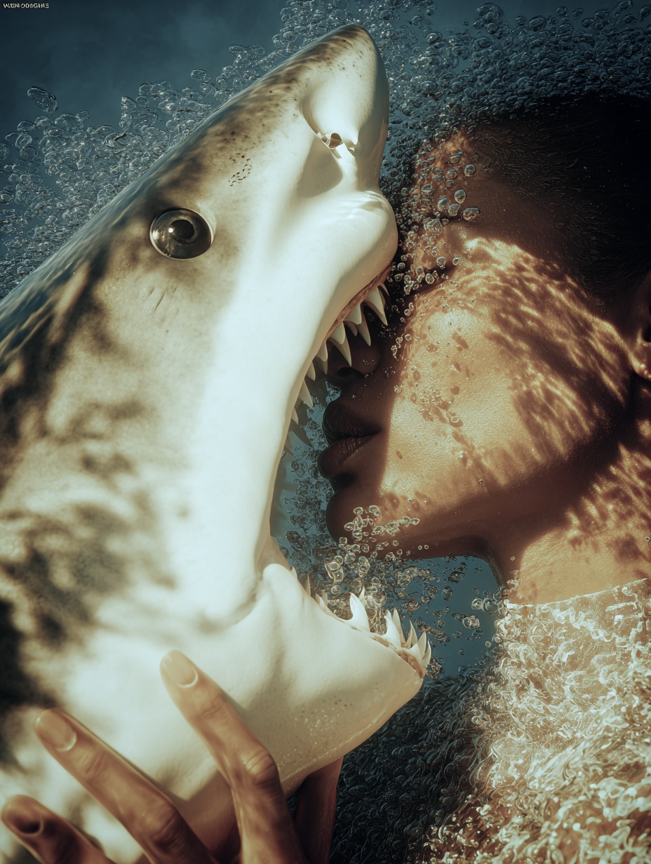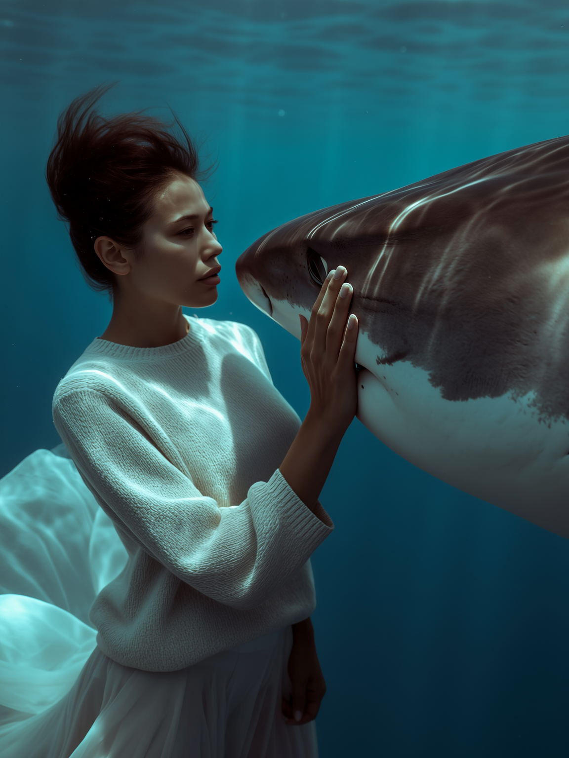 The woman in the frame represents reconciliation — a bridge between humanity and nature, fear and trust. She does not fight the predator; she accepts it. In her touch, hostility dissolves, revealing the shark as a mirror of nature itself — raw, powerful, and serene.