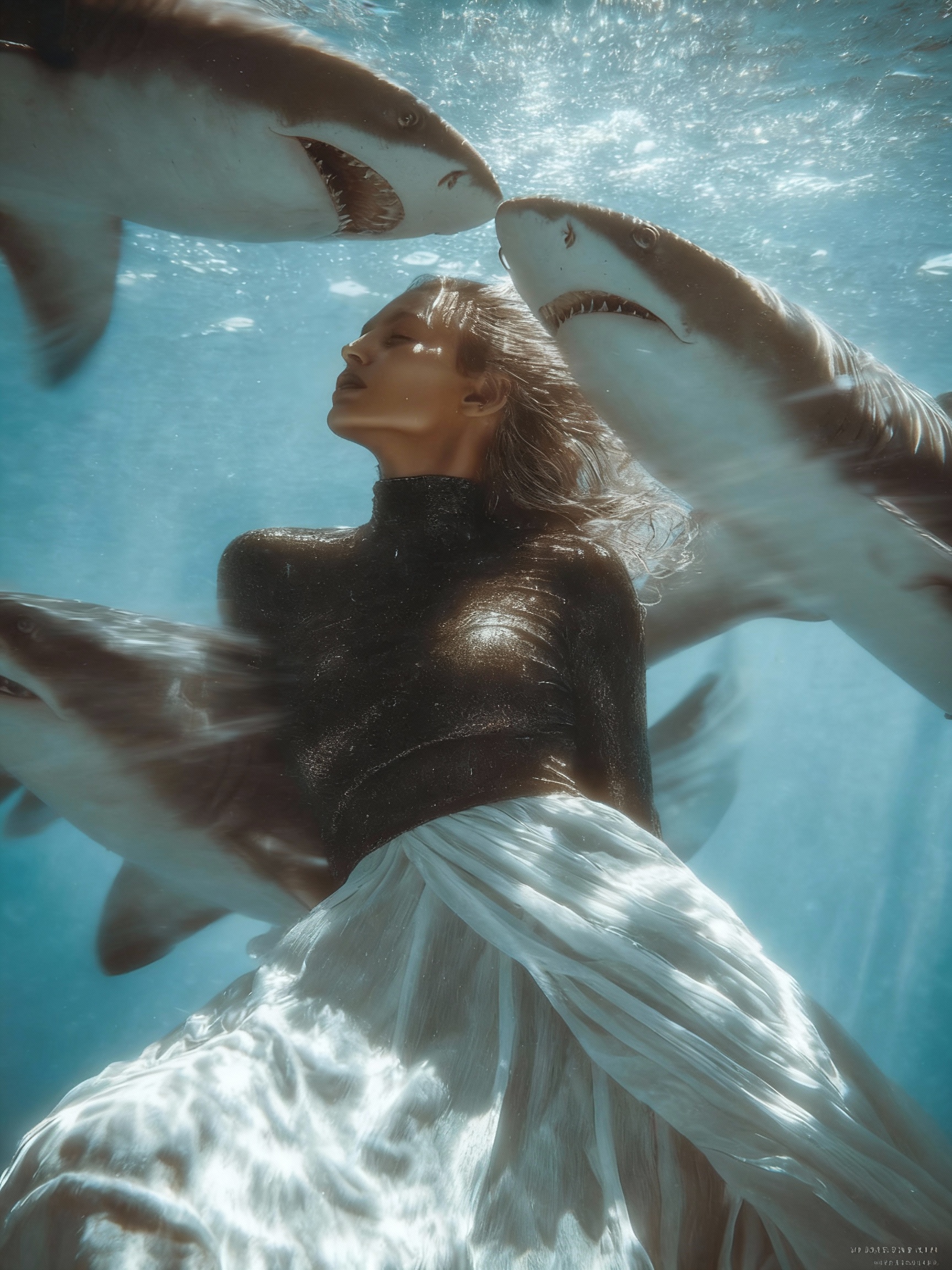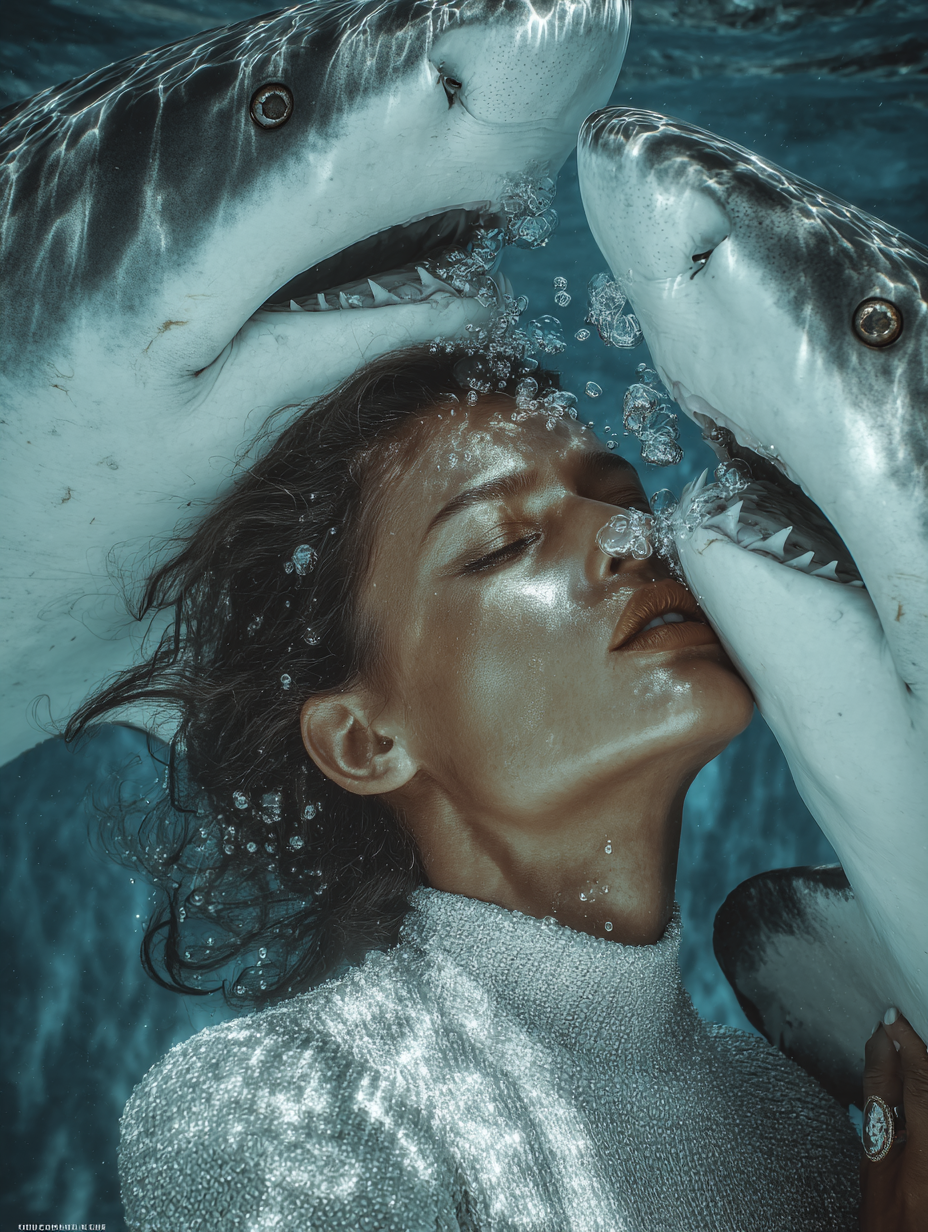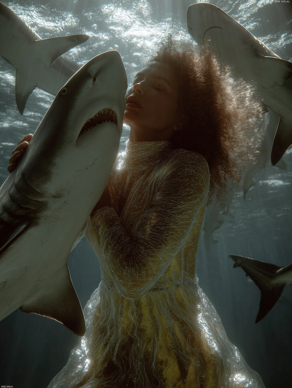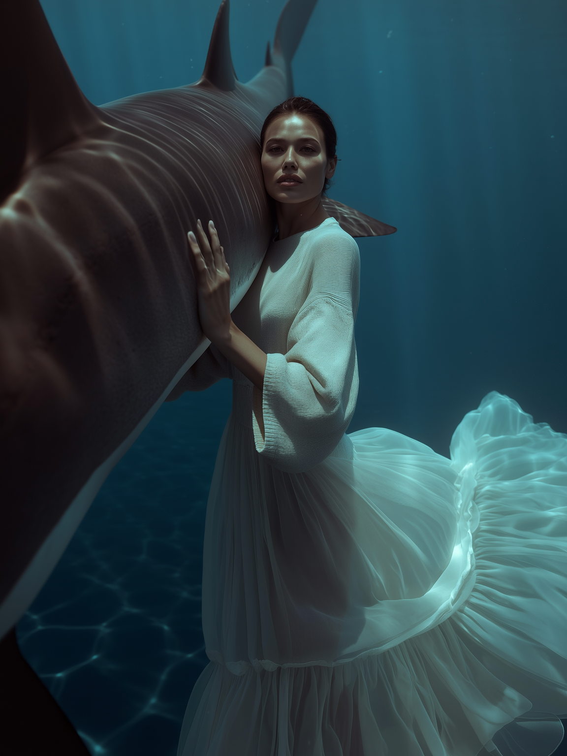 The woman in the frame represents reconciliation — a bridge between humanity and nature, fear and trust. She does not fight the predator; she accepts it. In her touch, hostility dissolves, revealing the shark as a mirror of nature itself — raw, powerful, and serene.
