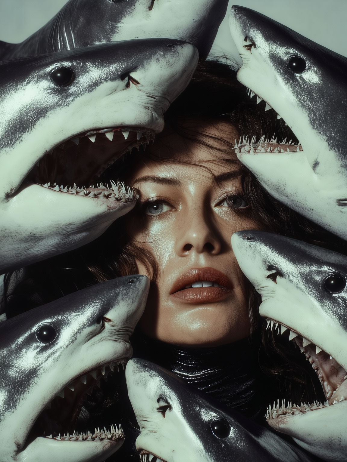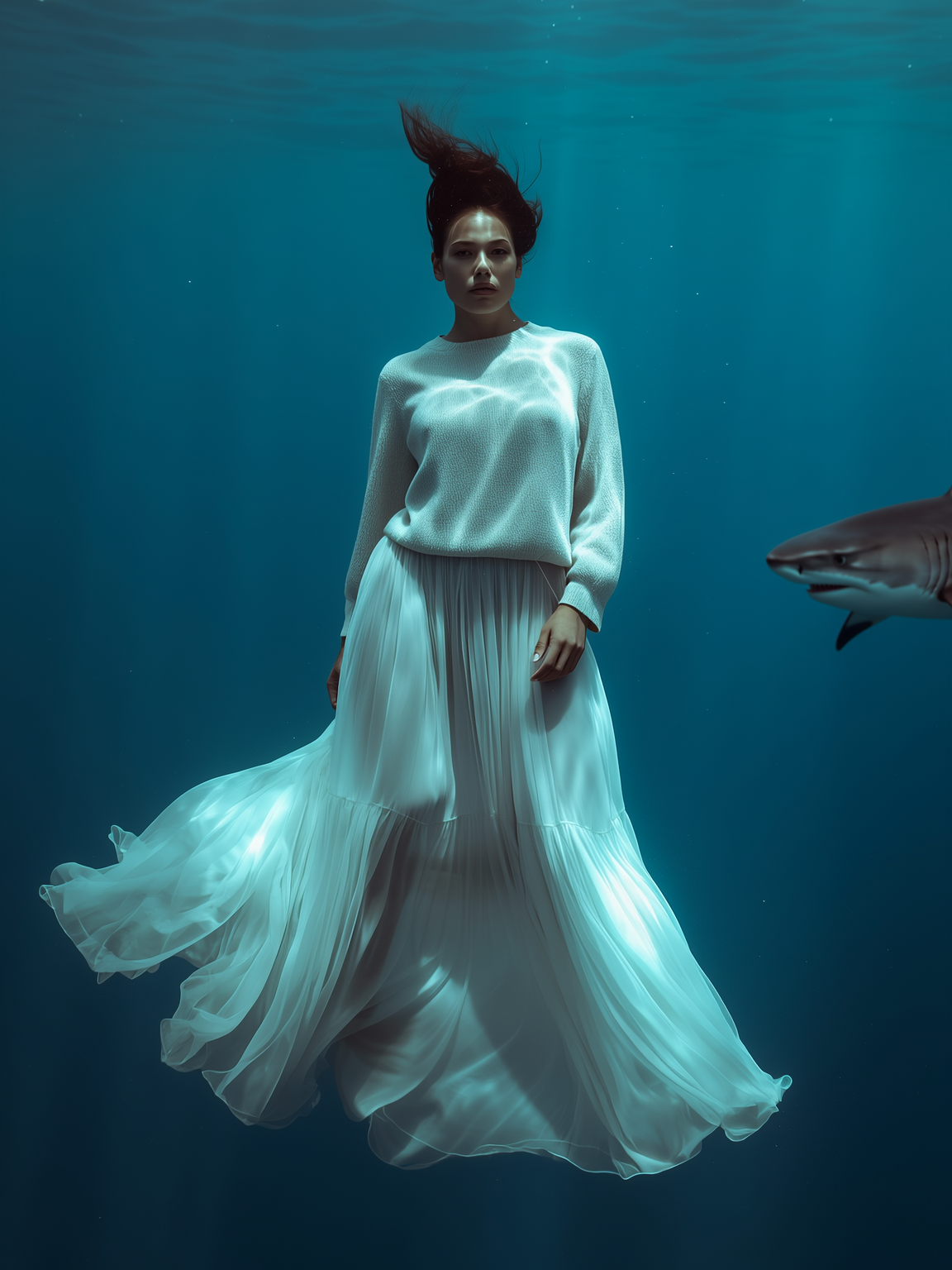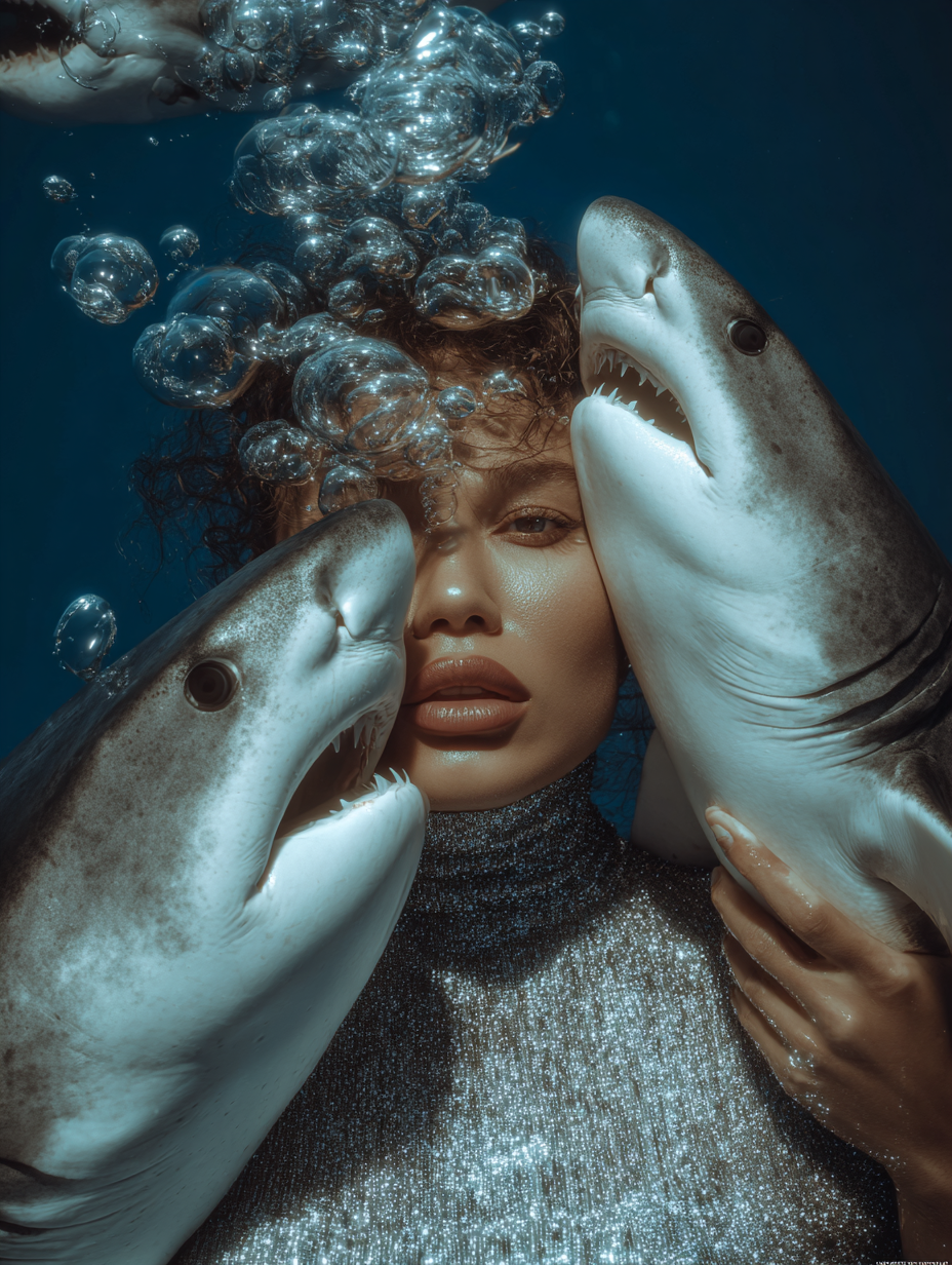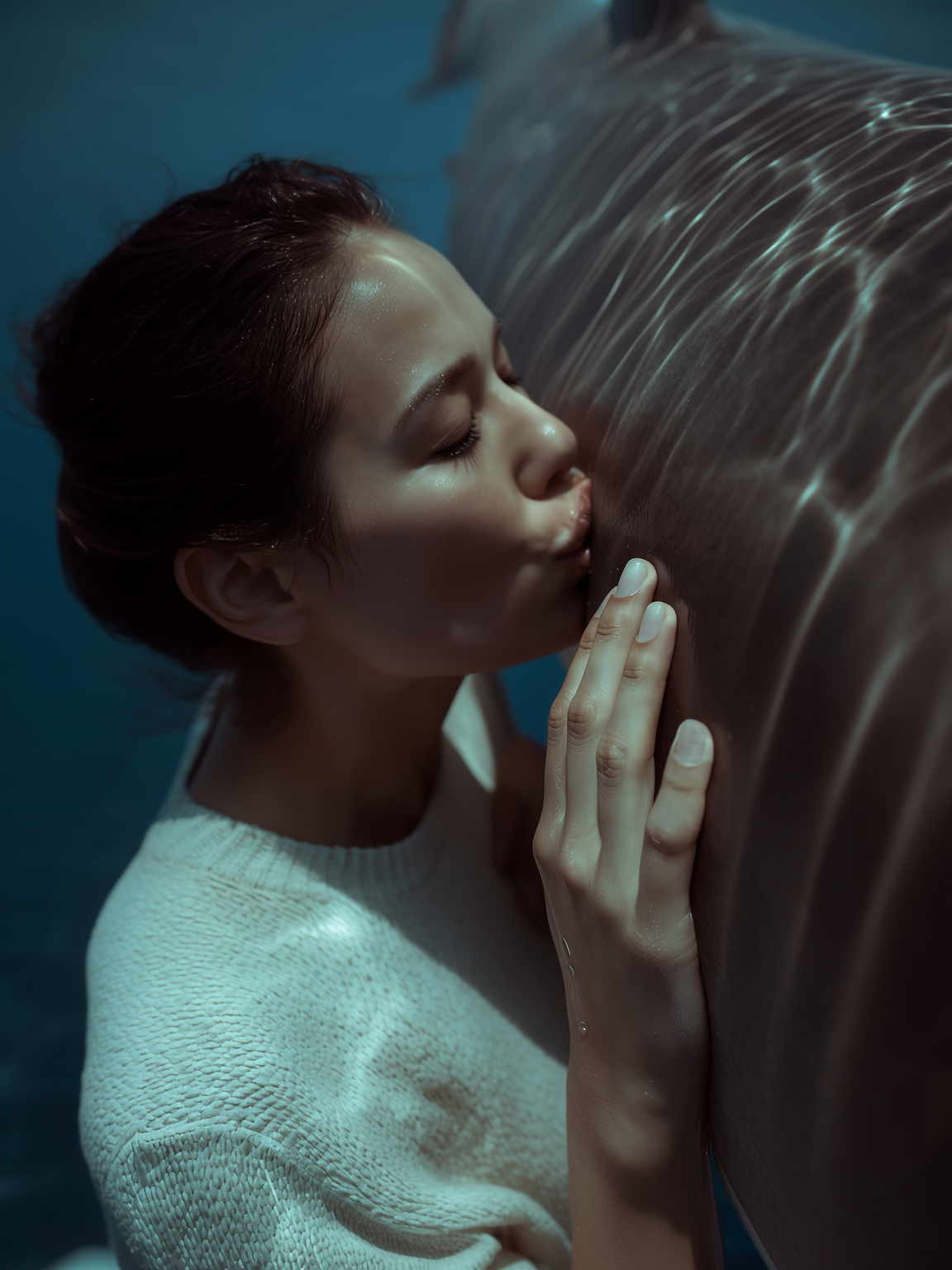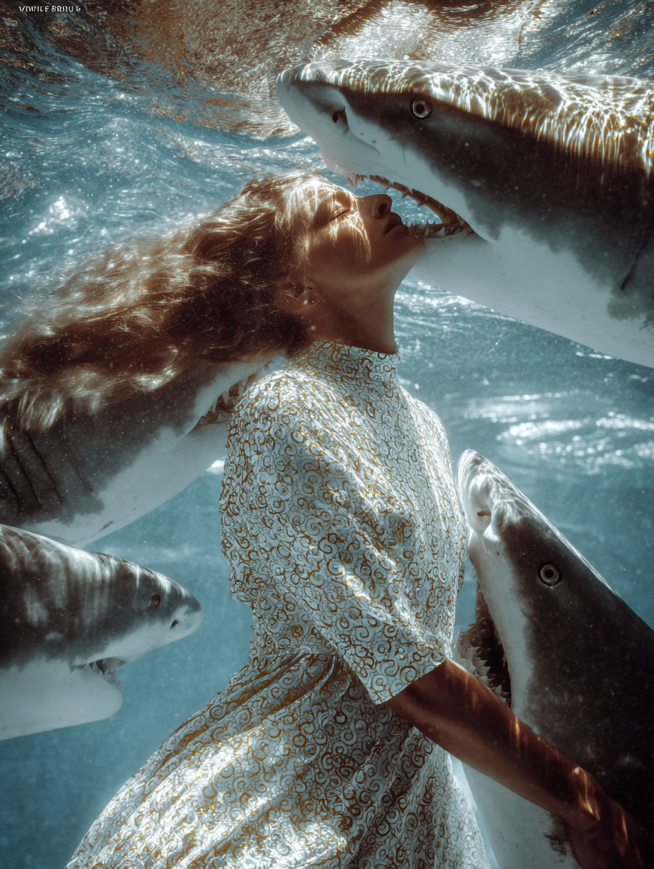 The woman in the frame represents reconciliation — a bridge between humanity and nature, fear and trust. She does not fight the predator; she accepts it. In her touch, hostility dissolves, revealing the shark as a mirror of nature itself — raw, powerful, and serene.