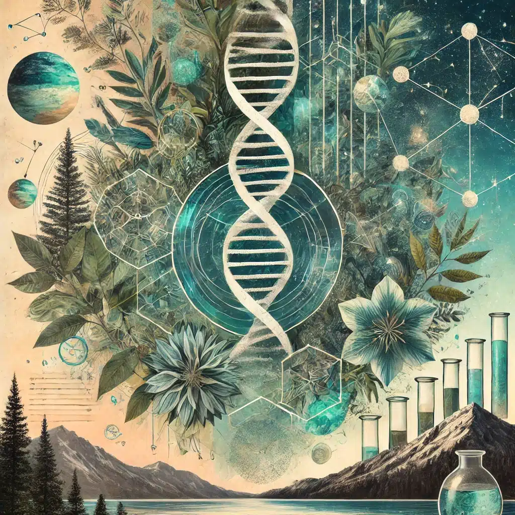 In genealogy, the intertwined DNA helix amidst lush foliage and scientific structures represents our search to understand life’s blueprint. From observing the natural world to unraveling the genetic code, we strive to grasp the essence of what makes us human.