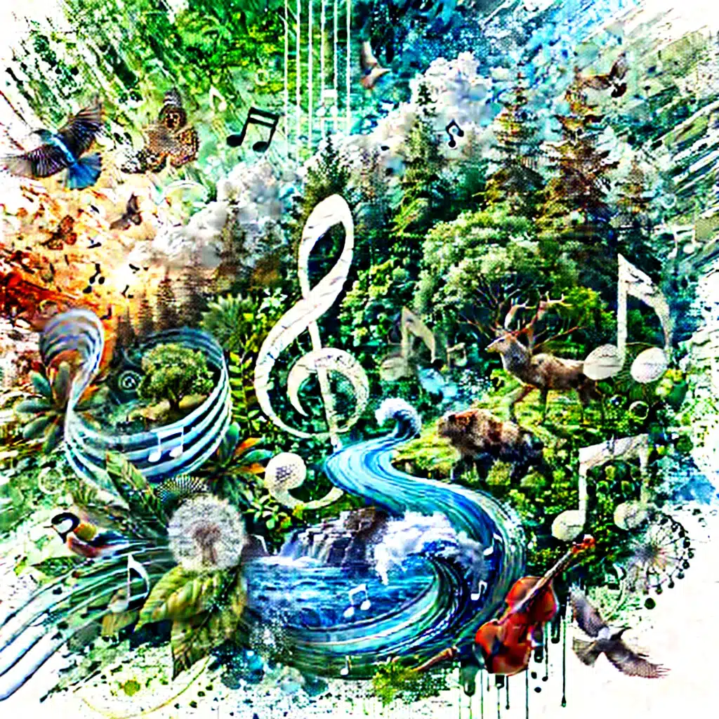 The image of music flourishing from nature suggests that our creative expressions are as fundamental as the rivers and trees. It captures how music, like life itself, evolves and harmonizes with the world around us, resonating across time and culture.