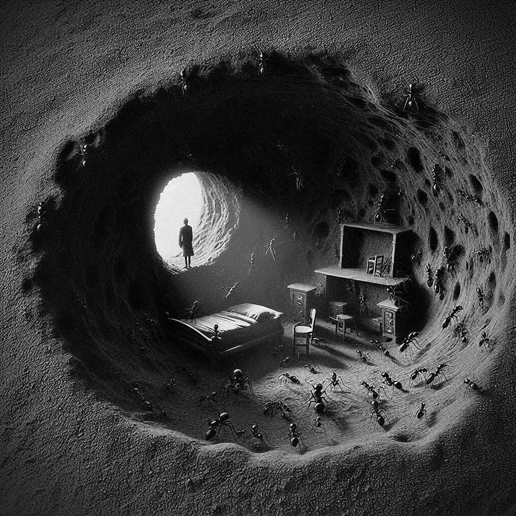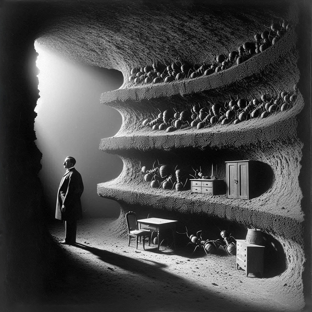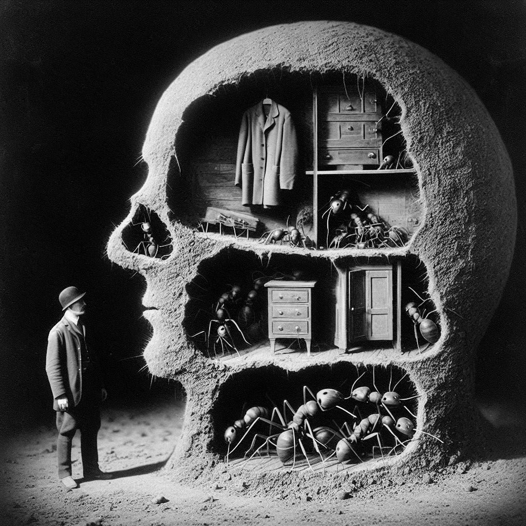 The narrative motifs of Black Romanticism focus on the abysmal and the mysterious. The goal is to evoke irrational fears, superstitious notions, or madness. The series ‘Formicidae’ visualizes this aesthetic by creating a specific spatial constellation in which humans and ants enter into an underground, state-forming symbiosis. In this way, the dualistic model of opposing systems of nature and culture is dissolved, and a new, synergistically interacting superorganism emerges.