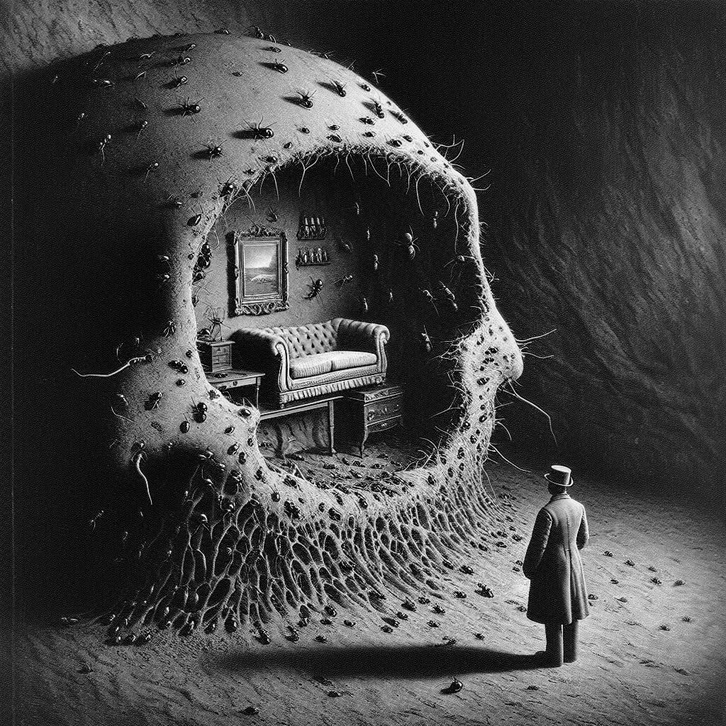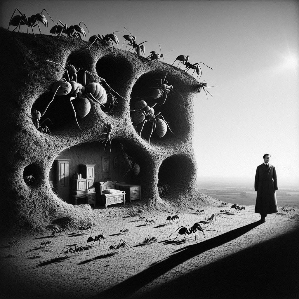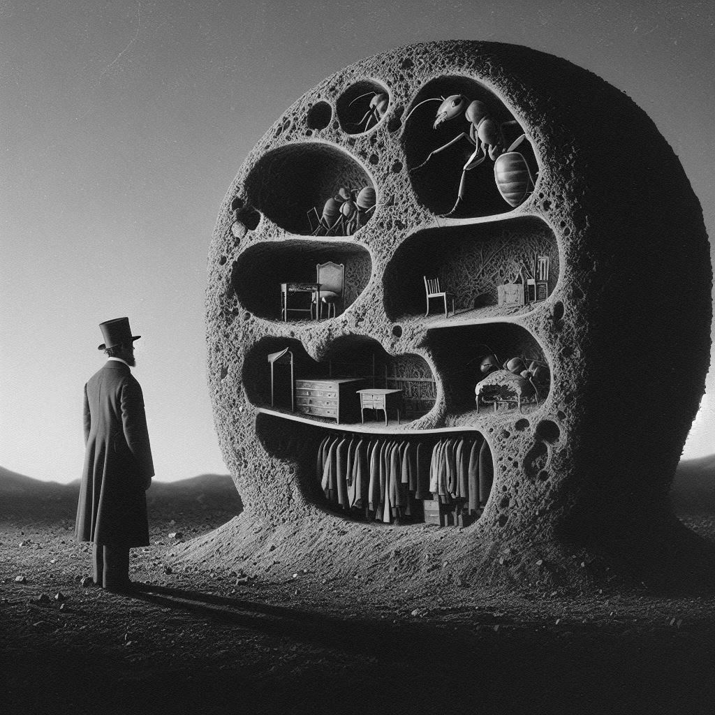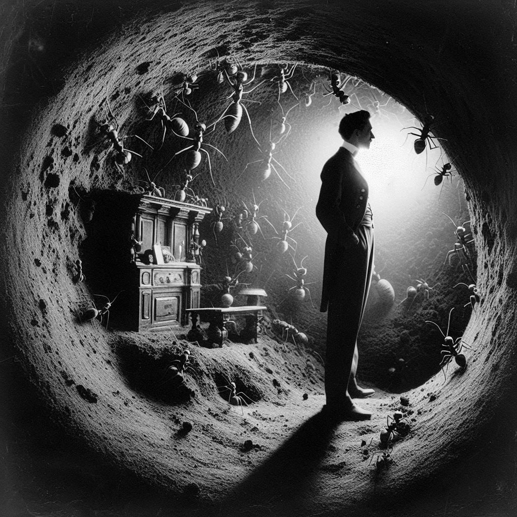 The narrative motifs of Black Romanticism focus on the abysmal and the mysterious. The goal is to evoke irrational fears, superstitious notions, or madness. The series ‘Formicidae’ visualizes this aesthetic by creating a specific spatial constellation in which humans and ants enter into an underground, state-forming symbiosis. In this way, the dualistic model of opposing systems of nature and culture is dissolved, and a new, synergistically interacting superorganism emerges.