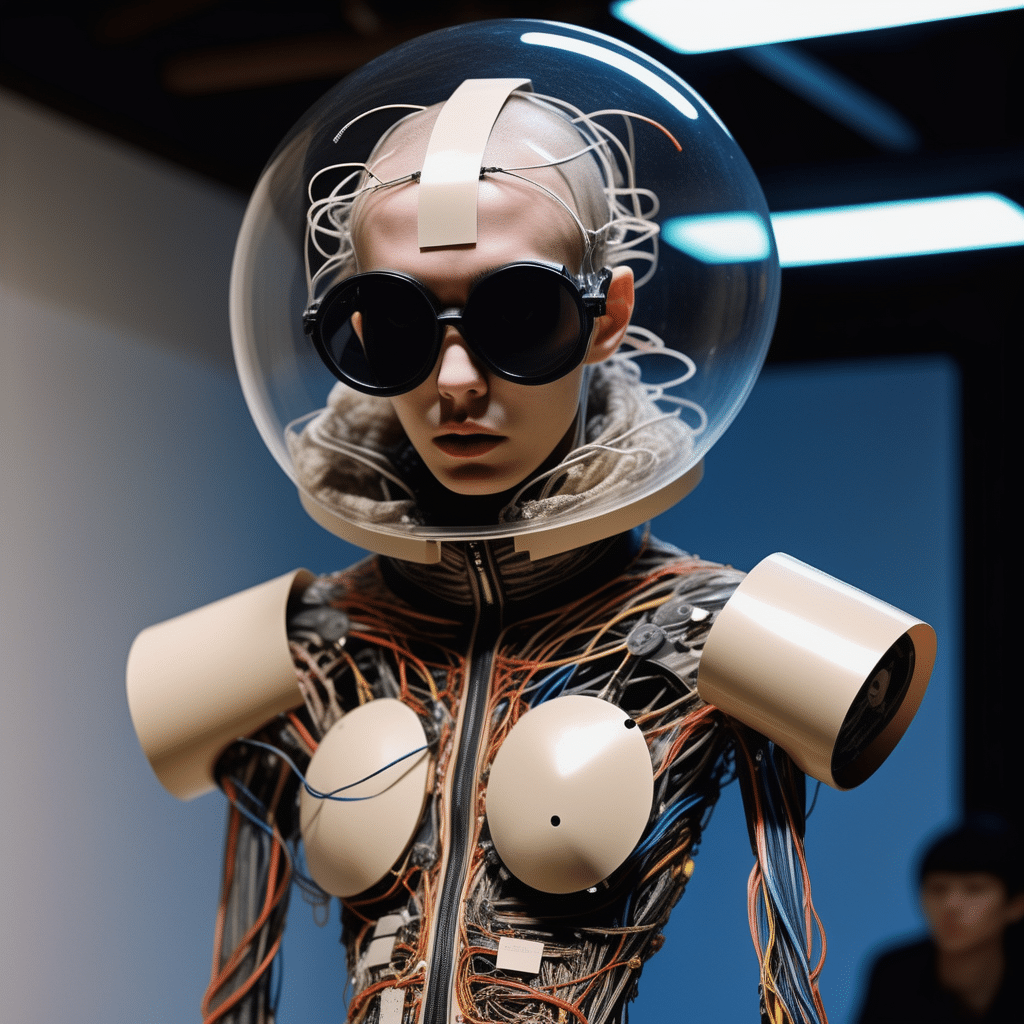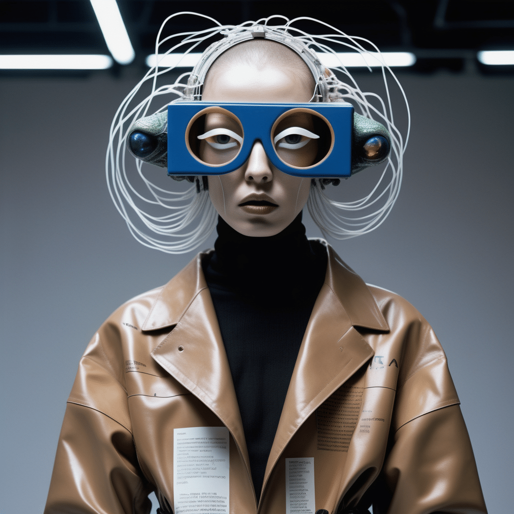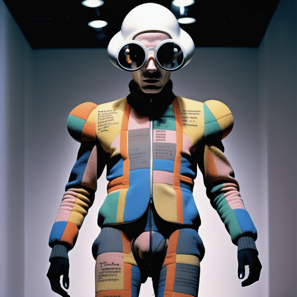 Since the artist cannot be able to understand the true reasons for his ideas in the conventional creative process, I have looked for a way to instruct and guide the image-generating AI with art-specific instructions and vocabulary, which underpins the main theme (functional clothing for a not-so-fictional future / fashion design) with academic terms, which I in turn extract from an AI-fed pool consisting of noise of art-related technical terms by random generator.
