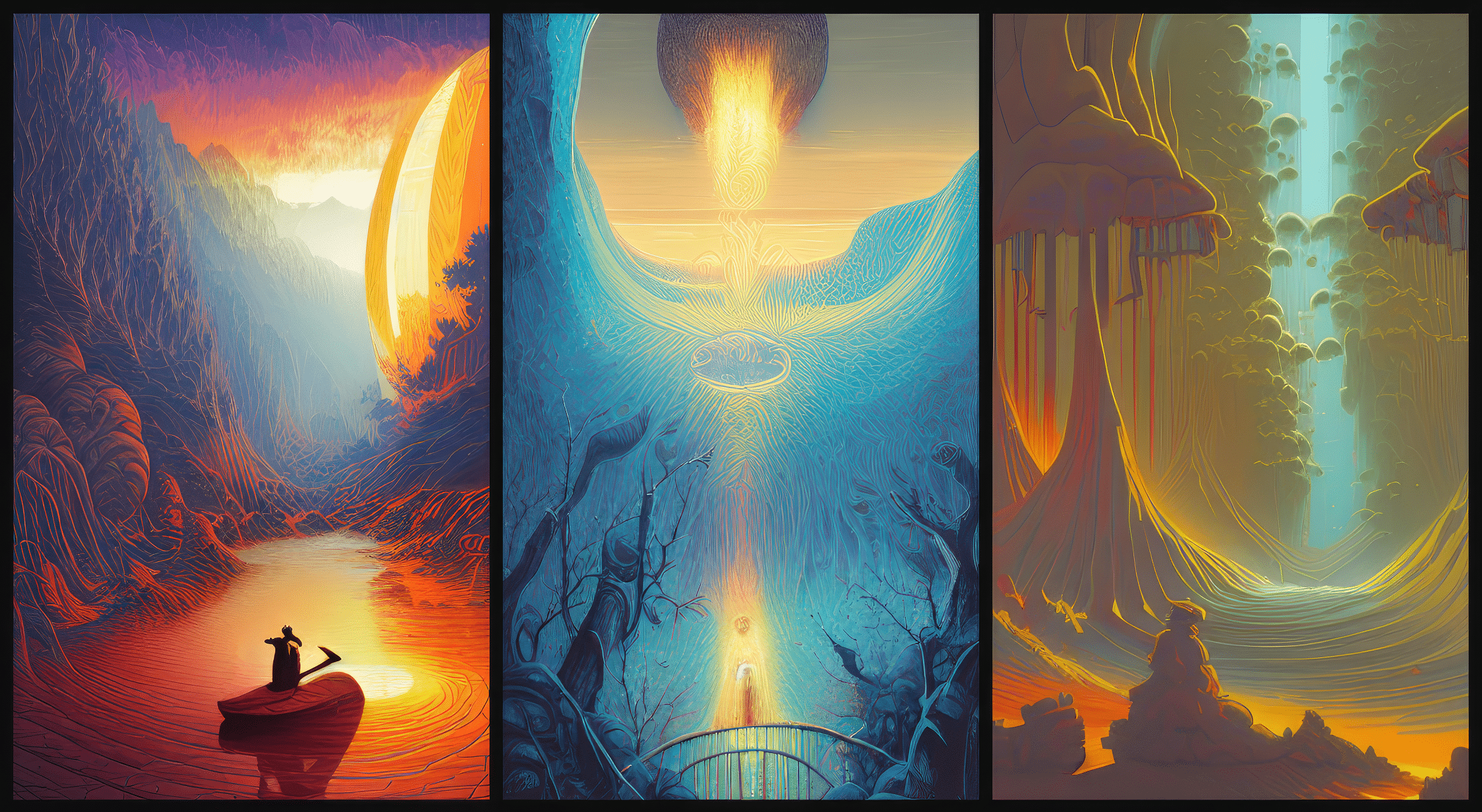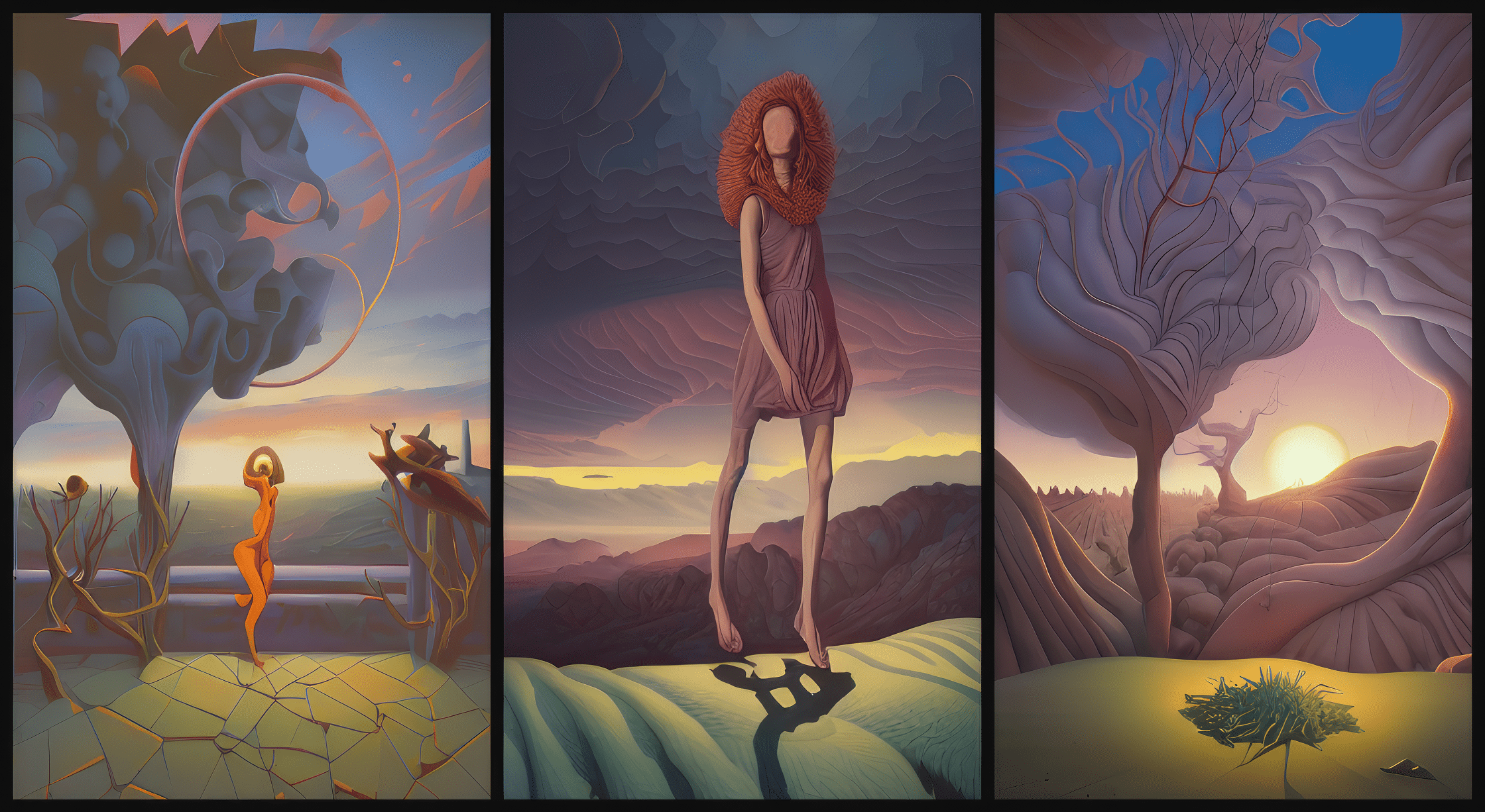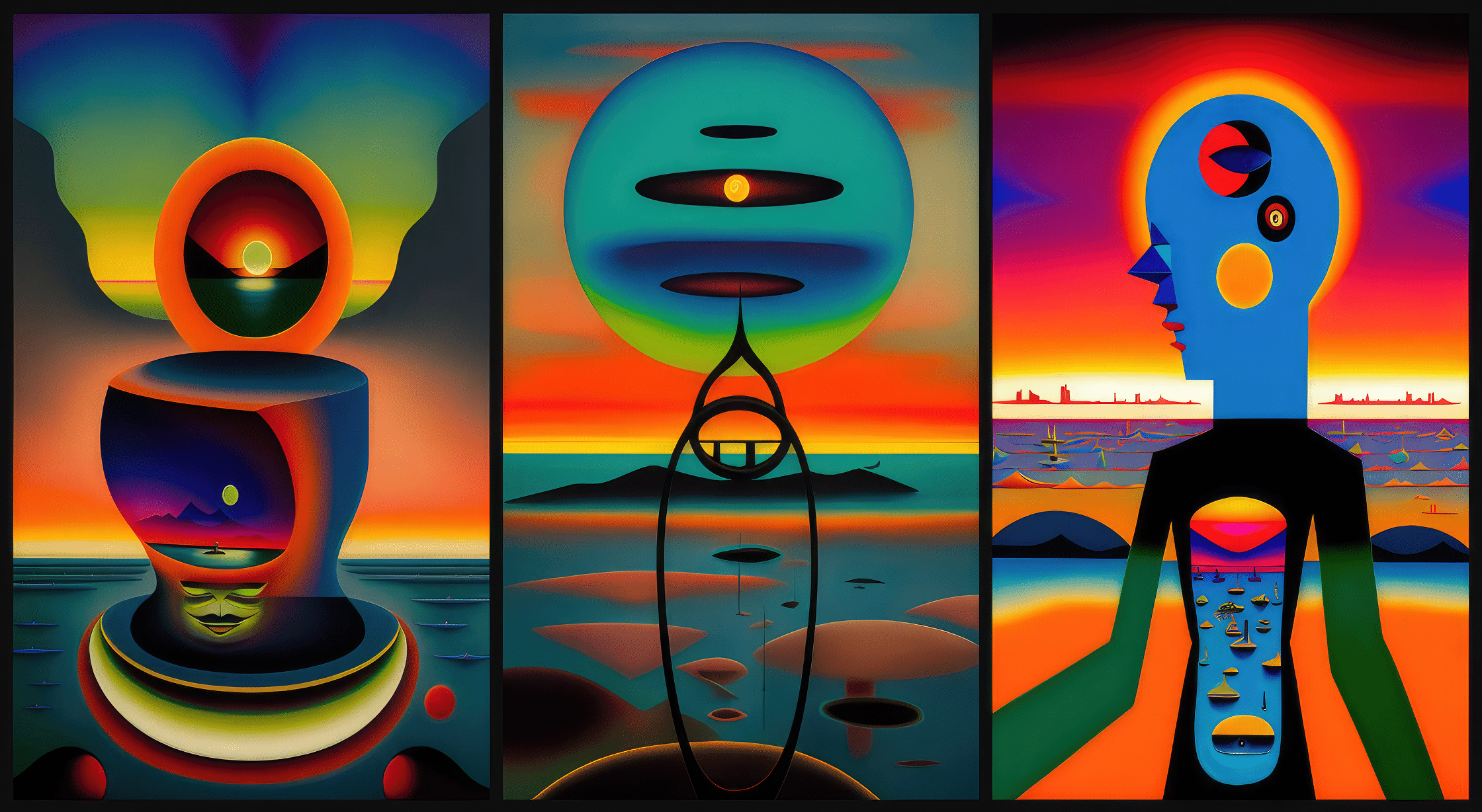 The triptych “Sunset Over the Bay” is conceived as a spiritual philosophical journey that, combining abstract forms with futuristic landscapes, tries to awaken in the viewer a sense of cosmic harmony and merging with the world around him.