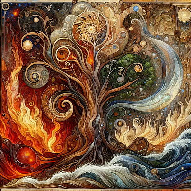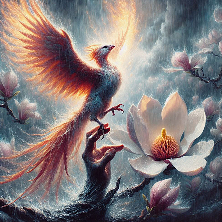 Using elements adjacent to nature, I portray the growth out of the vicious cycle of water-earth-wood-fire-ash and back to water. The outstanding prerequisite of life is the will to grow with the catalyst of adversity. The phoenix is akin to the flower. * I credit the AI with ‘the helping hand’ idea uplifting the phoenix.