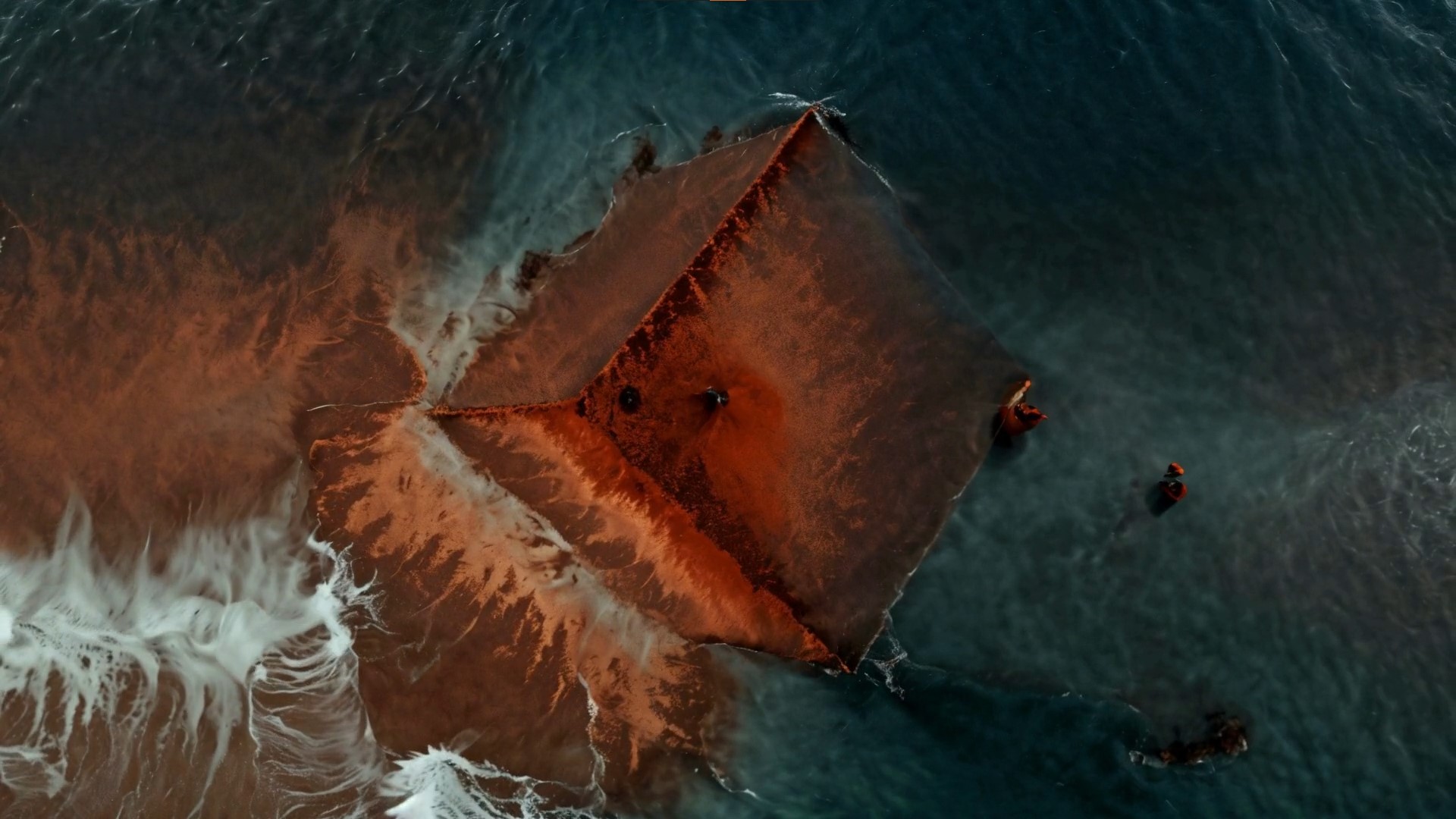 A hypnotic exploration of identity and transformation. A cube rotates endlessly, its surfaces shifting between turbulent waters, writhing figures, and abstract textures in rust orange and muted blue. The form remains constant while everything within it flows and changes.