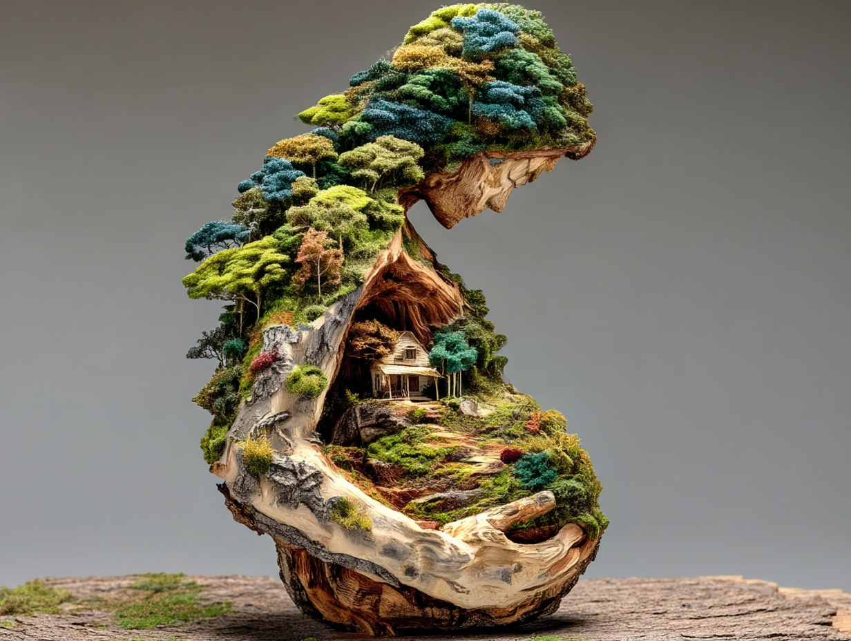 At the center of the composition stands a monumental feminine figure carved from living wood, holding a small house in her hands. This image is layered and symbolic. The Mother embodies the archetype of the Earth — the origin of life and protection. Her body is the planet itself: ancient, alive, and fertile. From her form grow forests; from her essence, humanity emerges. She is not merely a guardian but a manifestation of continuity — of the cycle of birth, decay, and renewal.