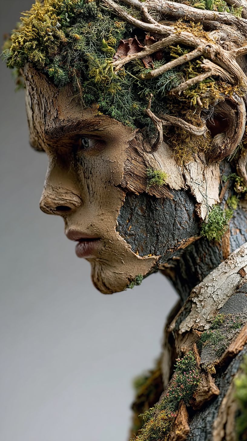 The forest growing across her body represents the consciousness of nature itself — its memory, intuition, and endless self-renewal. The trees are thoughts; the roots are the past; the leaves are the breath of life.