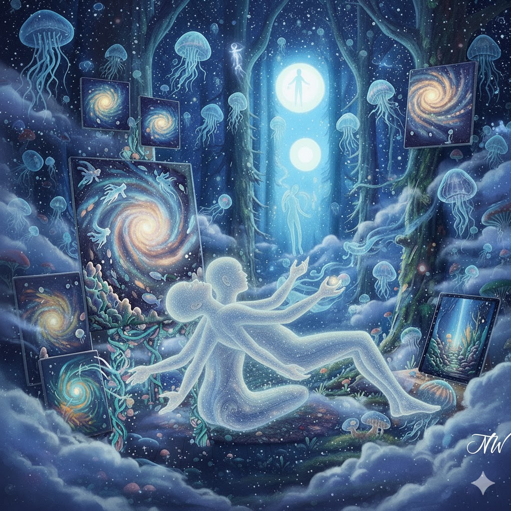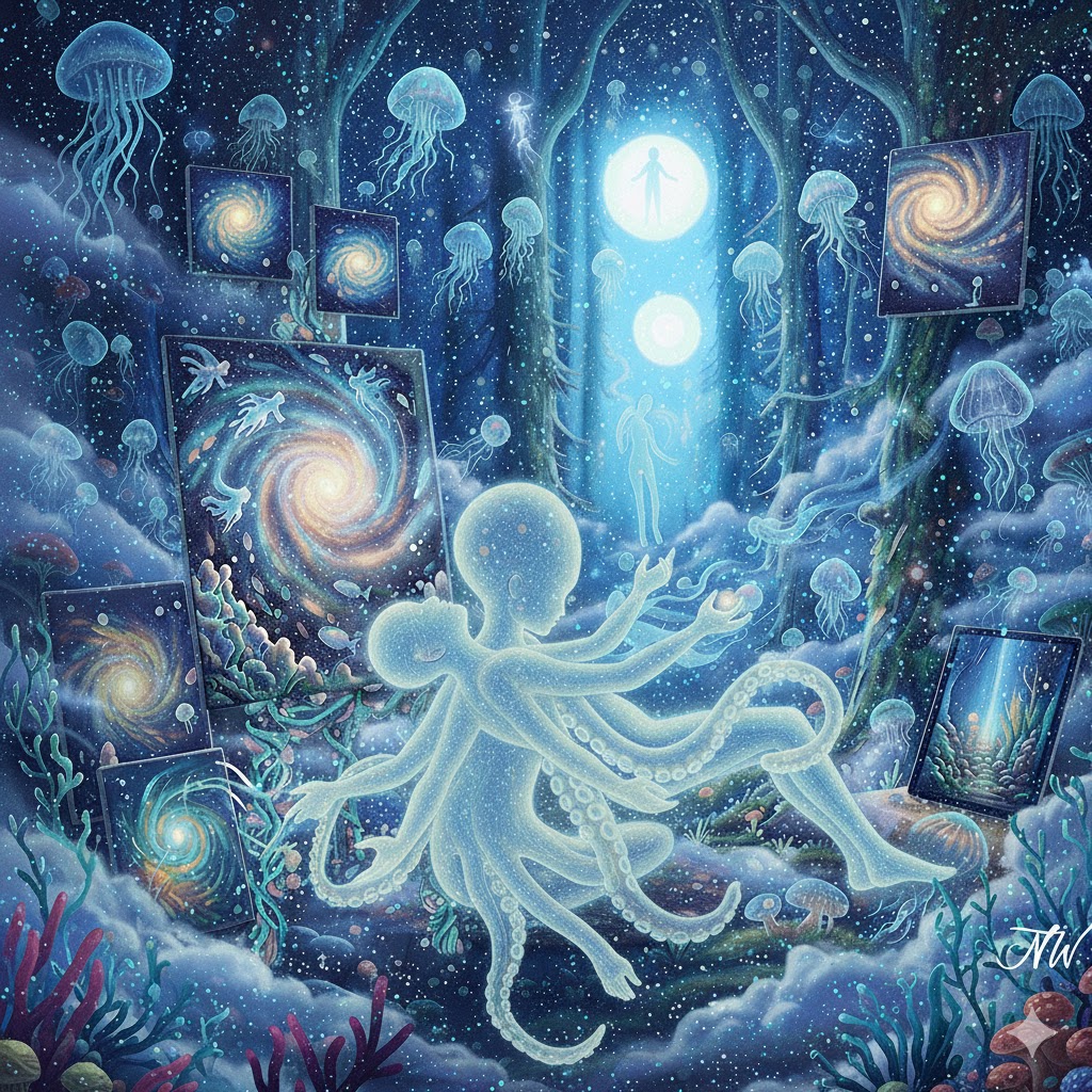This short video combines digital painting and gentle motion flow to evoke a sense of unity between consciousness and cosmos. The fluid animation symbolizes the continual act of becoming — a reminder that creation is not a moment, but a movement.