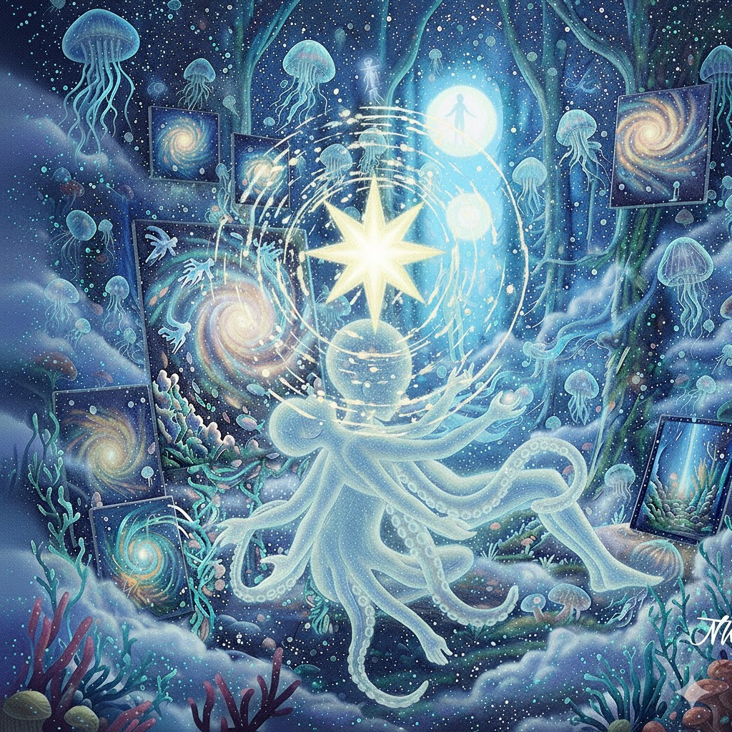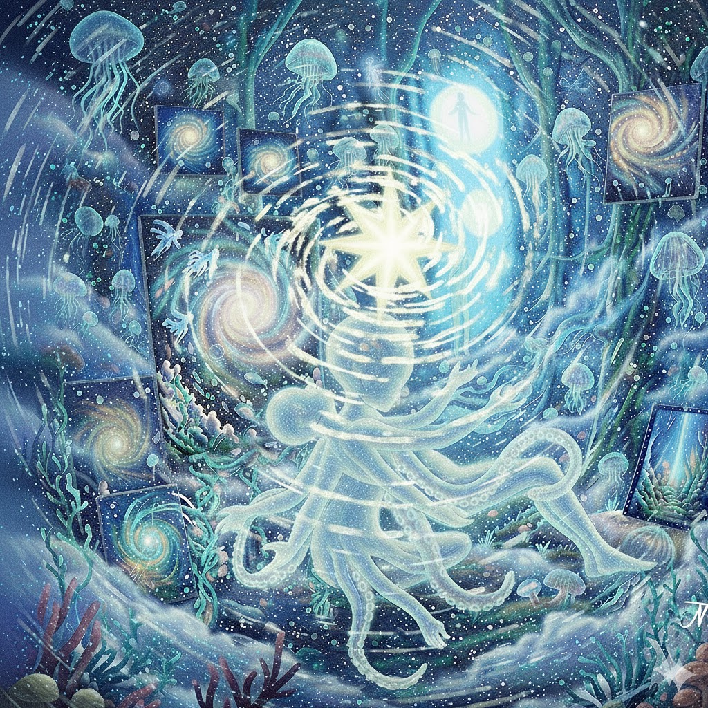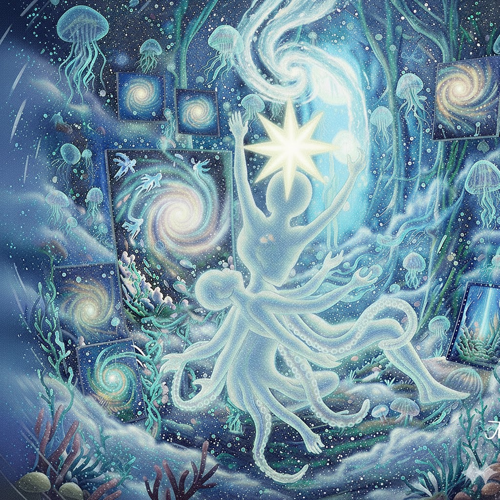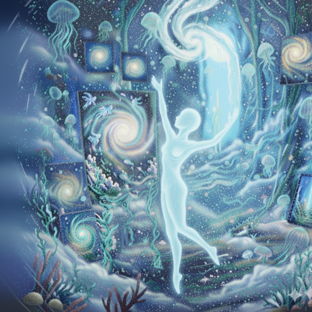 Within a cosmic ocean of stars, galaxies, and luminous currents, a translucent being emerges from the void, rises toward light, and dissolves once more into the infinite.