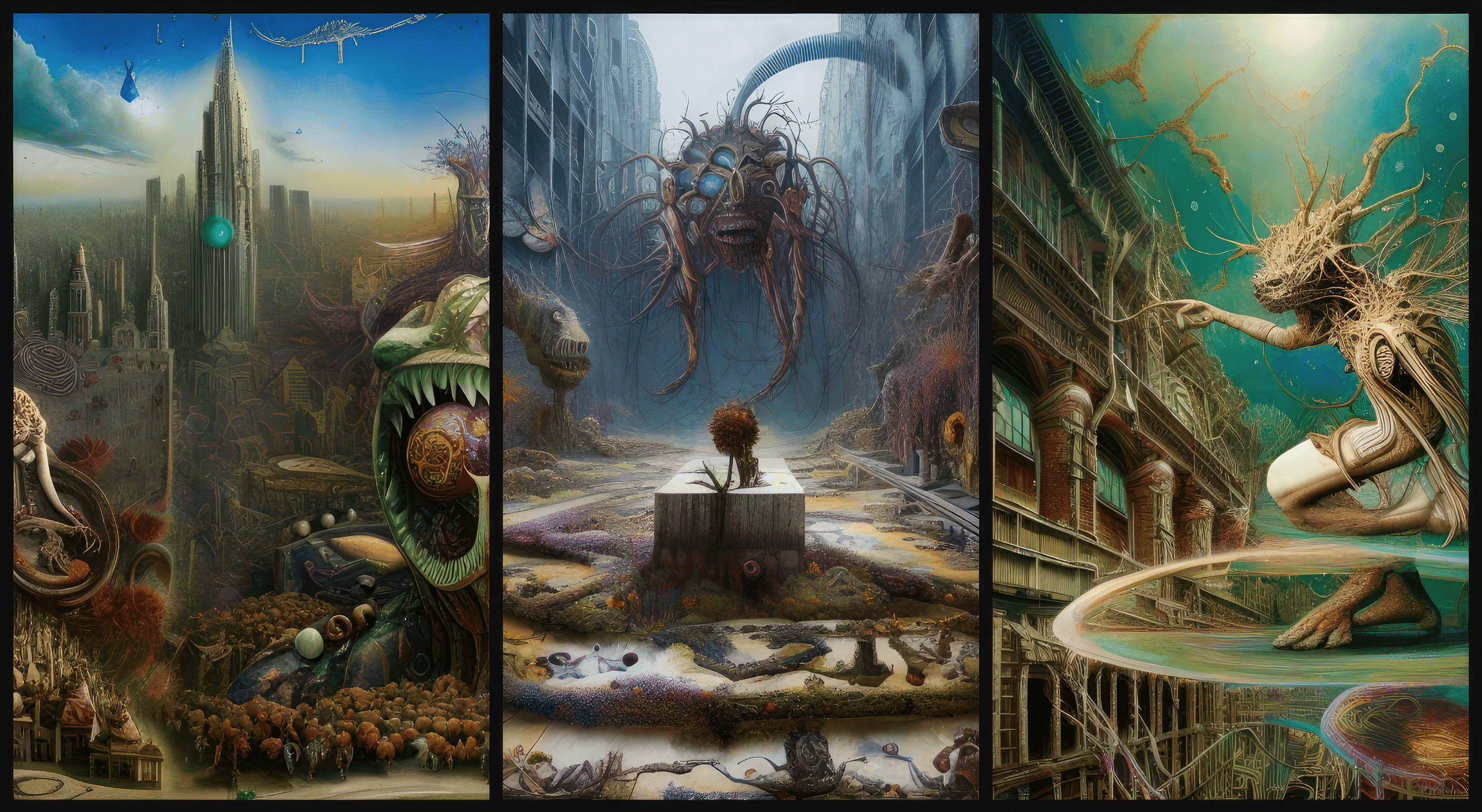 The inspiration for this work is the 21st century, the century of knowledge and great scientific breakthroughs (left panel), but also a hint of self-destruction (central panel), through the danger of global warming and environmental pollution. Finally, there is the right panel, which depicts a lone snake-like creature emerging from the ground in a desolate landscape, illuminated by a morbid glow from the sun.