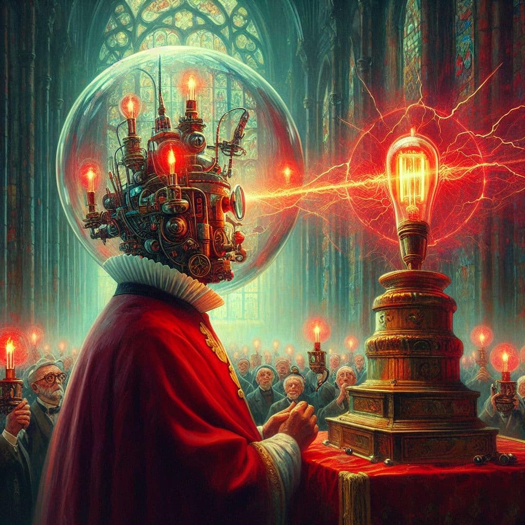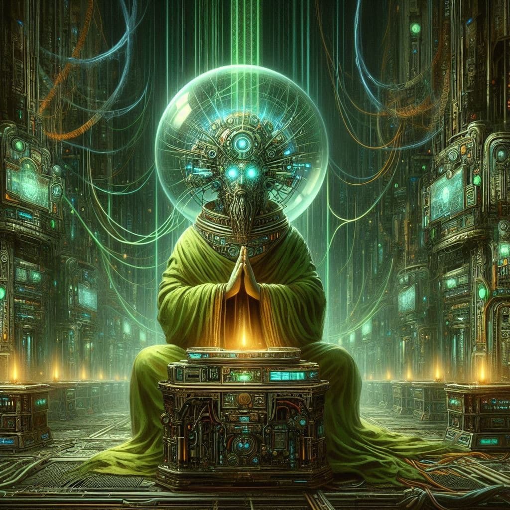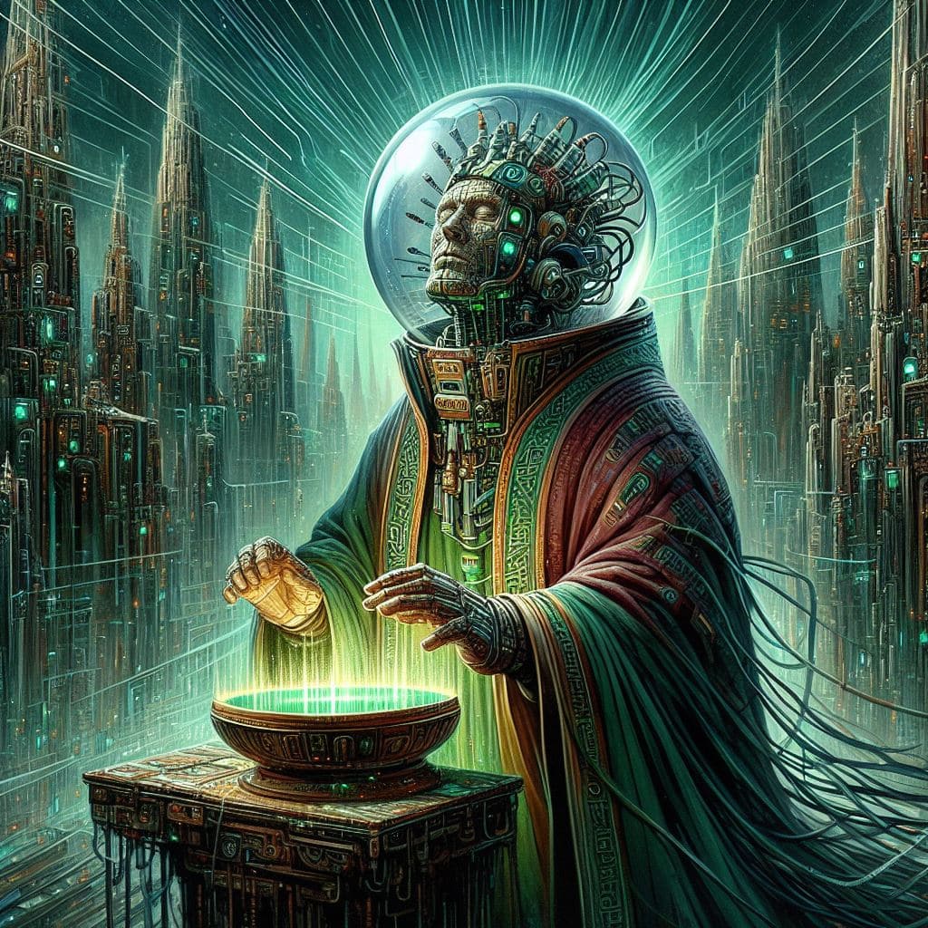In a bleak and desolate future, where hope is but a distant memory, a flicker of light emerges. Amidst the shadows, a mysterious cyberpunk sect rises, worshipping the sacred trinity of RGB—Red, Green, and Blue. They whisper of a prophecy, foretelling the arrival of a new light bearer who will illuminate the darkness. Their priests, entwined with invisible beams of light, commune with the celestial source that breathes life from the heavens. As the sect’s influence spreads, the world braces for the dawn of a new era, where technology and mysticism collide in a battle for the soul of humanity.
