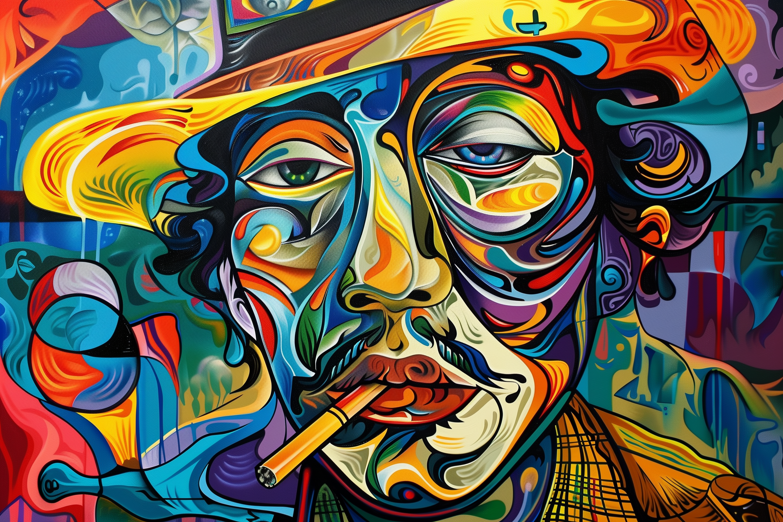 This artwork depicts an abstract portrait of a man smoking a cigarette. Bold, swirling colors and intricate patterns create a sense of movement and intensity. The vibrant use of contrasting warm and cool tones adds depth, making the image both captivating and dynamic. The piece captures a moment of contemplation, evoking emotions through its expressive, modern style.