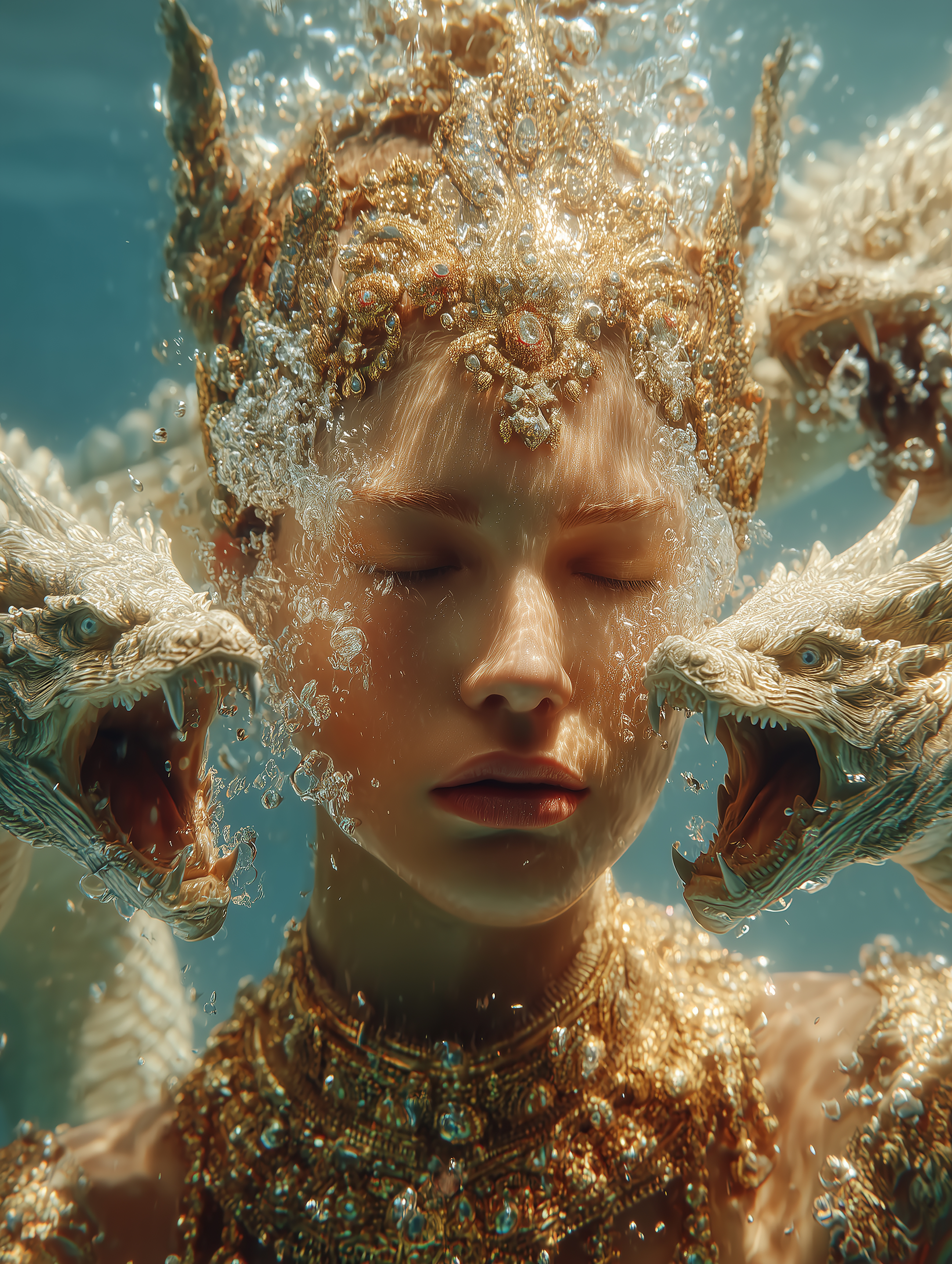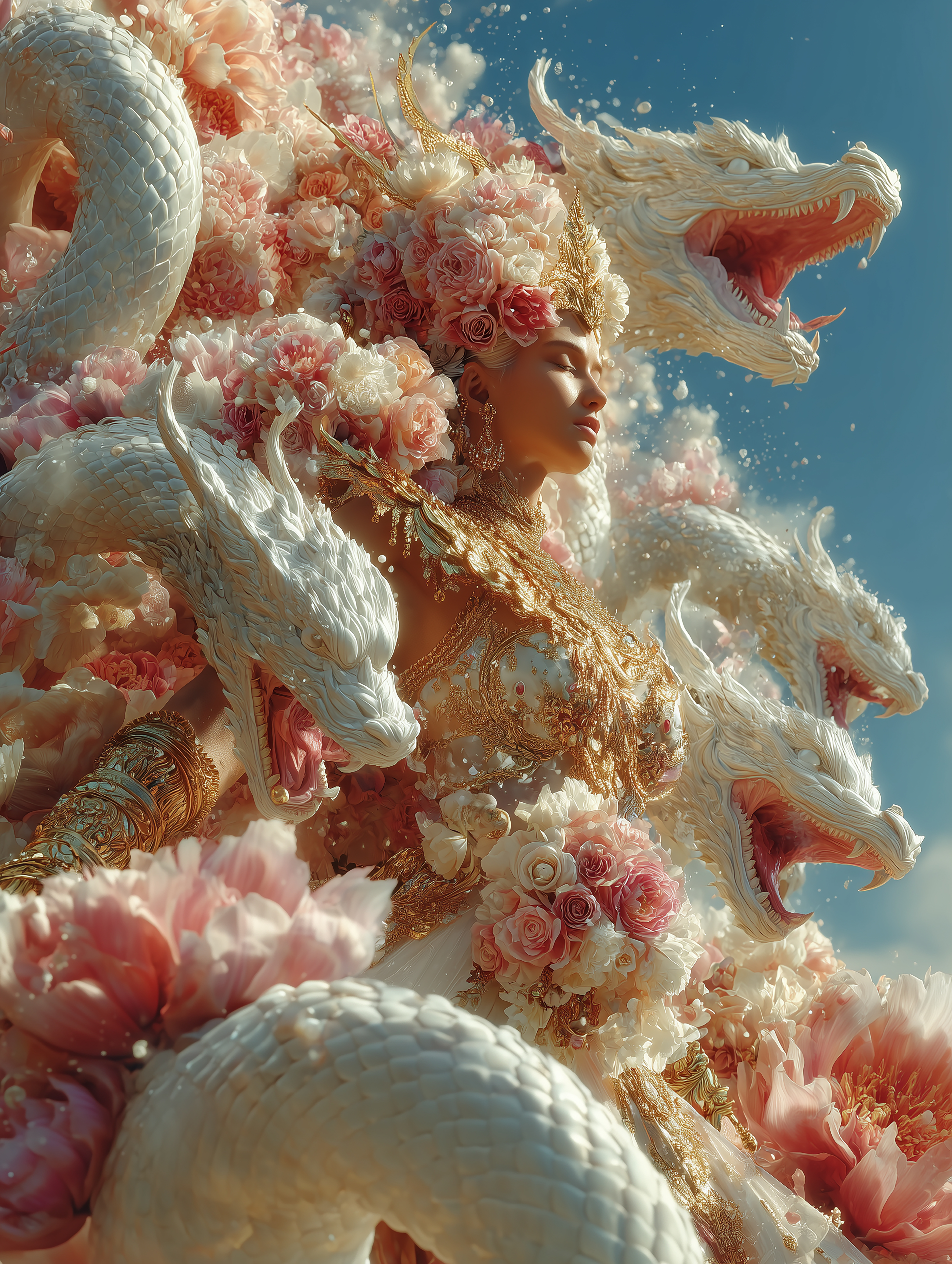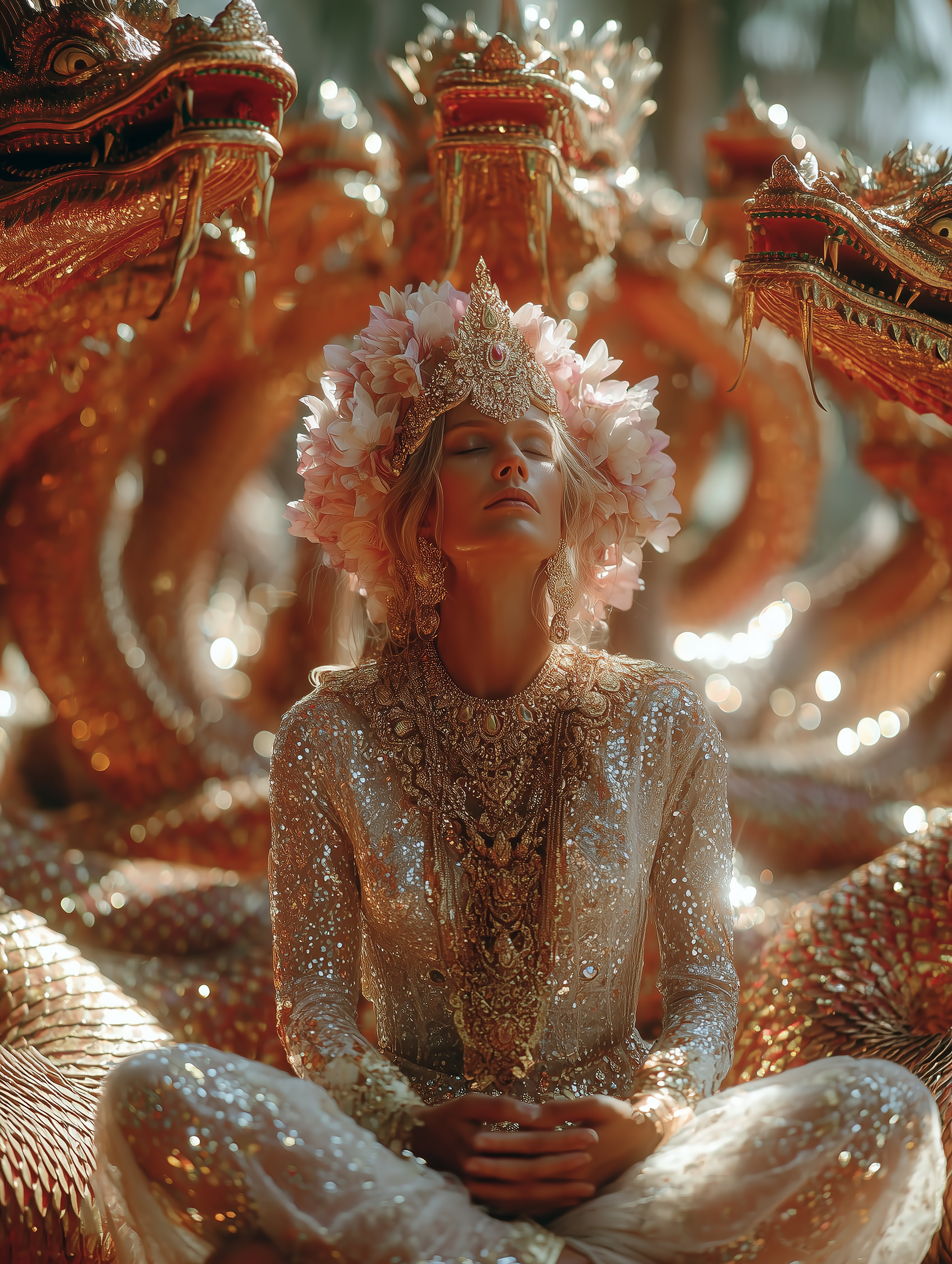 My work reimagines the journey of a Naga princess who devotes herself to ascetic practice and spiritual transformation in order to ascend into the human realm. This narrative is woven into visuals that merge mythology with high fashion, portraying the divine feminine not only as a cultural symbol but also as a modern icon of strength, beauty, and luxury.
