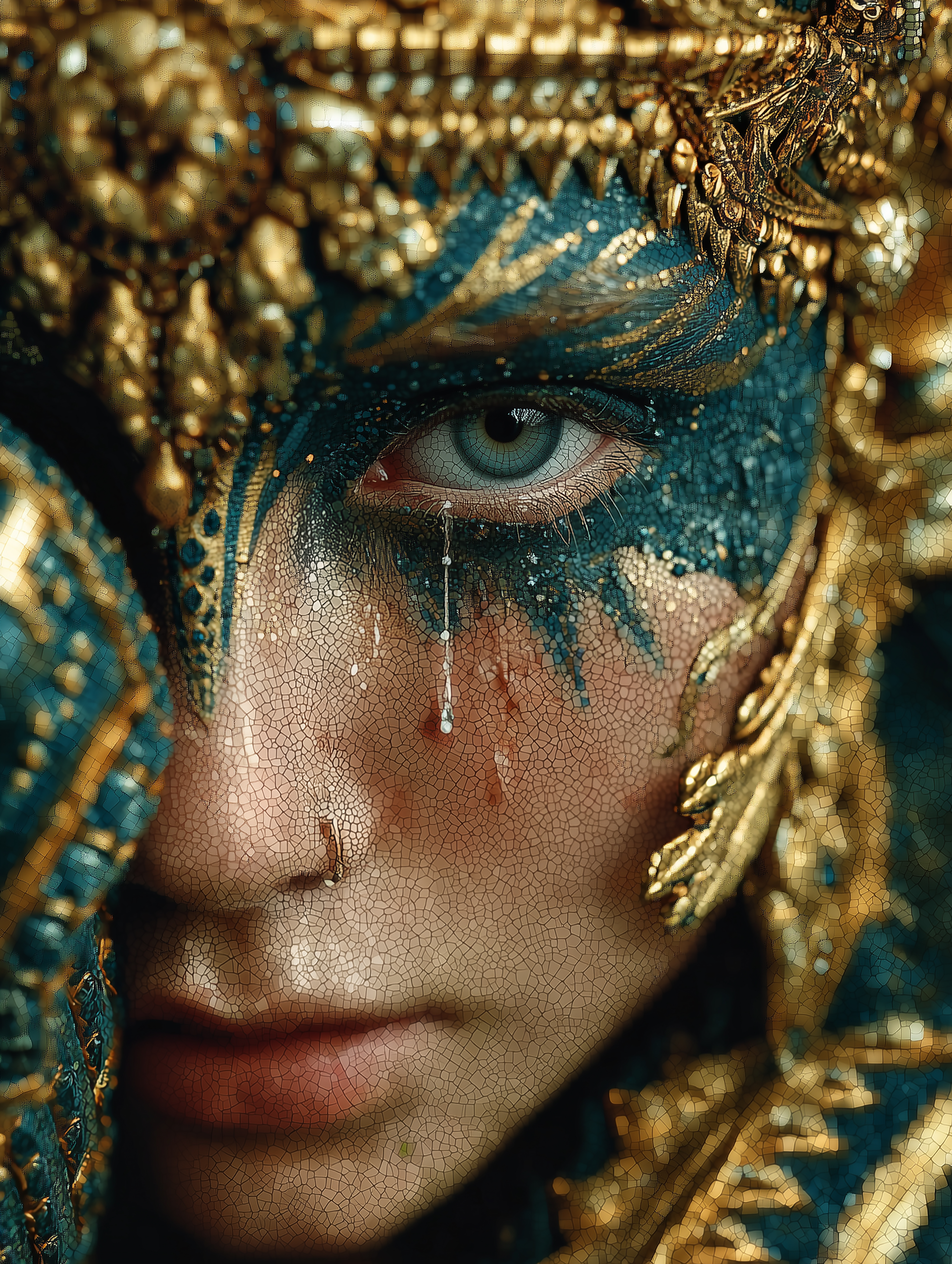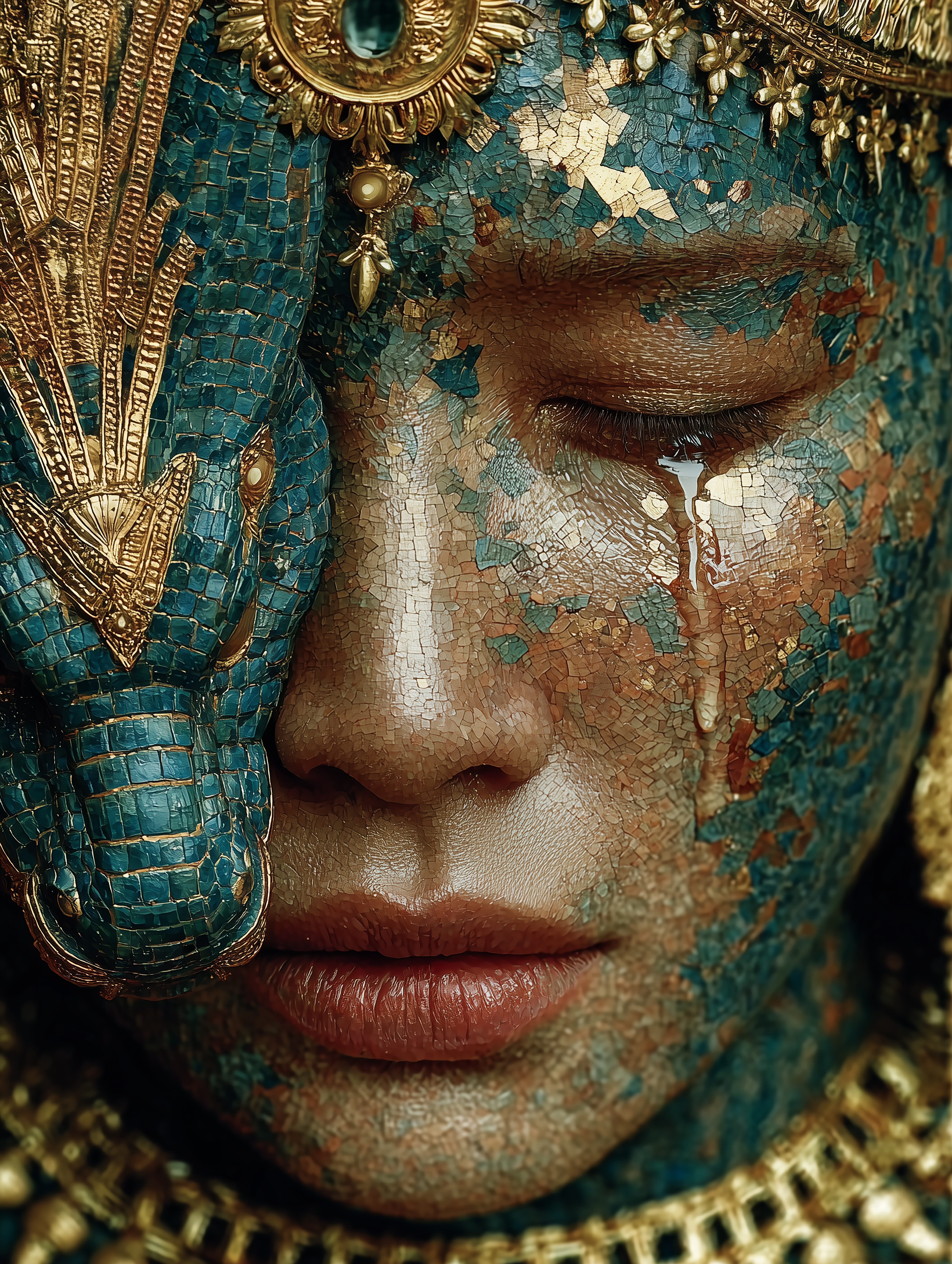 Through the language of gold and turquoise, of mosaic and tear, the piece reflects an eternal truth — that even divinity weeps in the shadow of impermanence.